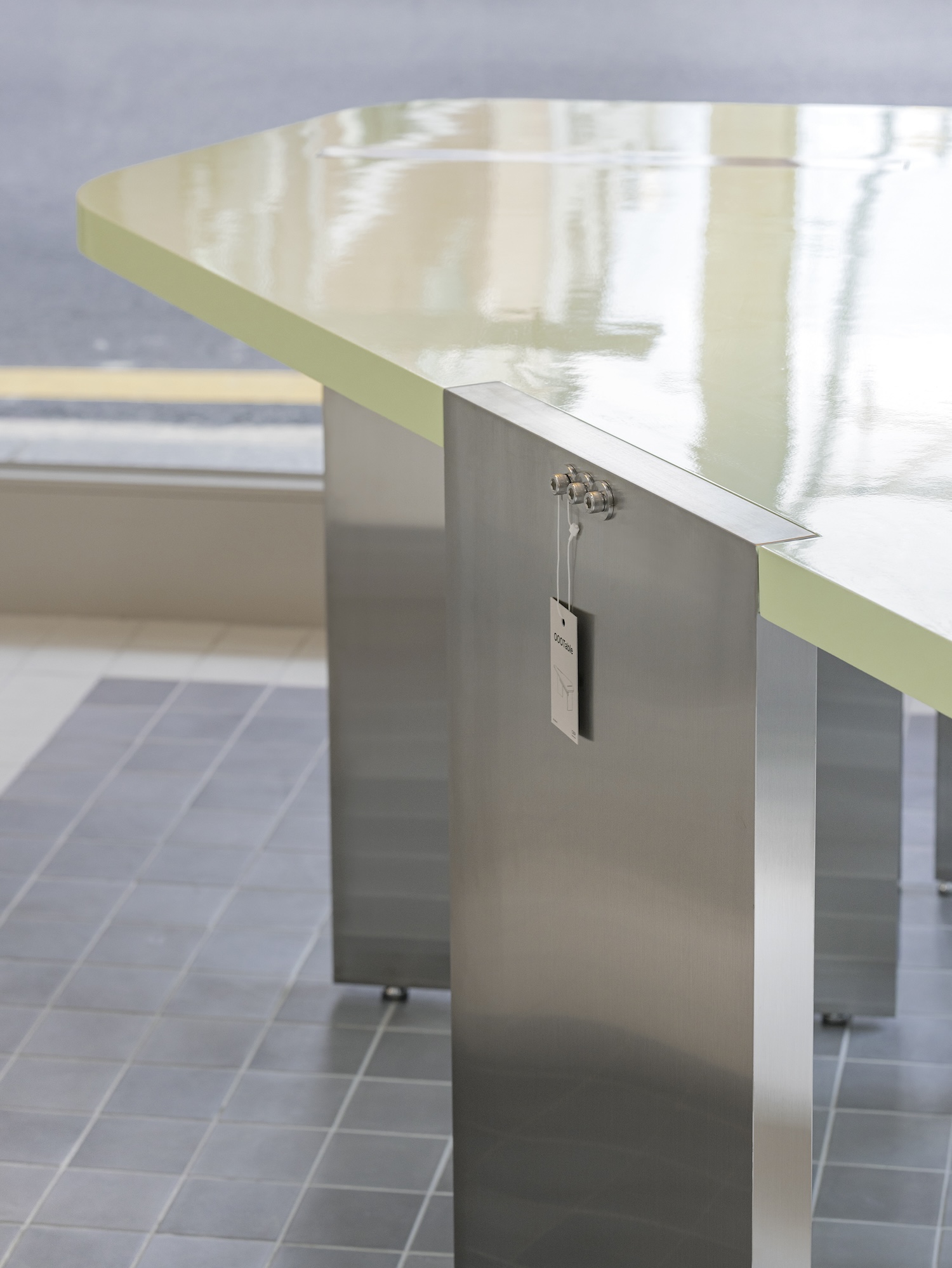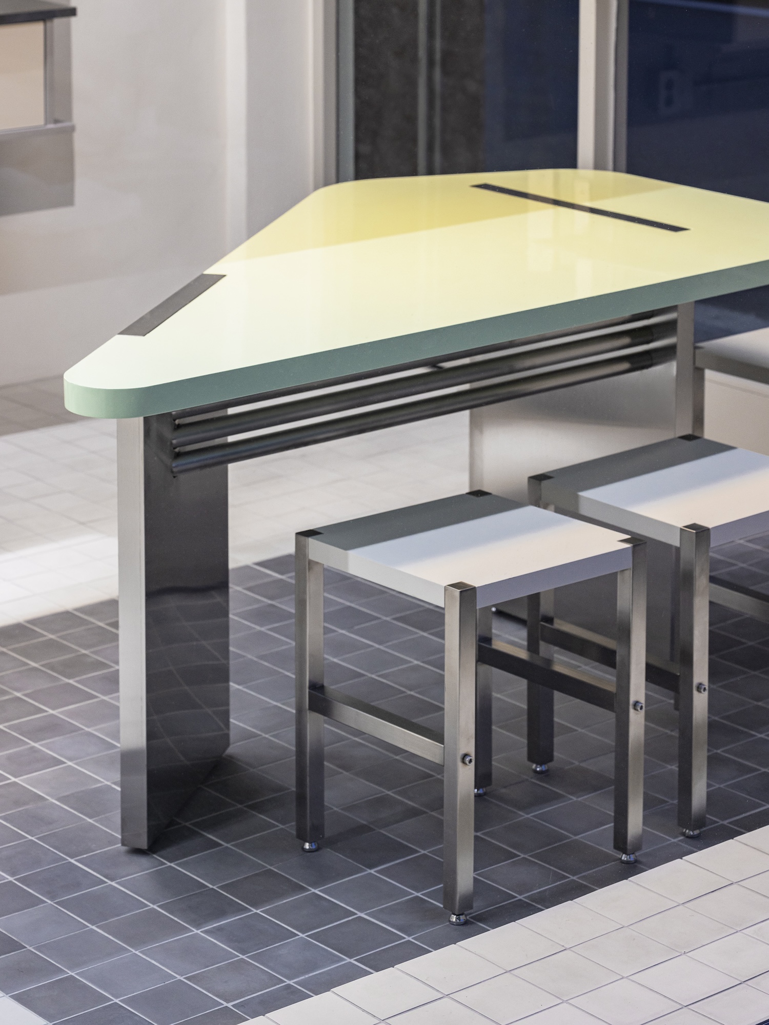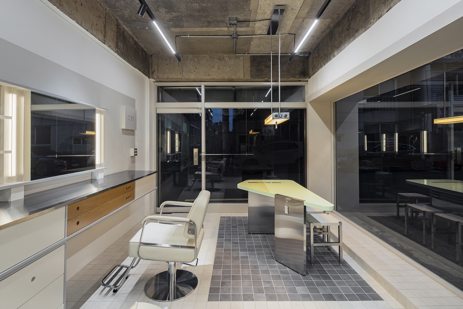 Its shape and positioning near the facade make it a visual focal point, while an accompanying pendant light emphasizes the playful deception of the space’s identity. In the hair and makeup area, a custom-built dressing table integrates a counter and dual mirrors into a single piece of furniture. Horizontal lines and the use of wood and acrylic soften the stainless steel countertop, creating a comfortable yet modern environment. At the back of the space, a multifunctional cabinet serves the eyelash treatment area. It acts as a divider, sink, and storage space, cleverly separating the makeup services from the more private eyelash treatments.