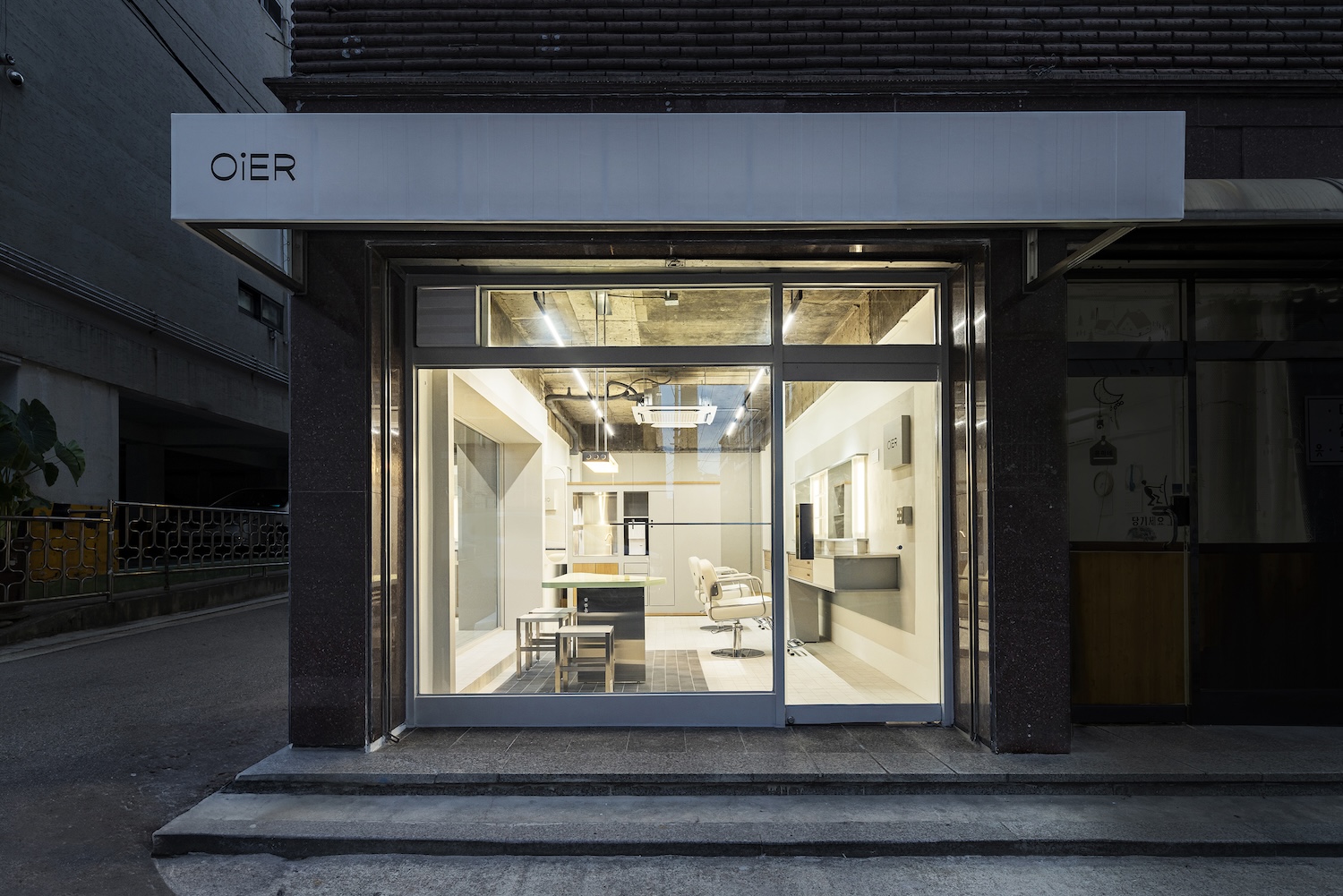 OiER is a minimalist space located in Seoul, South Korea, designed by Plainoddity. From the exterior, OiER resembles a minimalist showroom, drawing in passersby with its clean, streamlined design and understated signage. However, inside, the shop provides an intimate setting for makeup services, challenging traditional ideas of how a beauty space should function and look. A notable design element throughout the shop is the use of the Korean consonants derived from the name OiER. These simple forms are integrated into the handles, hardware, and other details of the furniture, creating the illusion that all pieces are part of a single brand collection.