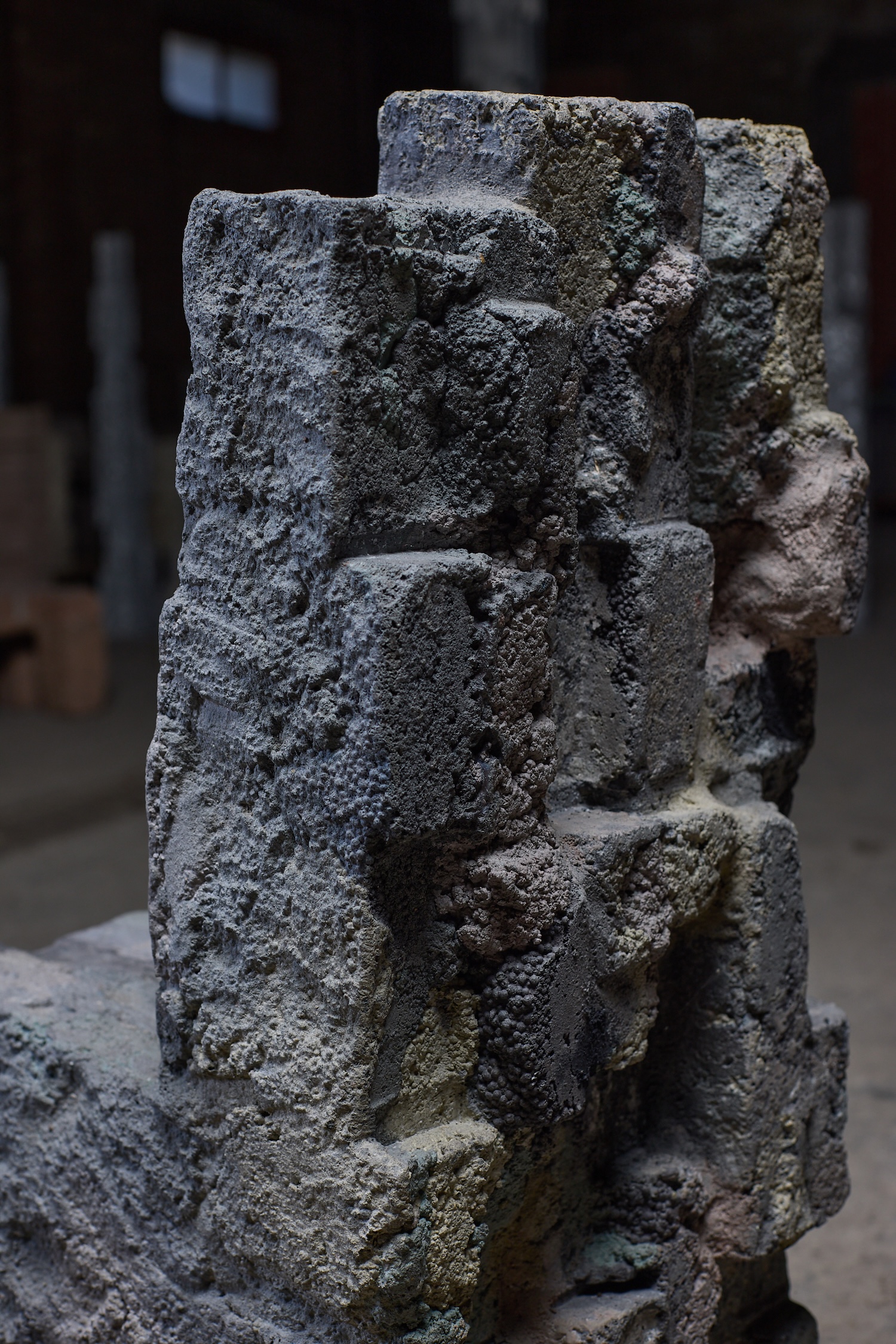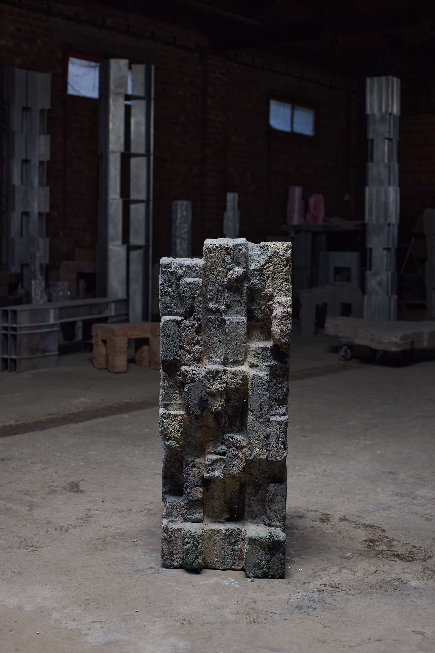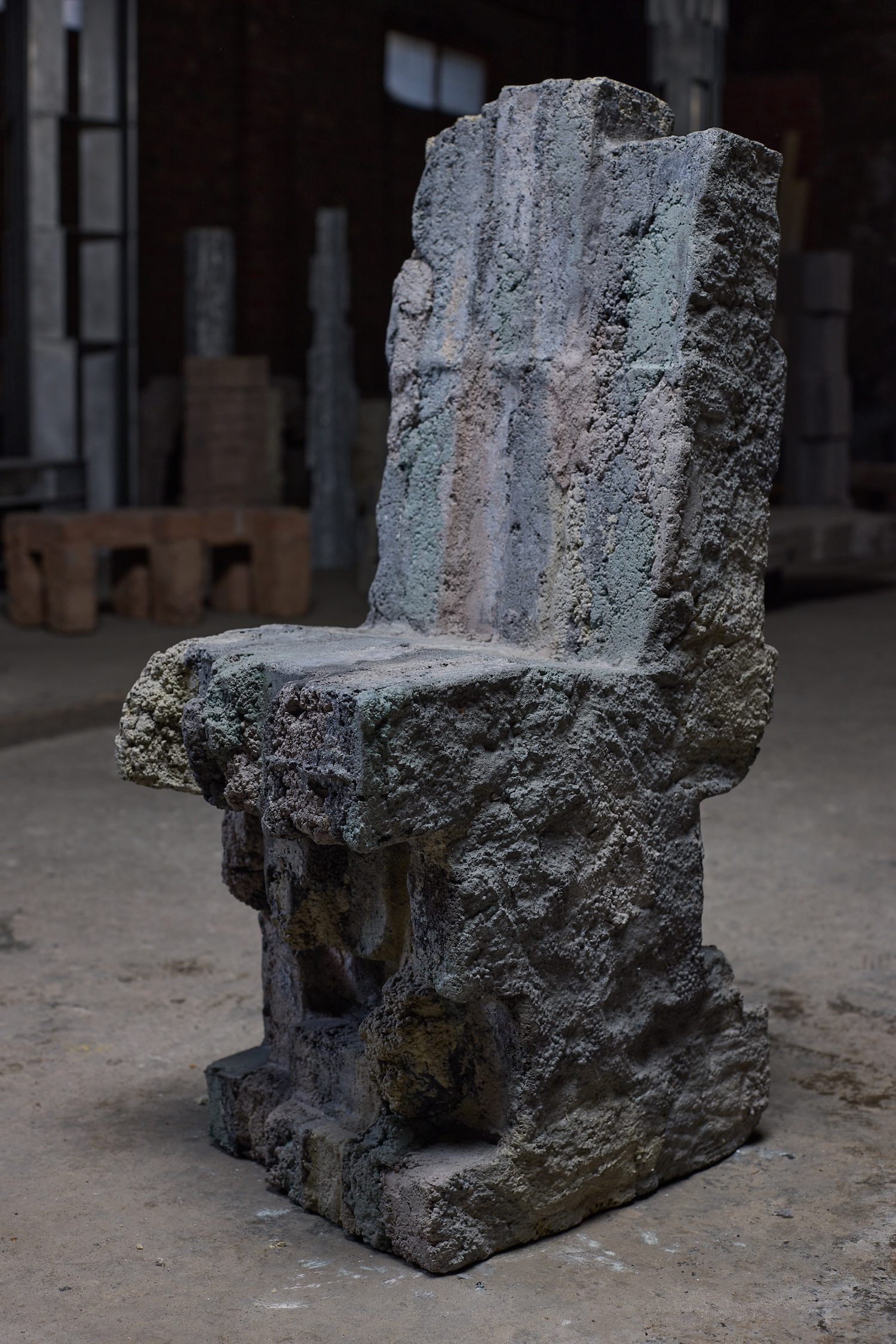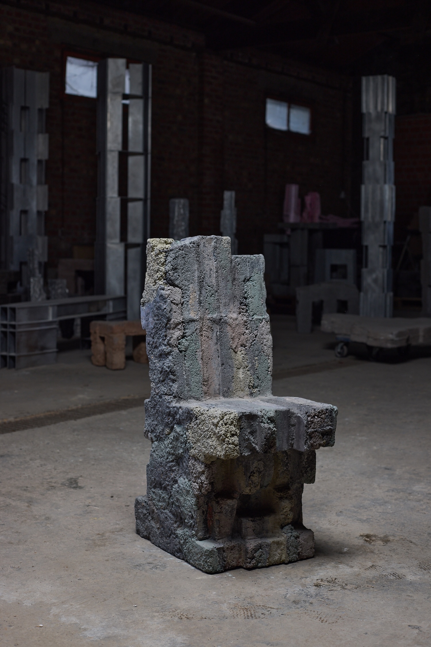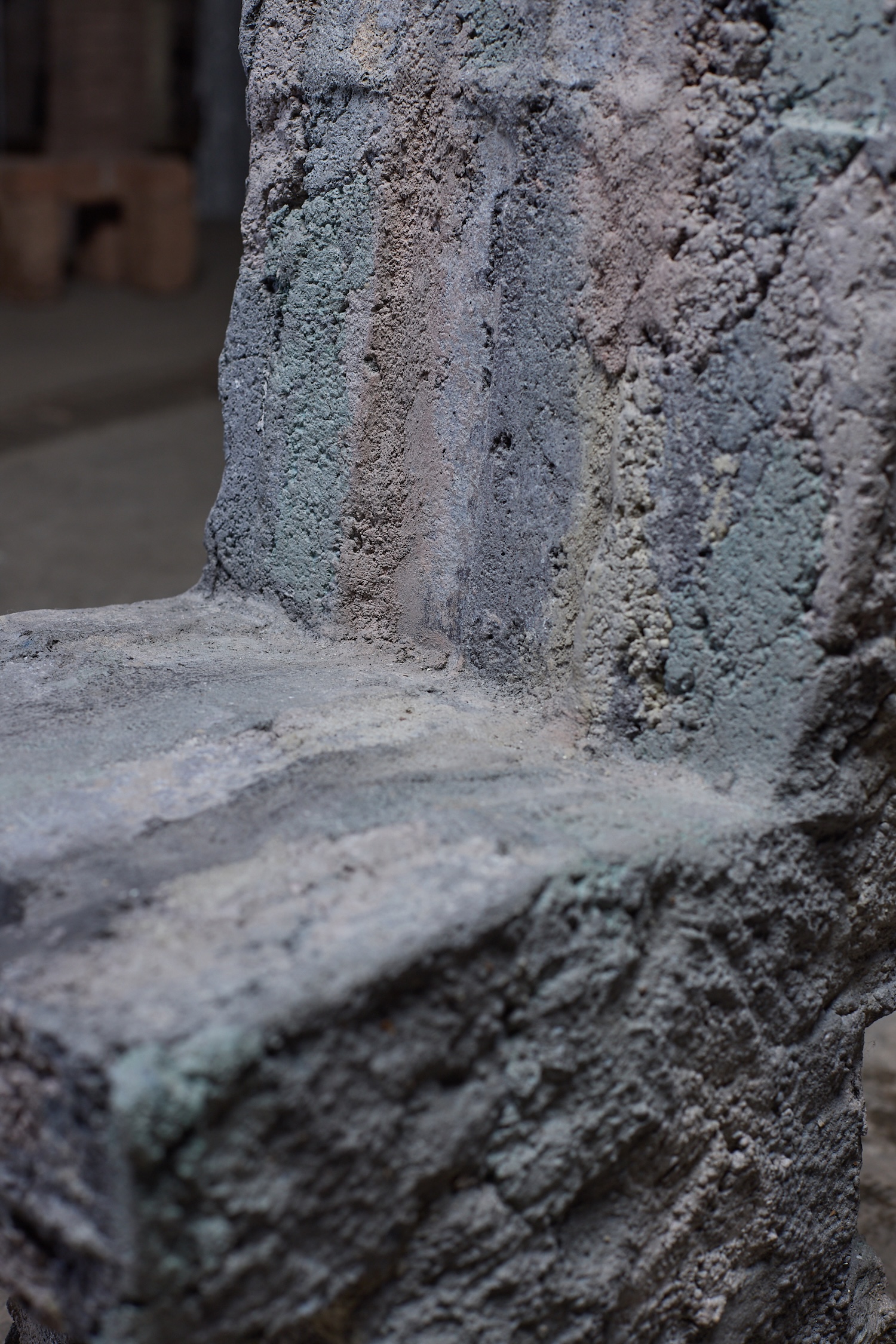 The resulting pieces—benches, stools, side tables, and pedestals—bear the unmistakable imprint of their brick origins. Each object carries the texture and rhythm of its mold, with grainy surfaces and prominent seams that chronicle the casting process. Rather than polish away these marks of making, Vanderbeke celebrates them, embracing what he describes as a “primitivistic aesthetic” that reveals rather than conceals the object’s creation.