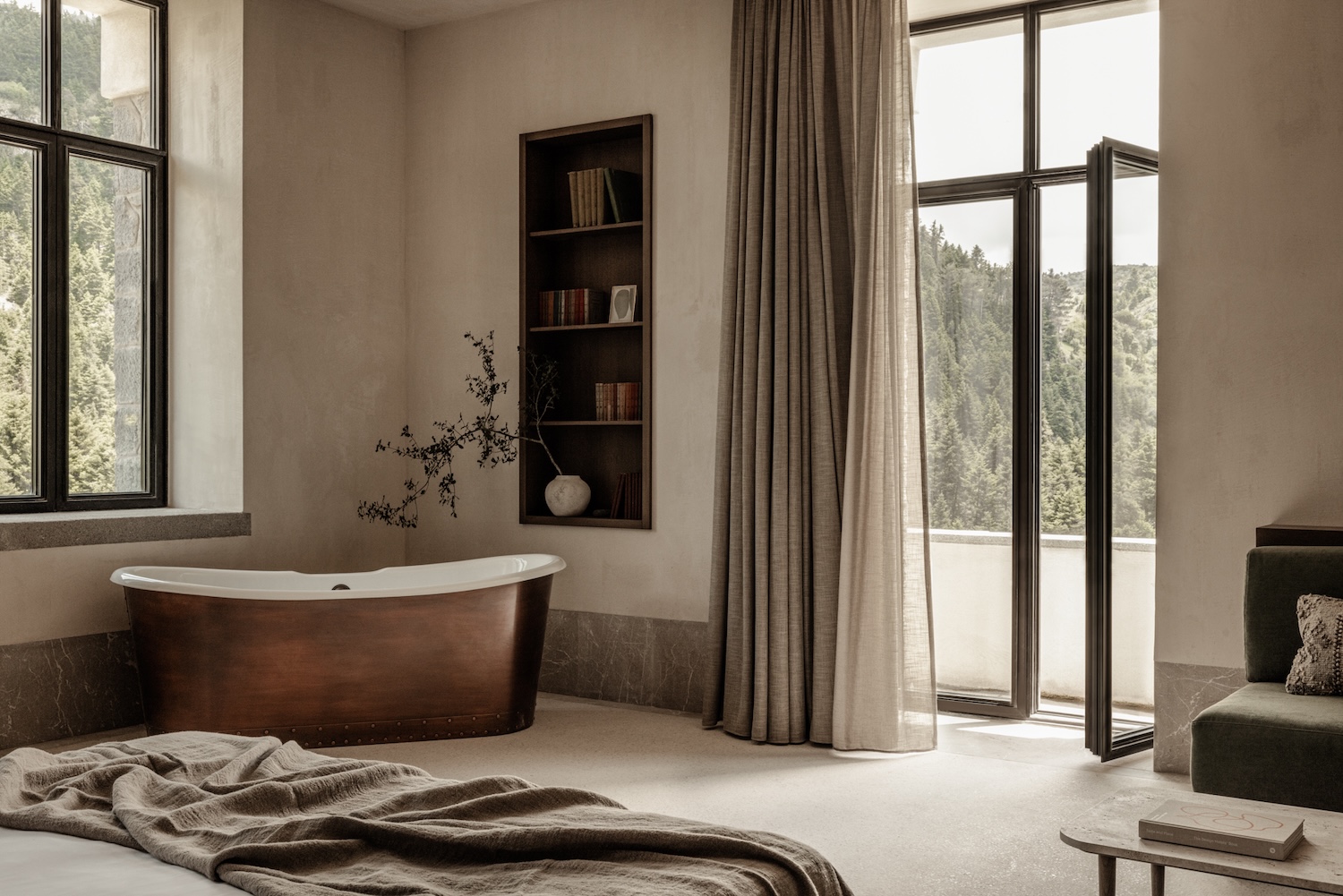The 32 individually designed guestrooms including six suites establish light, airy qualities through preserved ceiling heights complemented by balconies and terraces offering mountain views. Terrazzo and marble flooring with brushed timber patterns combine with artwork by Greek painter Nikos Kanoglou, Belgian painter Joanna Burtenshaw, and French sculptor Diane Alexandre. Lighting design by Eleftheria Deko, who created the acclaimed Acropolis lighting, establishes natural ambiance while bathrooms feature rain showers with sustainable amenities and copper soaking tubs in suites.