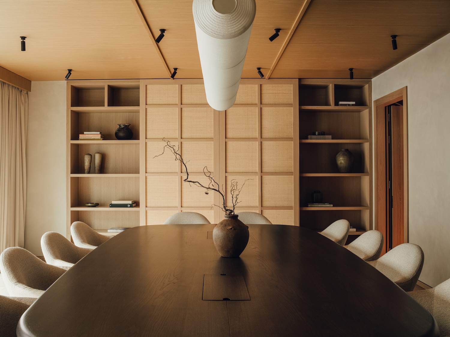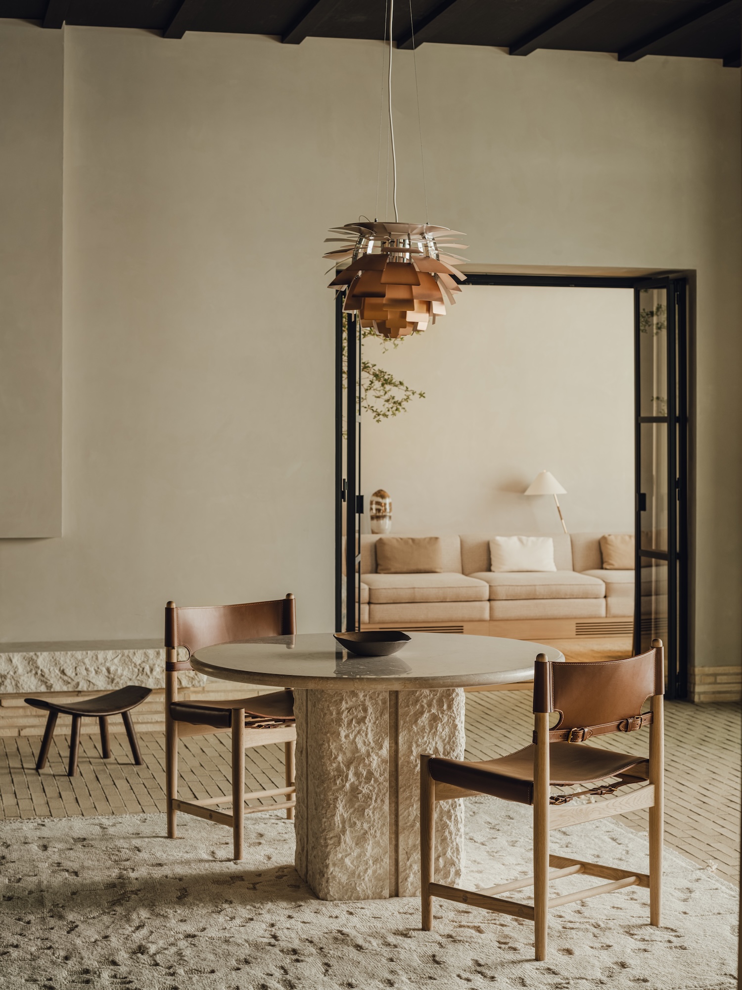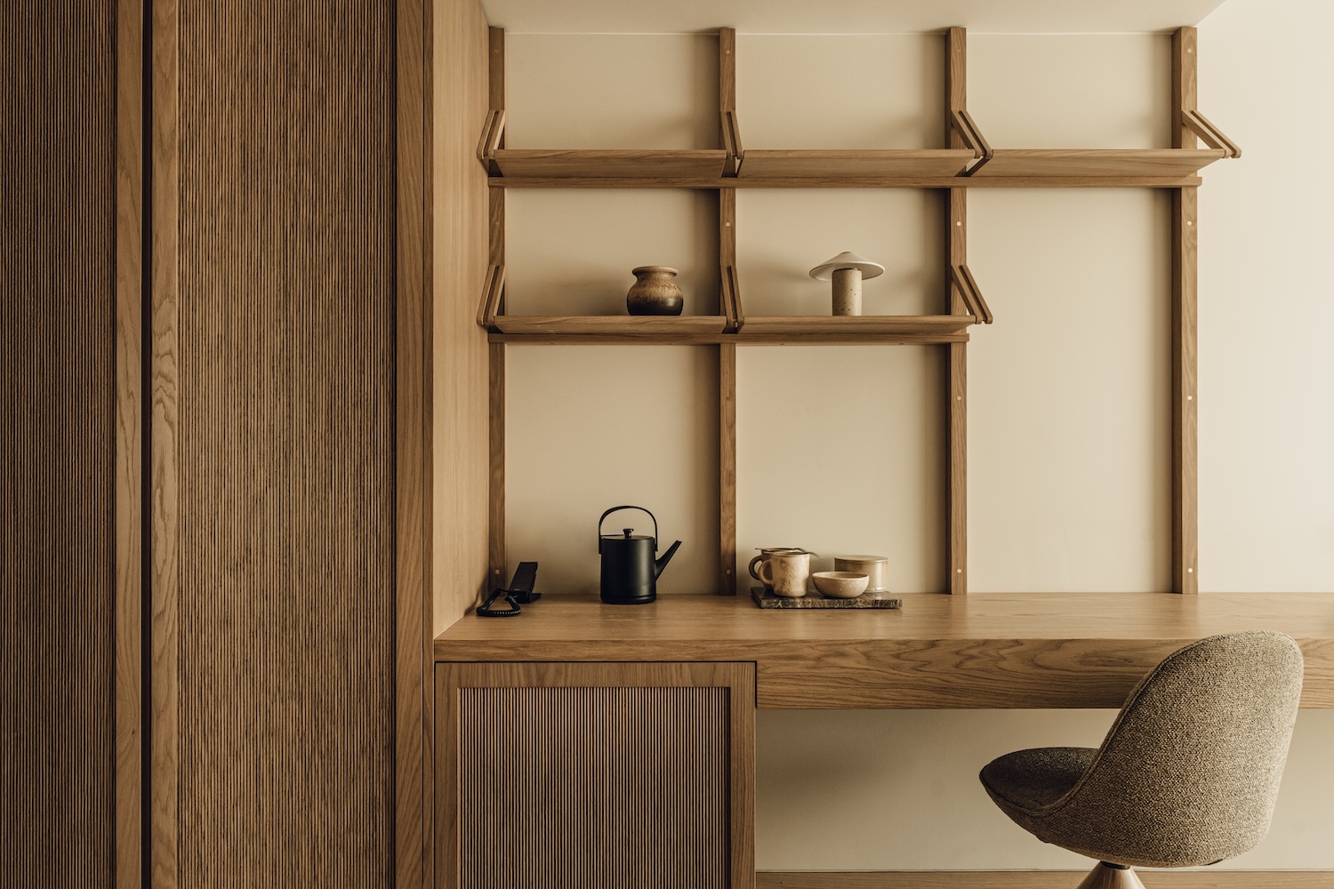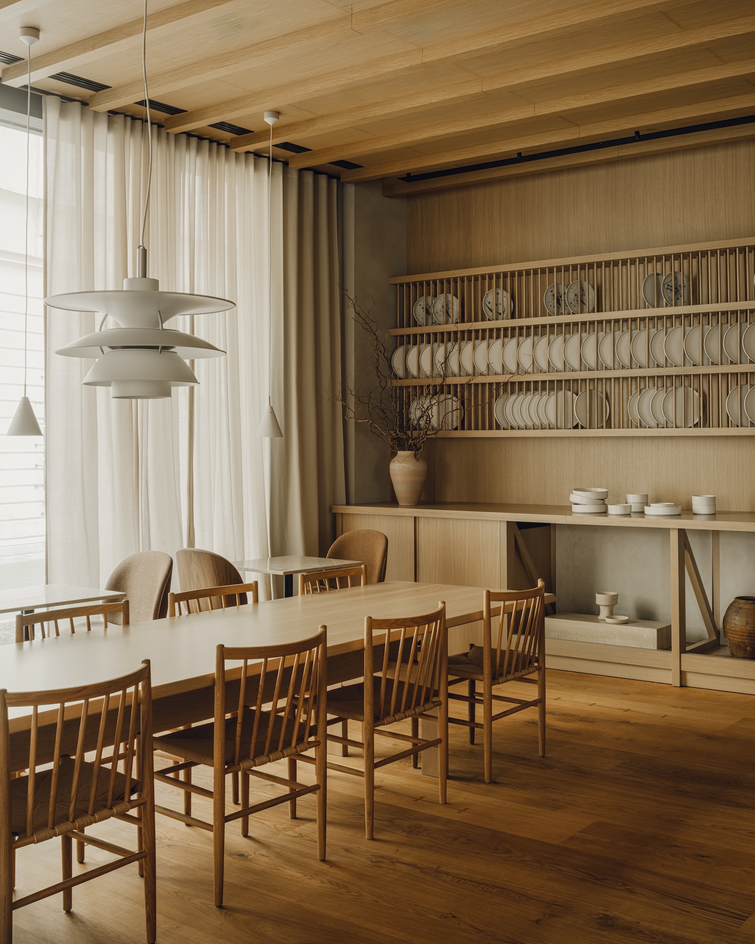In the 192 guest rooms, GamFratesi curates Scandinavian design heritage alongside contemporary production. Pieces from Gubi, Louis Poulsen, Fredericia, and Carl Hansen & Son establish lineage to mid-century Nordic modernism, while Koyori ceramics introduce Japanese material sensibility. This is not eclecticism but careful assembly – each object selected for longevity and tactile quality rather than stylistic coherence. Linen robes, Boreal cosmetics, and studio-designed ceramics extend the material narrative into daily ritual.