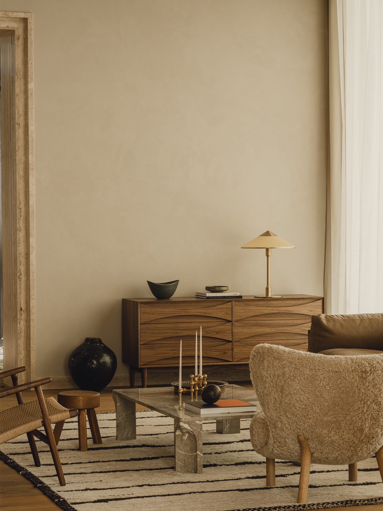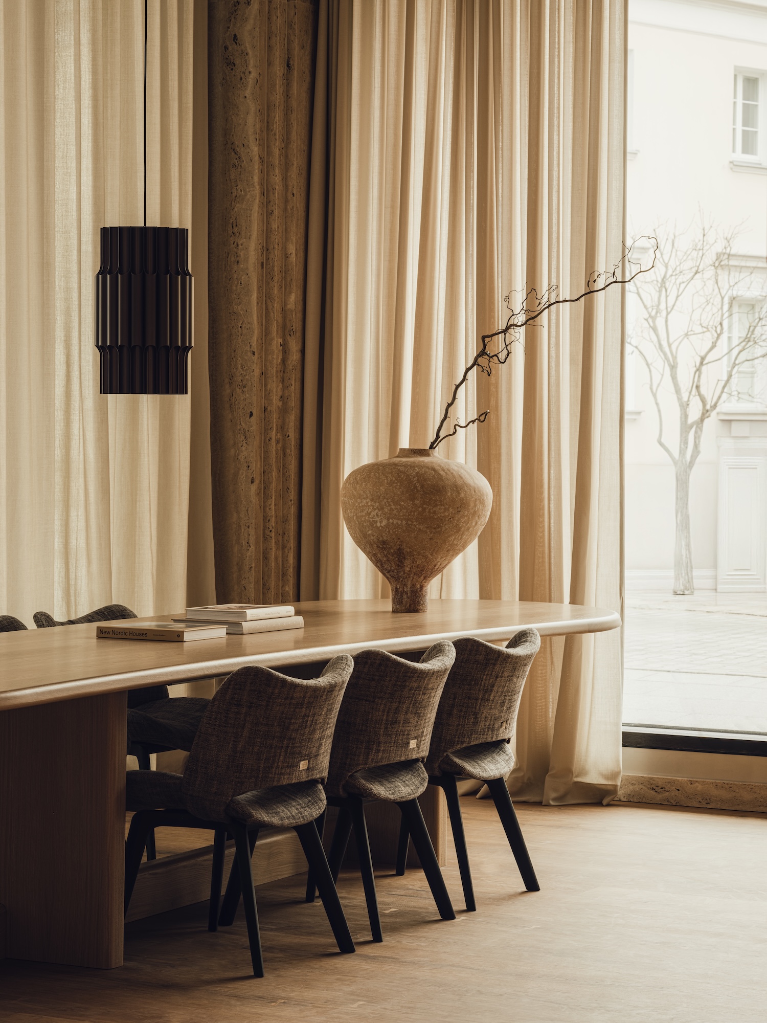 Material selection anchors the Nordic vocabulary in physical presence. Travertine stone surfaces carry visual weight without opulence, their sedimentary layering suggesting geological rather than decorative time. Custom furniture pieces – stone side tables, specially designed armchairs – occupy space with sculptural confidence. The palette draws from Bellotto’s paintings: muted earth tones and softened chromatics that reference Warsaw’s reconstructed past without mimicking its architectural language.