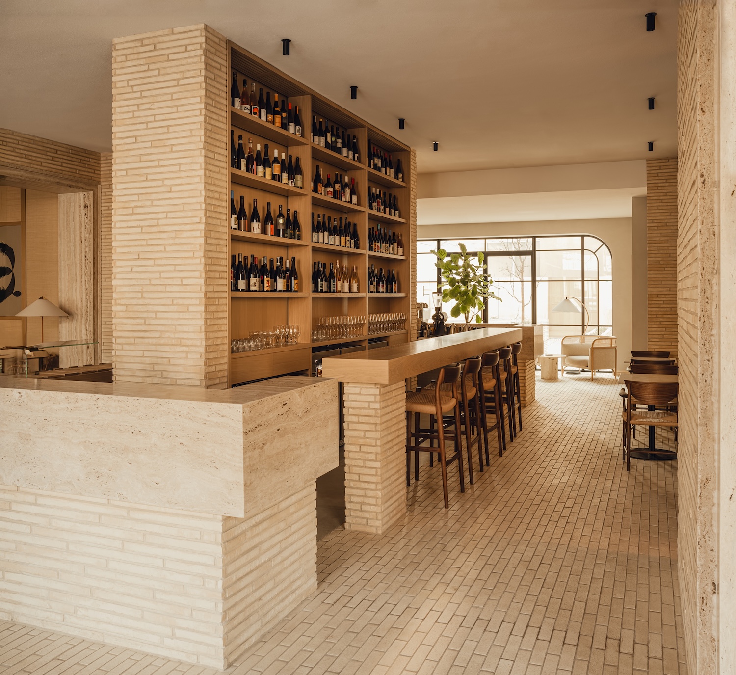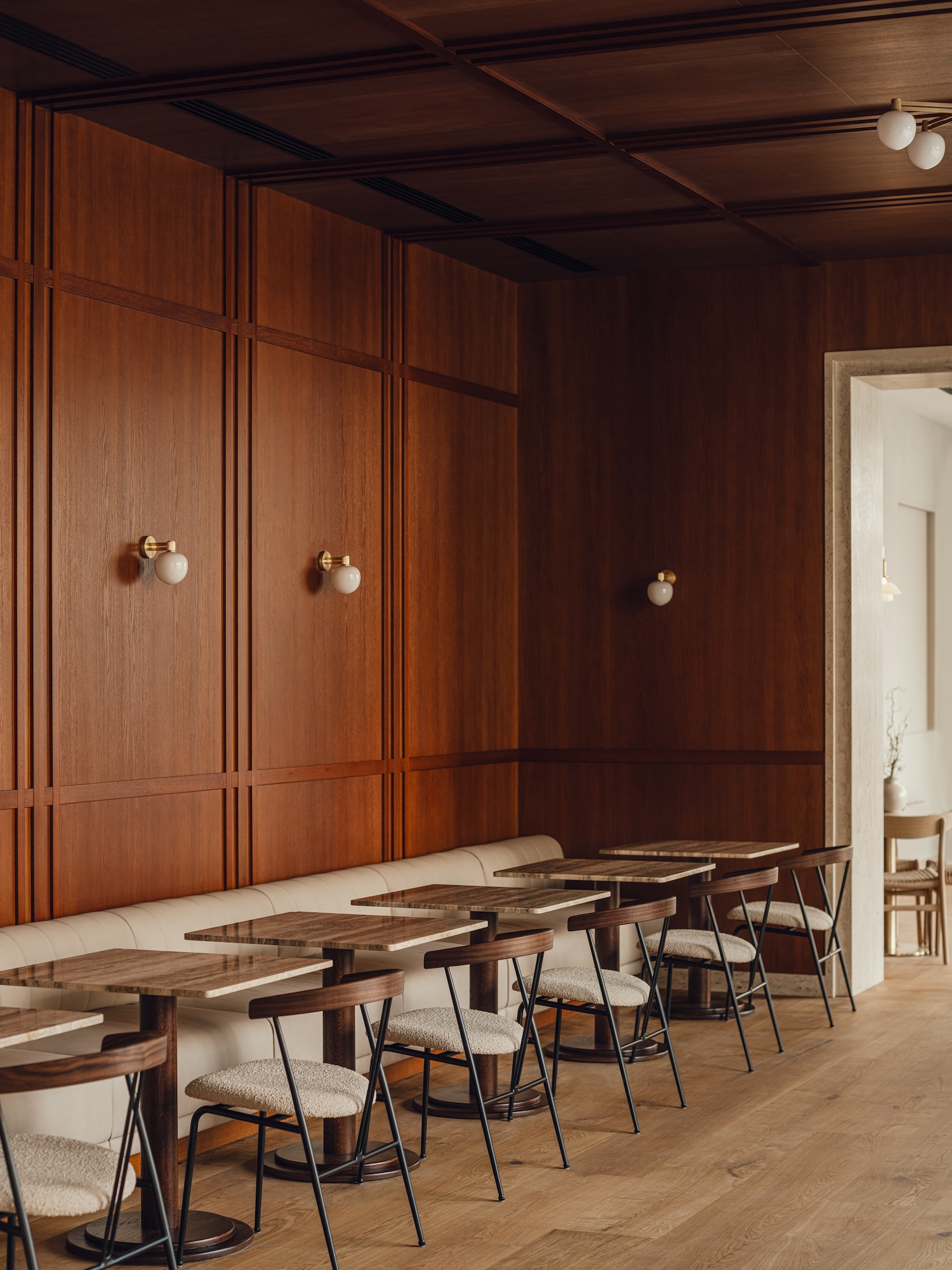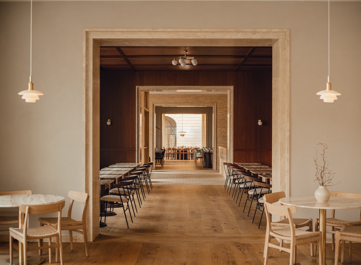The ground floor dissolves traditional hotel boundaries. MUND – named for the Scandinavian word for mouth – functions simultaneously as restaurant, bakery, wine bar, and bistro. Rather than segregating these programs, the design creates spatial ambiguity. Dinesen wood flooring establishes continuity across functional zones while custom veneered cabinetry and paneled ceilings define discrete areas without rigid separation. The layout borrows from Danish residential planning, where communal spaces flow naturally rather than announcing their transitions.