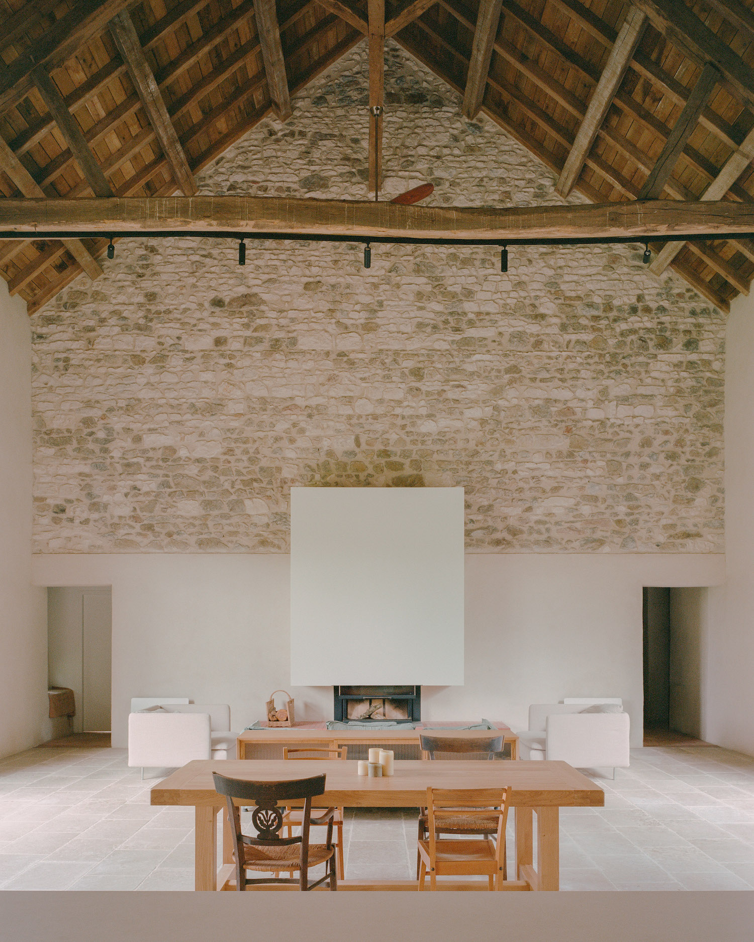 The client’s request was clear: to transform the former barn into a livable, comfortable home without erasing its character. Upon entering the structure, COVE encountered soaring stone masonry walls reaching nearly thirty feet (9 meters), a complex wooden framework, and expansive volumes that spoke to centuries of use and craftsmanship. Rather than imposing a stark intervention, the studio approached the renovation with restraint.