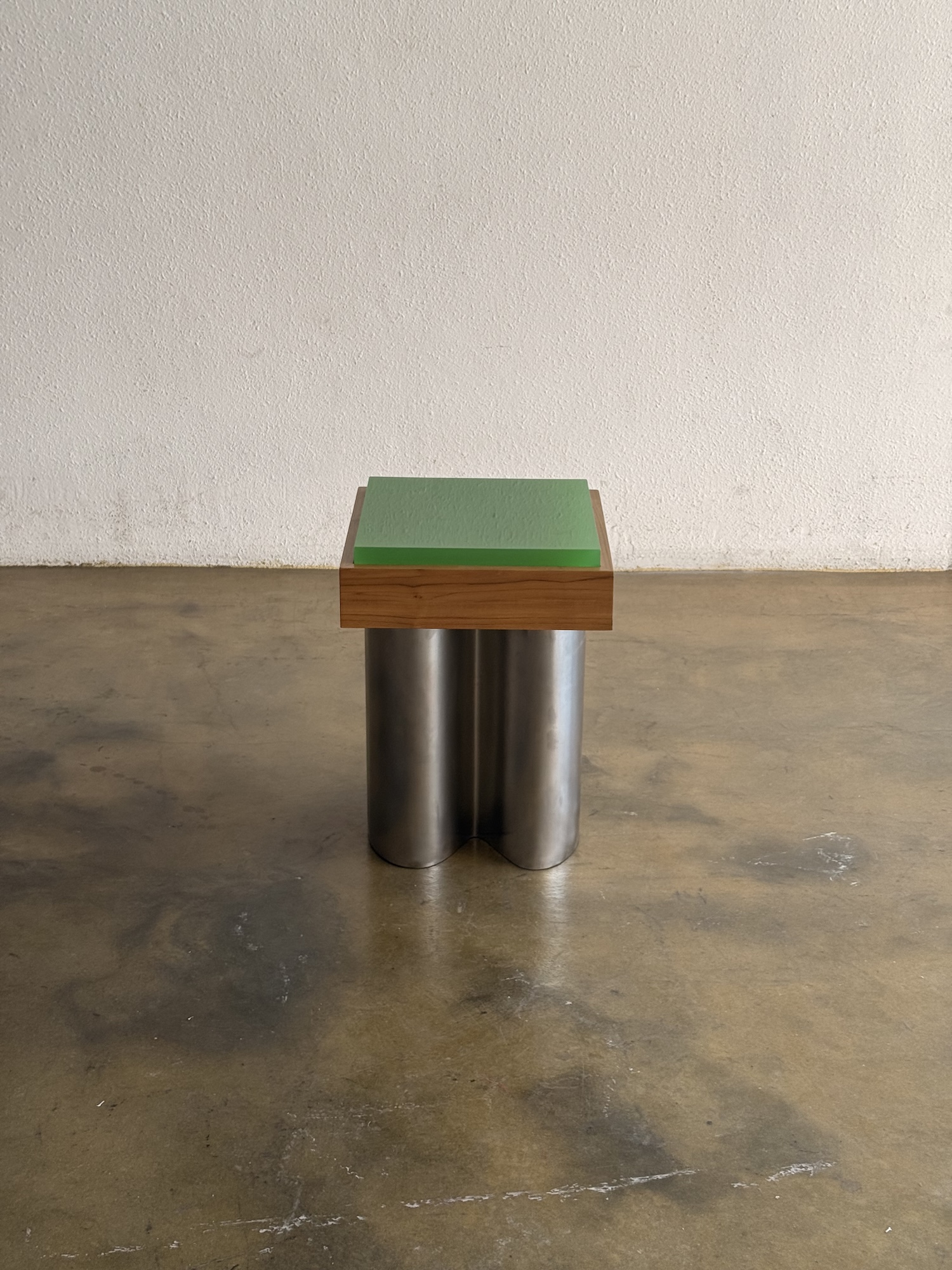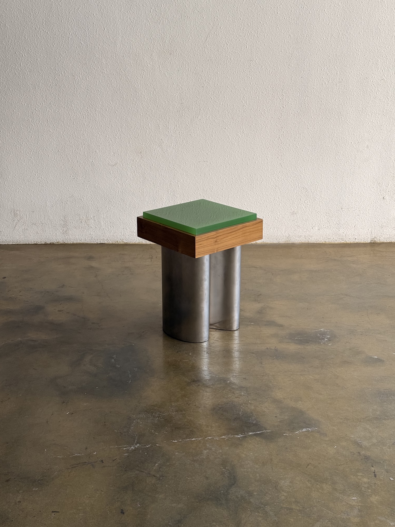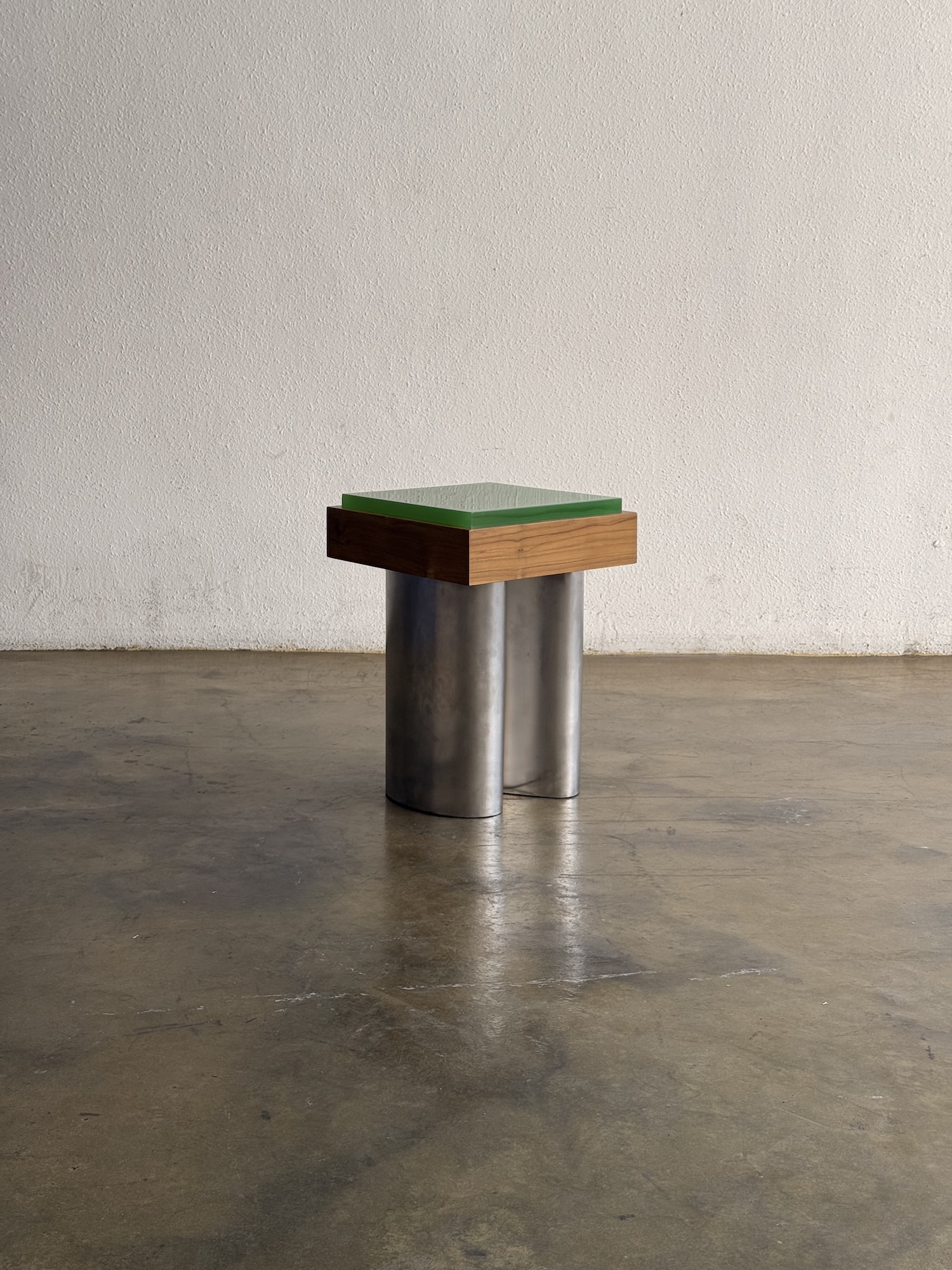 Stainless steel provides structural counterpoint. Its hard reflectivity creates contrast against the warmth of the resin and teak, and the material’s industrial associations are deliberately left intact rather than softened. The combination recalls the strategies of designers like Naoto Fukasawa or the early work of Established and Sons – a willingness to let dissimilar materials maintain their distinct identities within a unified composition rather than blending them into something homogeneous. The tension between materials is where the visual energy lives.