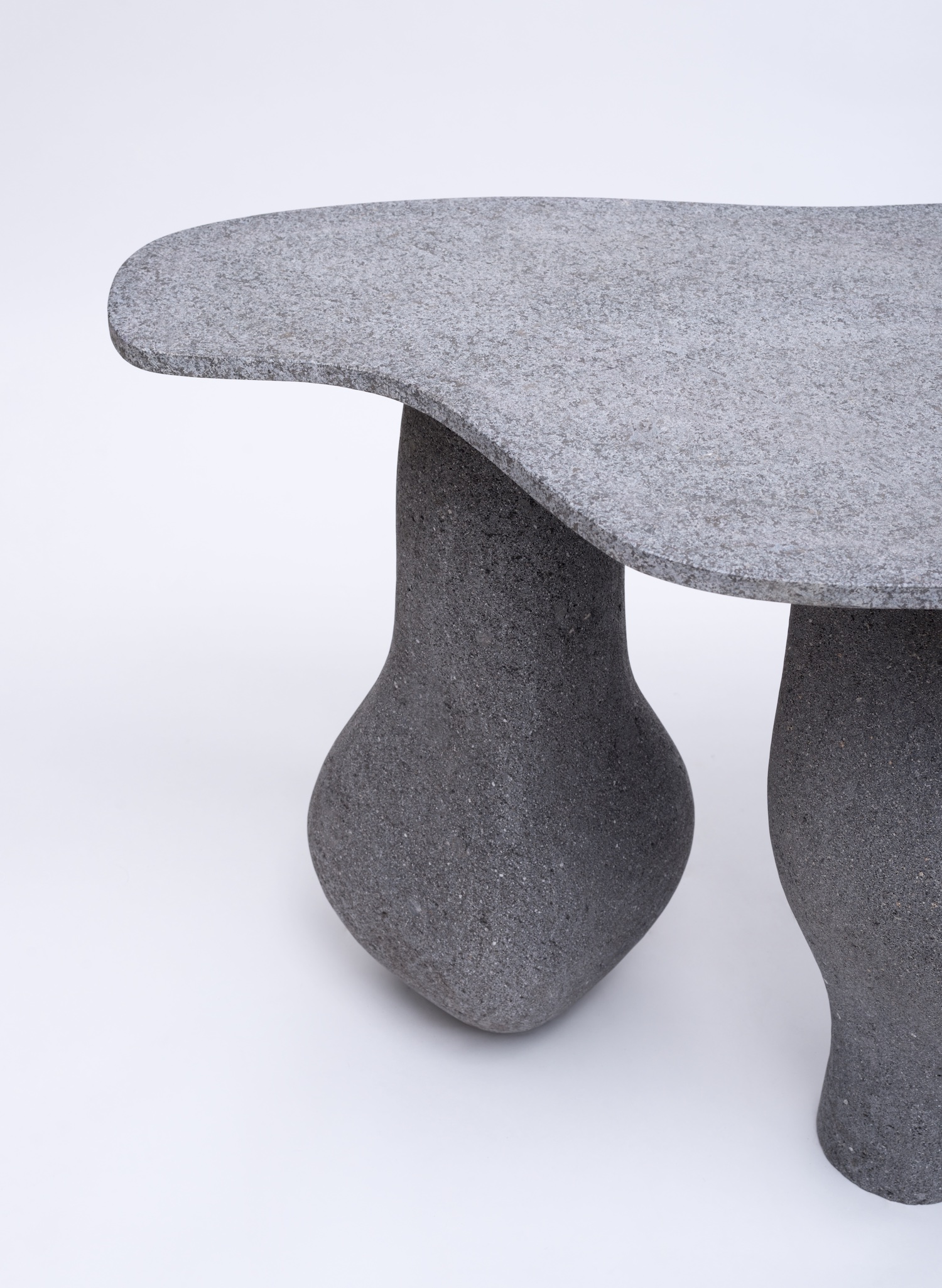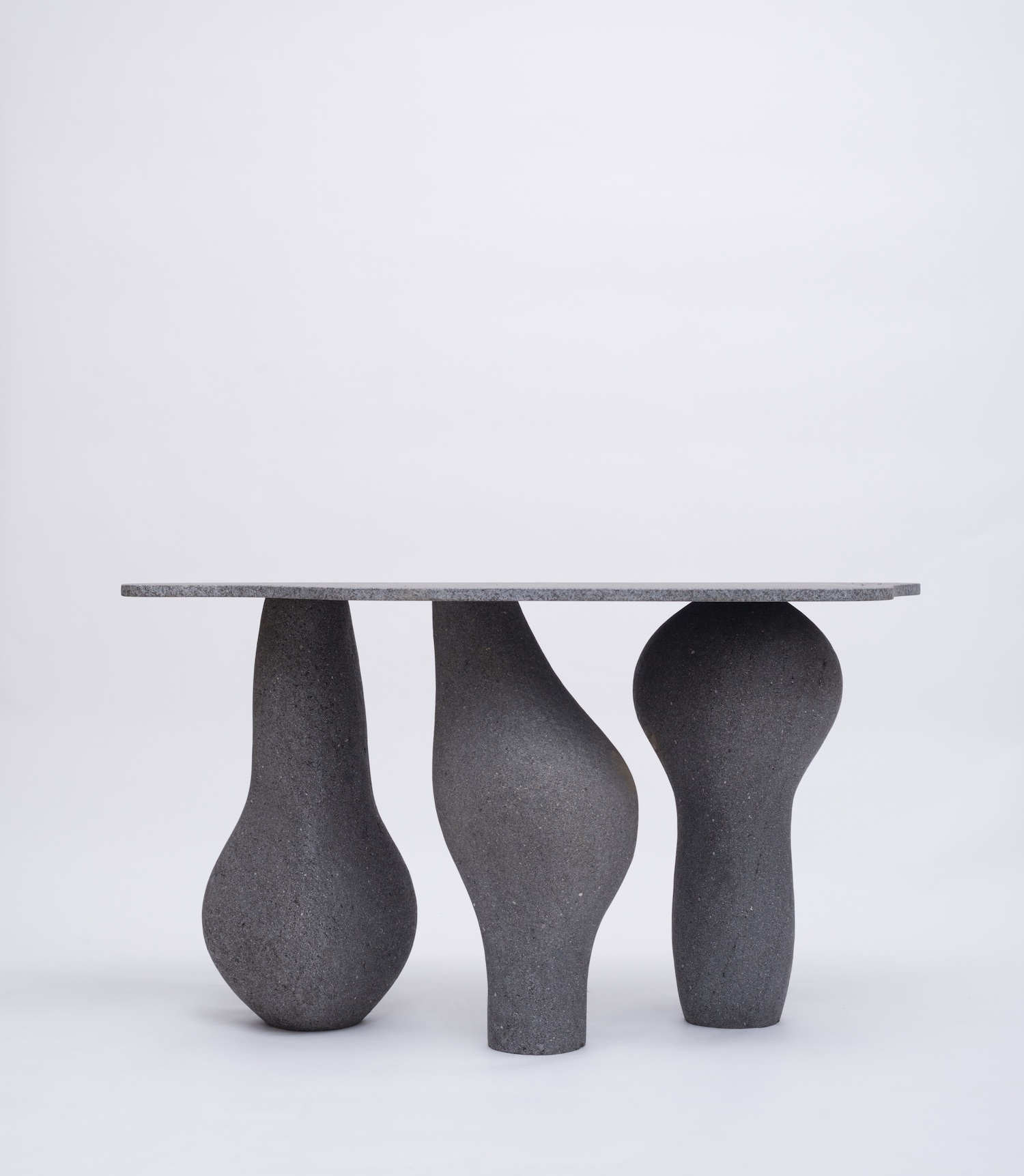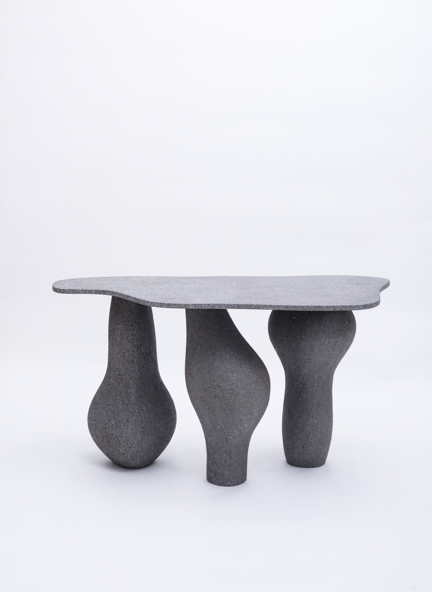Characterized by its sculptural, organic forms, the Altar Console features an asymmetrical, freeform black granite tabletop made from materials sourced from a local quarry in Guatemala and shaped in Agnes Studio’s workshop. Supporting the tabletop are a trio of bulbous, biomorphically-shaped legs that resemble ancient ceremonial objects, specially hand-carved from volcanic rock by master sculptor, Marcelino Gouz.