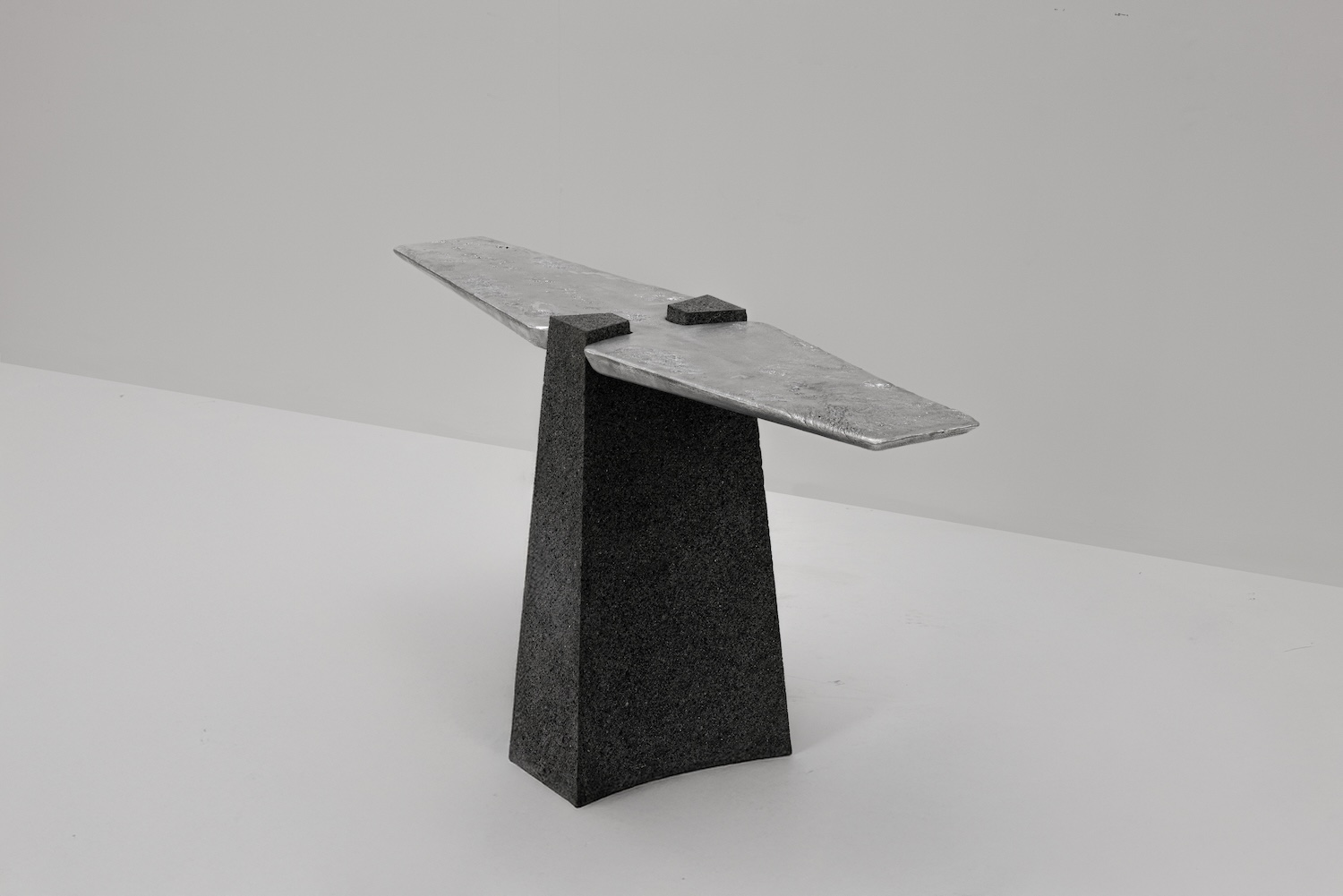 The piece reveals its deeper narrative through material dialogue. Atop a monolithic volcanic stone base – the same basalt that built the stepped pyramids called yácatas across western Mexico – rests a aluminum surface born from sand molds. This pairing speaks to the Purépecha understanding of permanence and transformation: the eternal stone anchoring the fluid metal, each material honoring its own inherent properties while serving a unified vision.