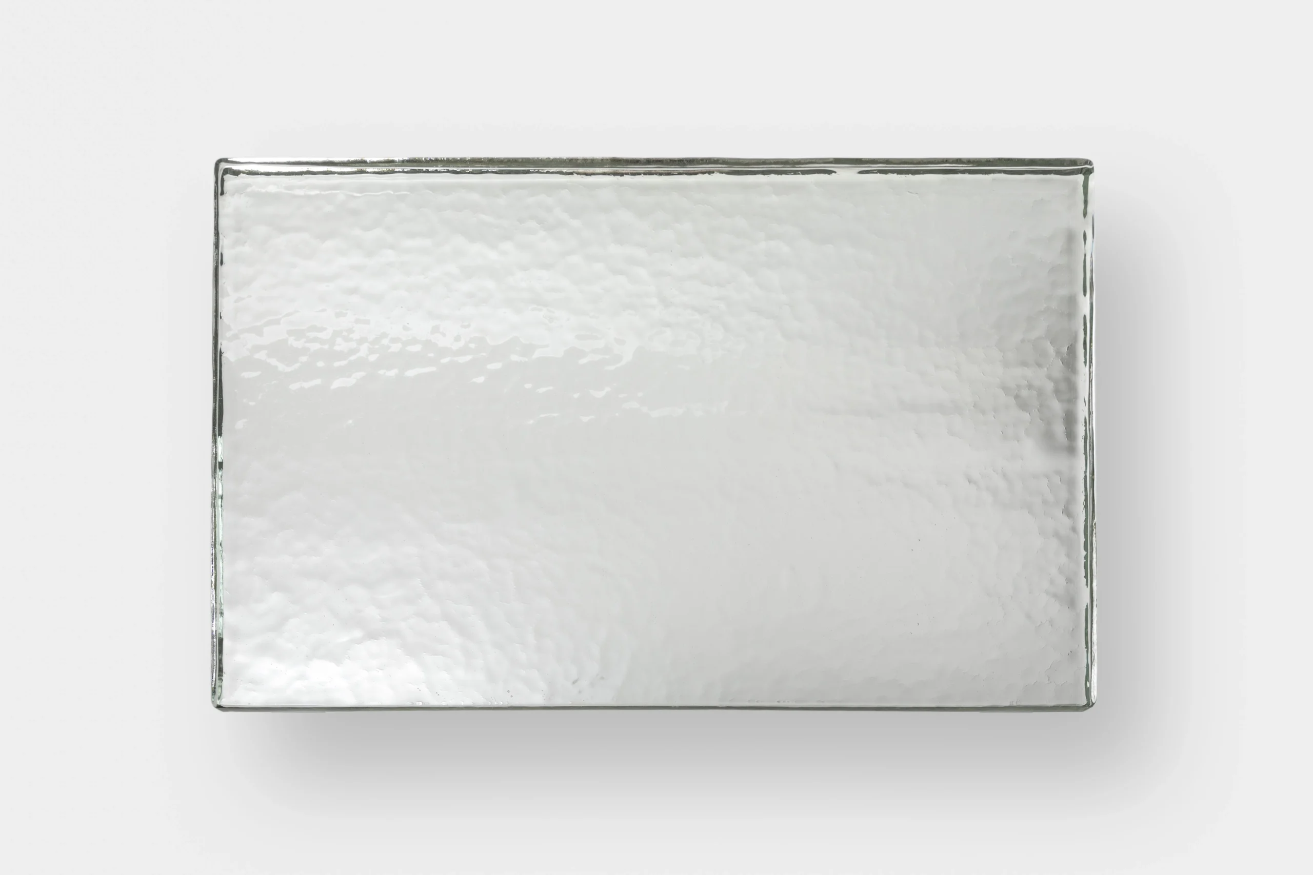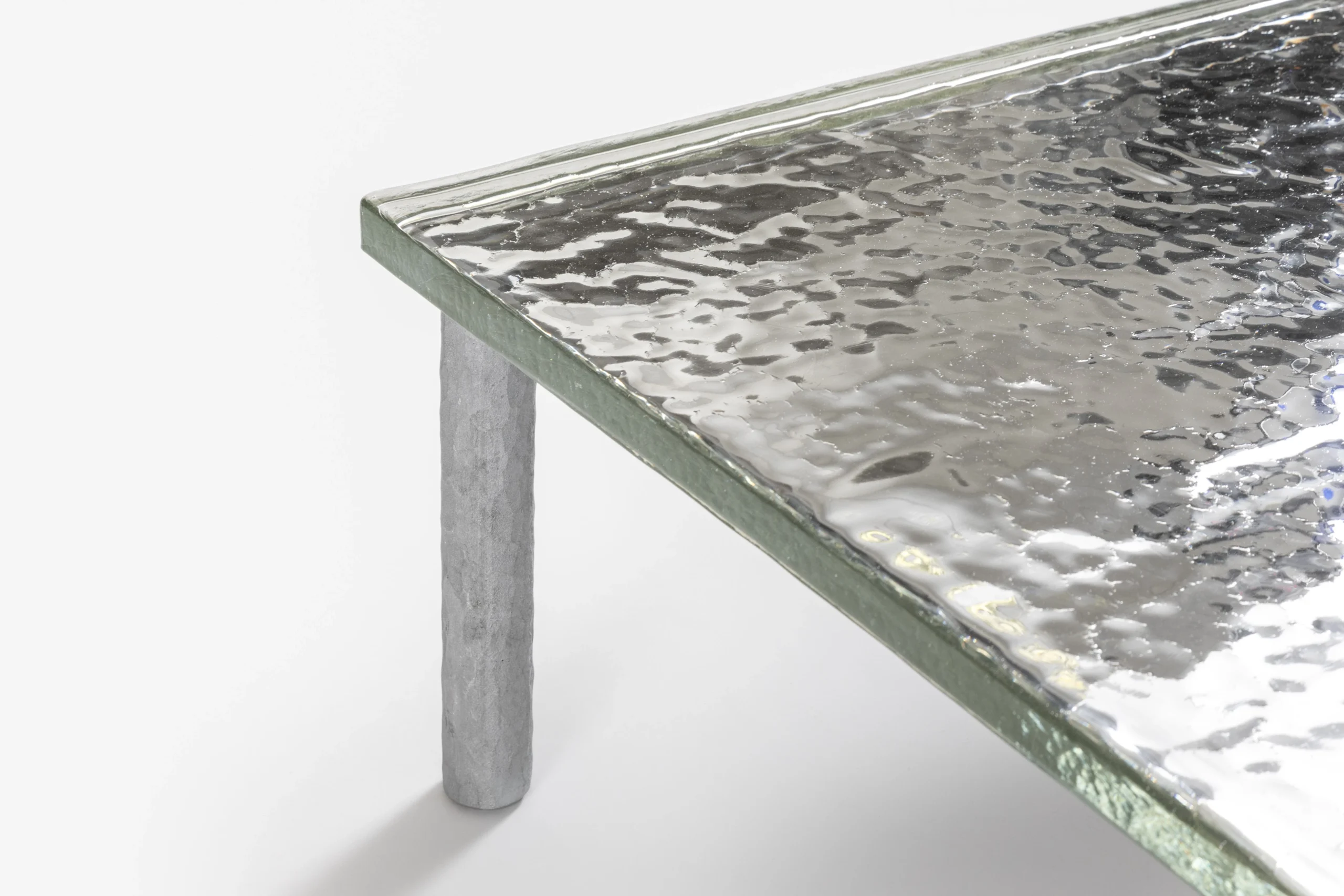 Flou Coffee Table is a minimalist coffee table conceived by Ronan Bouroullec for Galerie kreo. The Flou coffee table showcases a striking interplay of materials, pairing a silver mirrored cast glass top with a base of hammered silver metal. The glass top, with its substantial thickness, captures an undulating pattern within the material, lending it an organic, dynamic quality. This effect gives the piece a sense of movement, imbuing it with a near-living presence that transcends its functional role as a table. The design is a seamless fusion of sculptural artistry and material sophistication.
