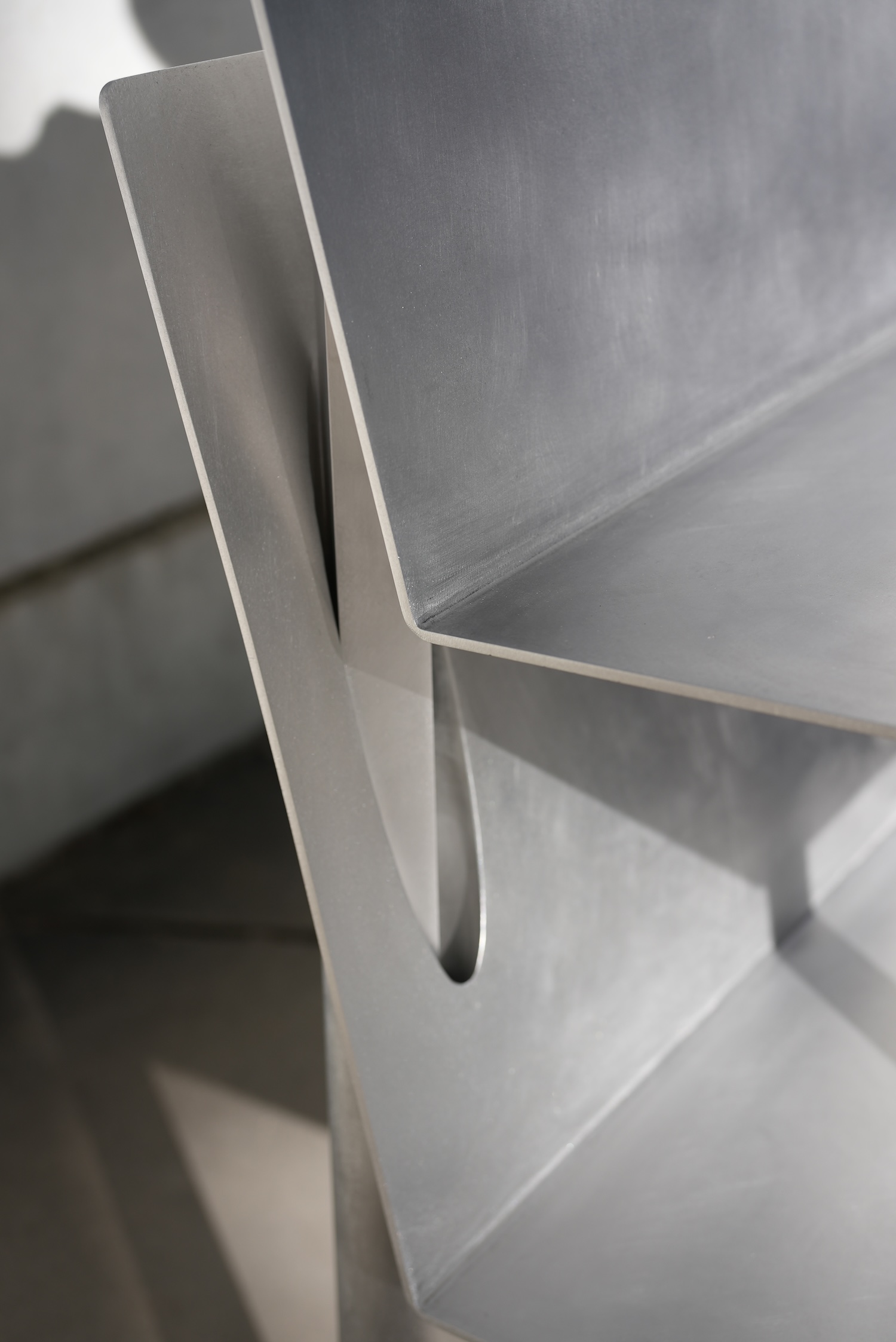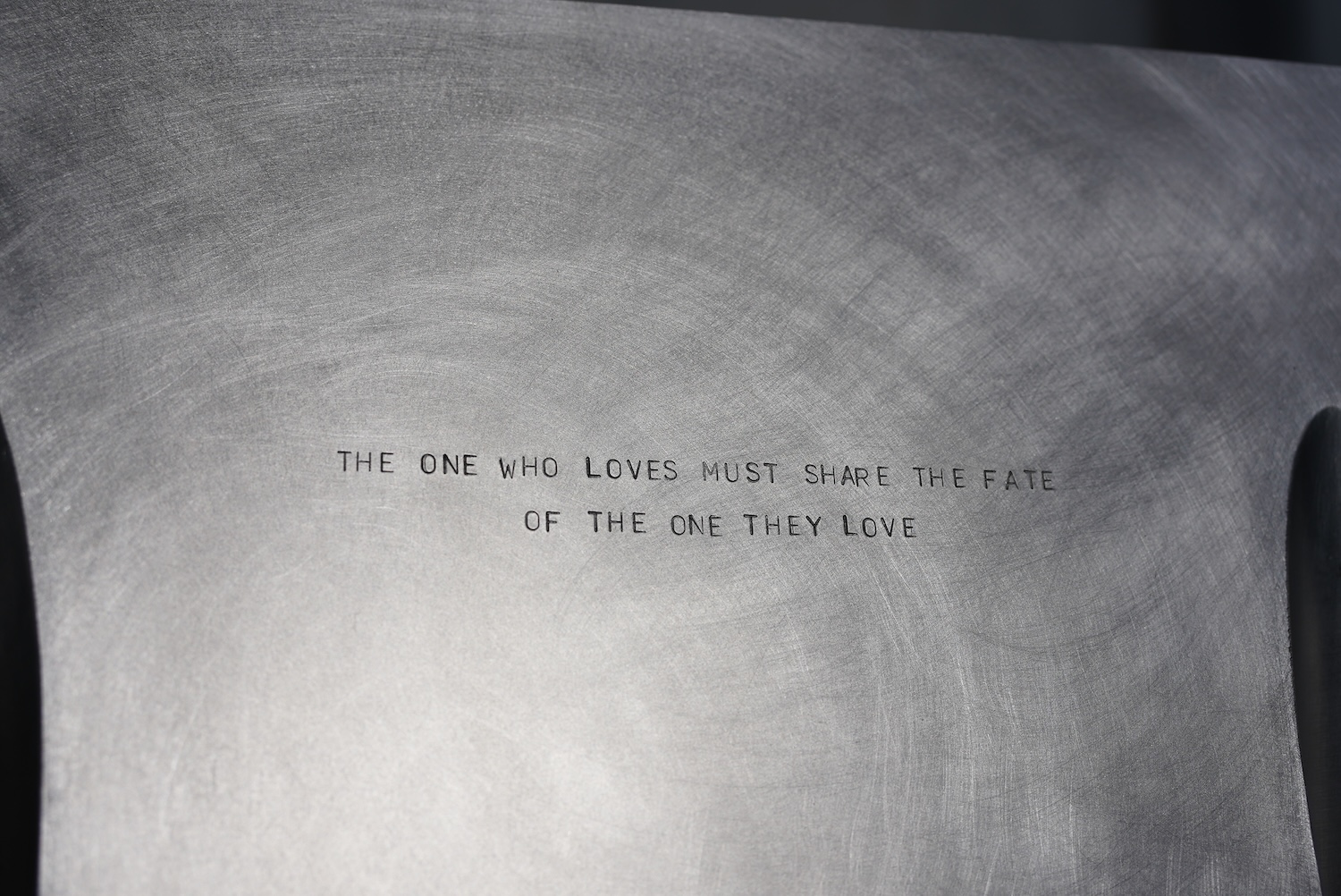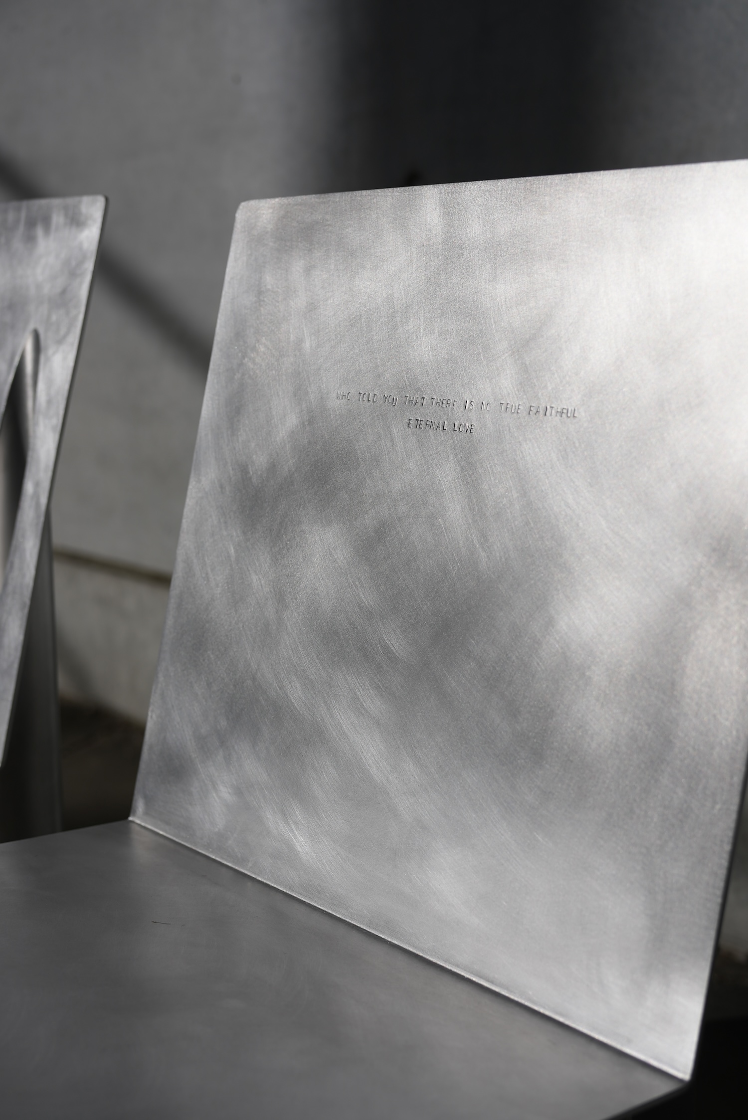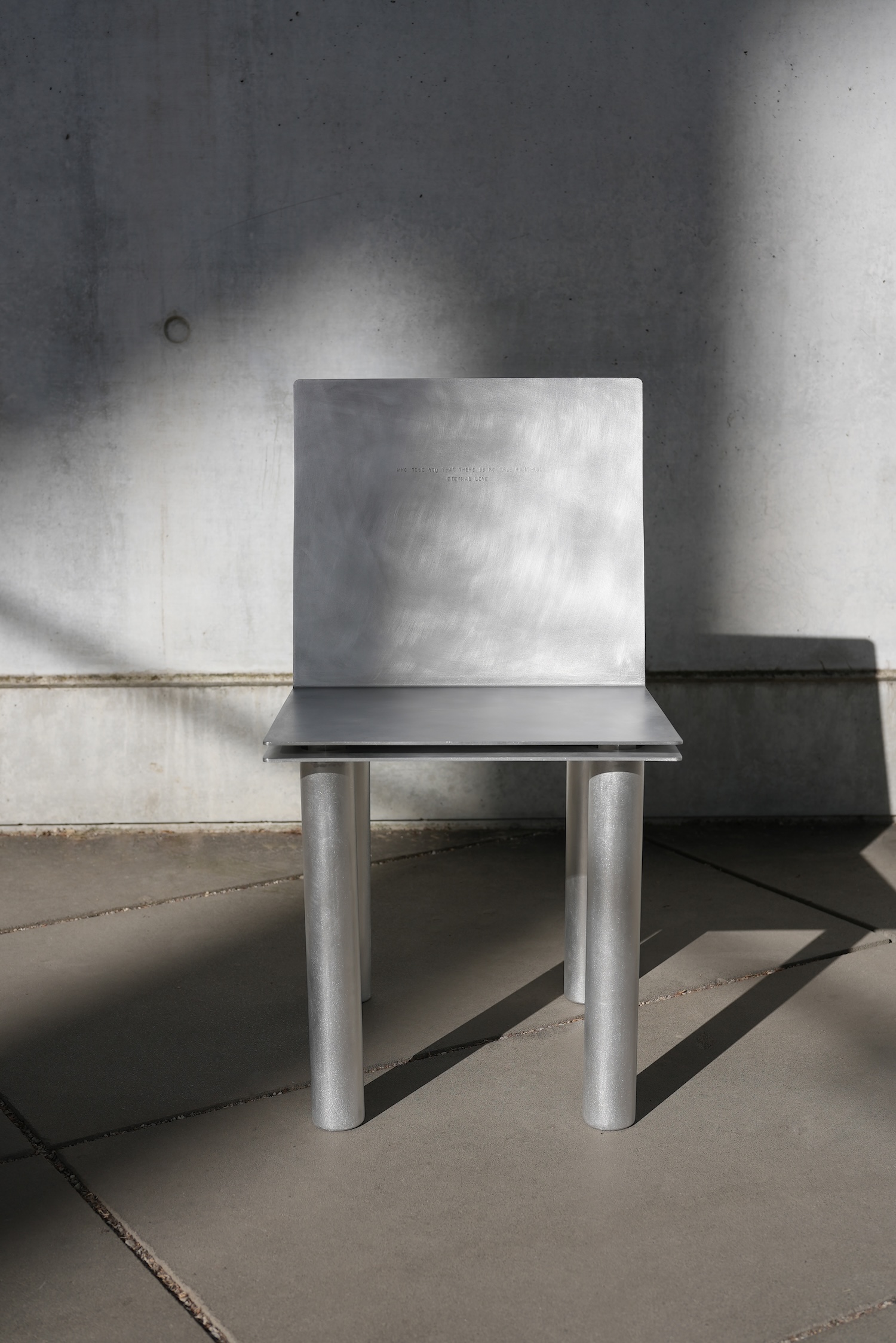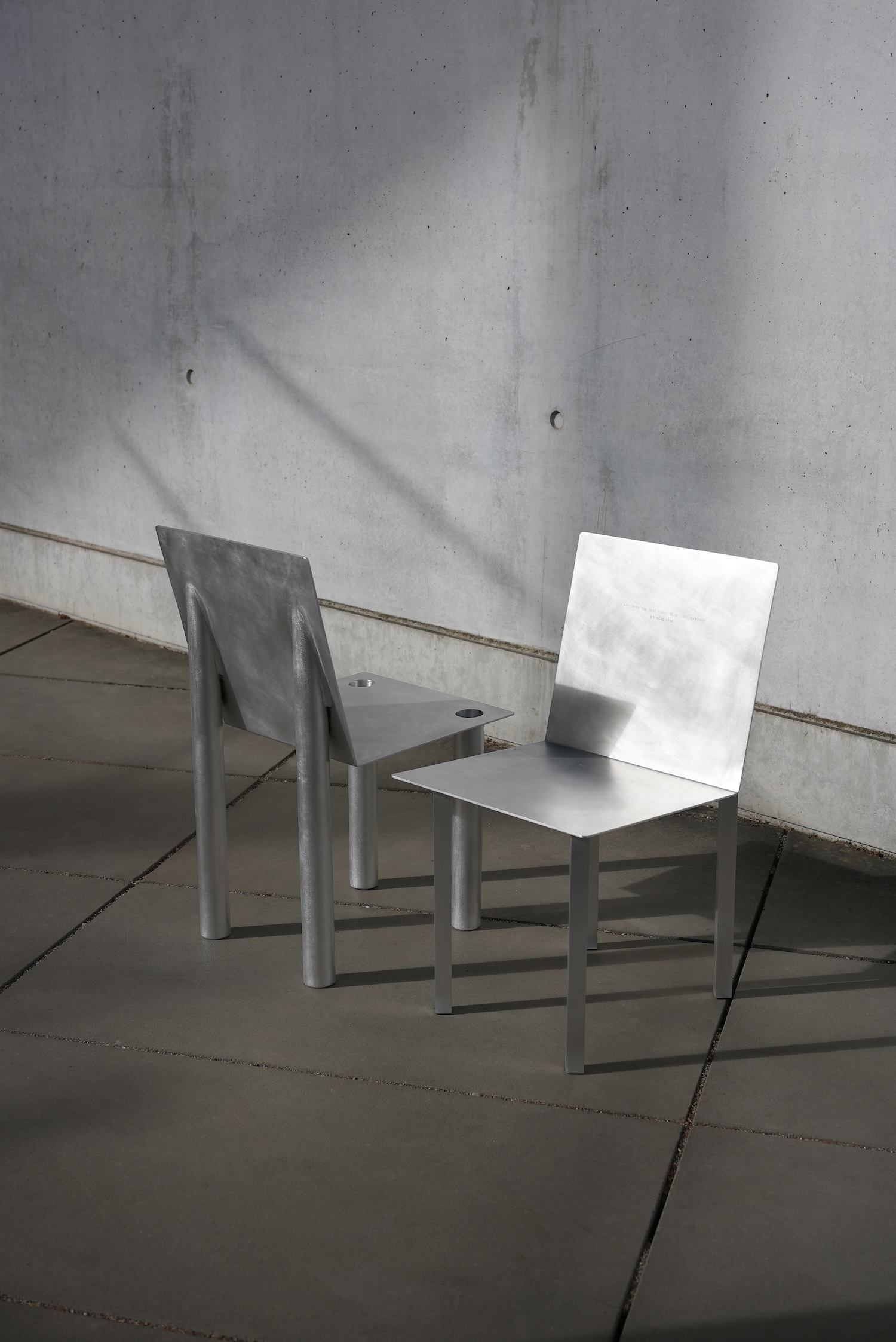 Crafted from aluminum, the design balances sharp geometric lines with a refined surface. Each chair is engraved with a quote from Bulgakov’s novel, turning them into vessels of literary memory. The Margarita chair bears “The one who loves must share the fate of the one they love,” while the Master chair reads “Who told you that there is no true, faithful, eternal love?” These inscriptions transform each chair into a place of personal memory and symbolic encounter.