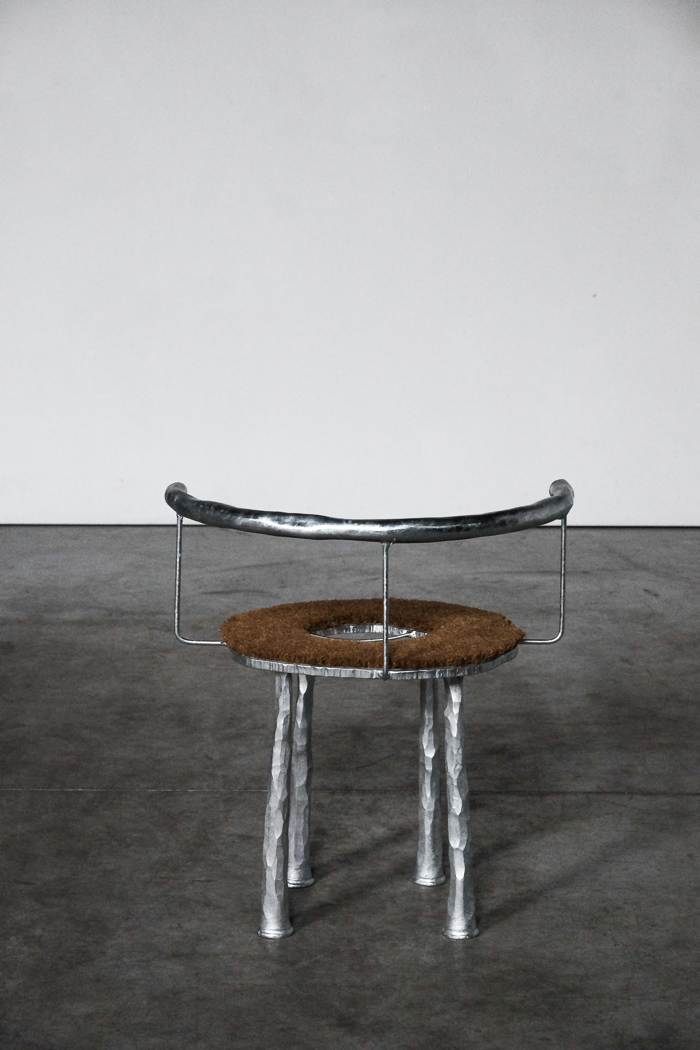 The brutalist frame, constructed from free cut and galvanized forged steel, carries visible evidence of its making. Each hammer mark records a moment of transformation, preserving the narrative of creation within the final form. These textural signatures remind us that before CAD files and digital fabrication dominated furniture production, there existed an intimate dialogue between maker and material—a conversation the Resourcer deliberately revives.