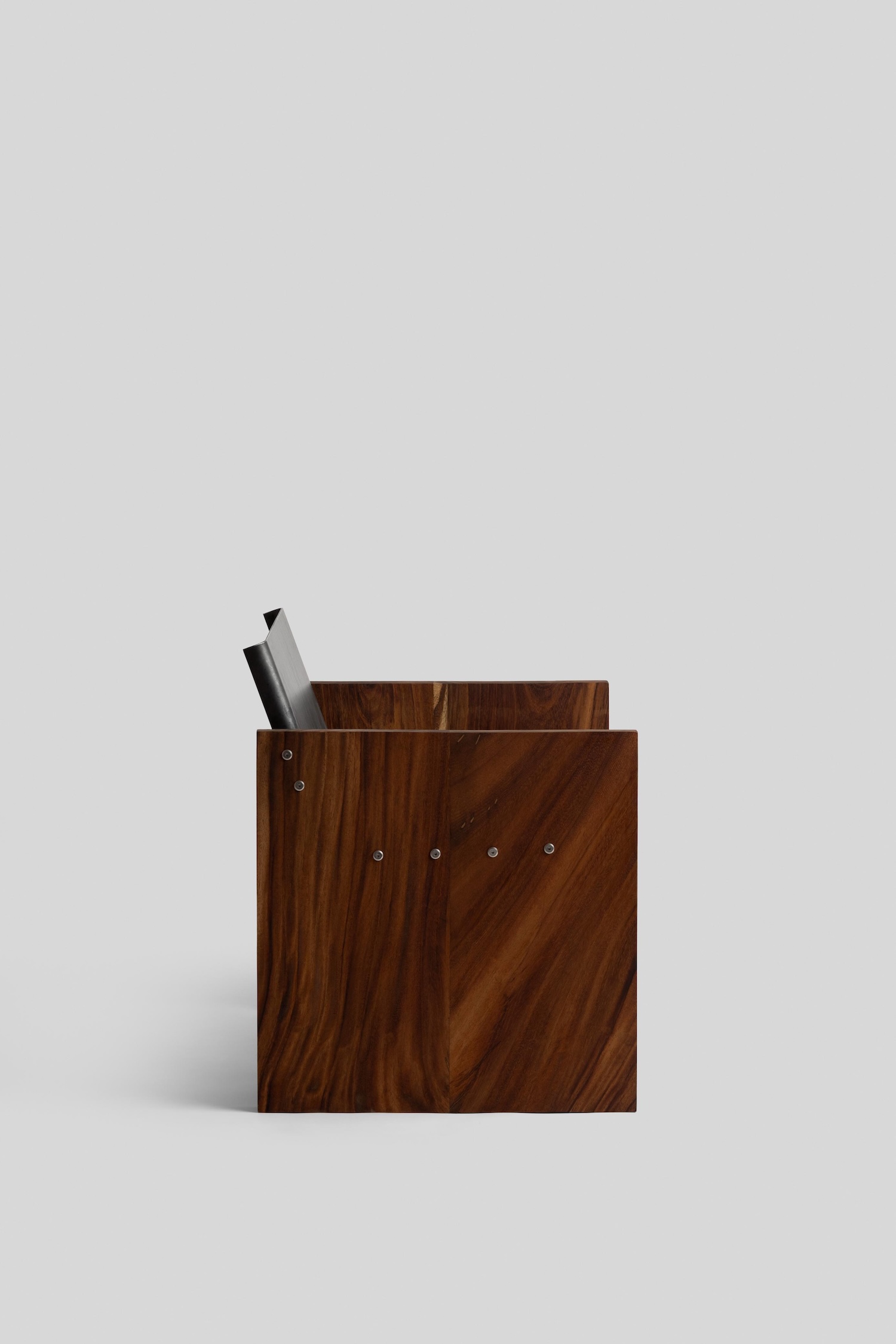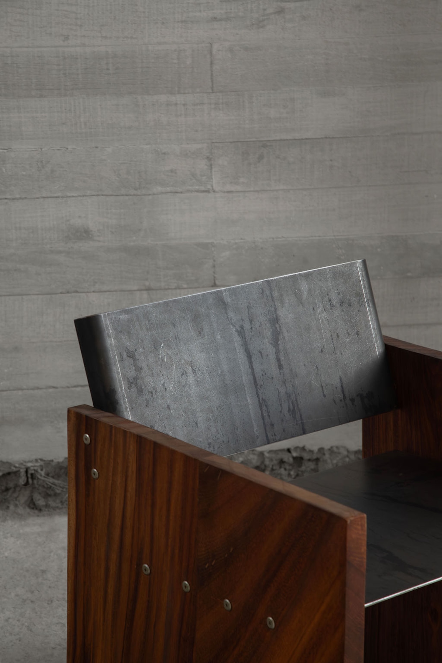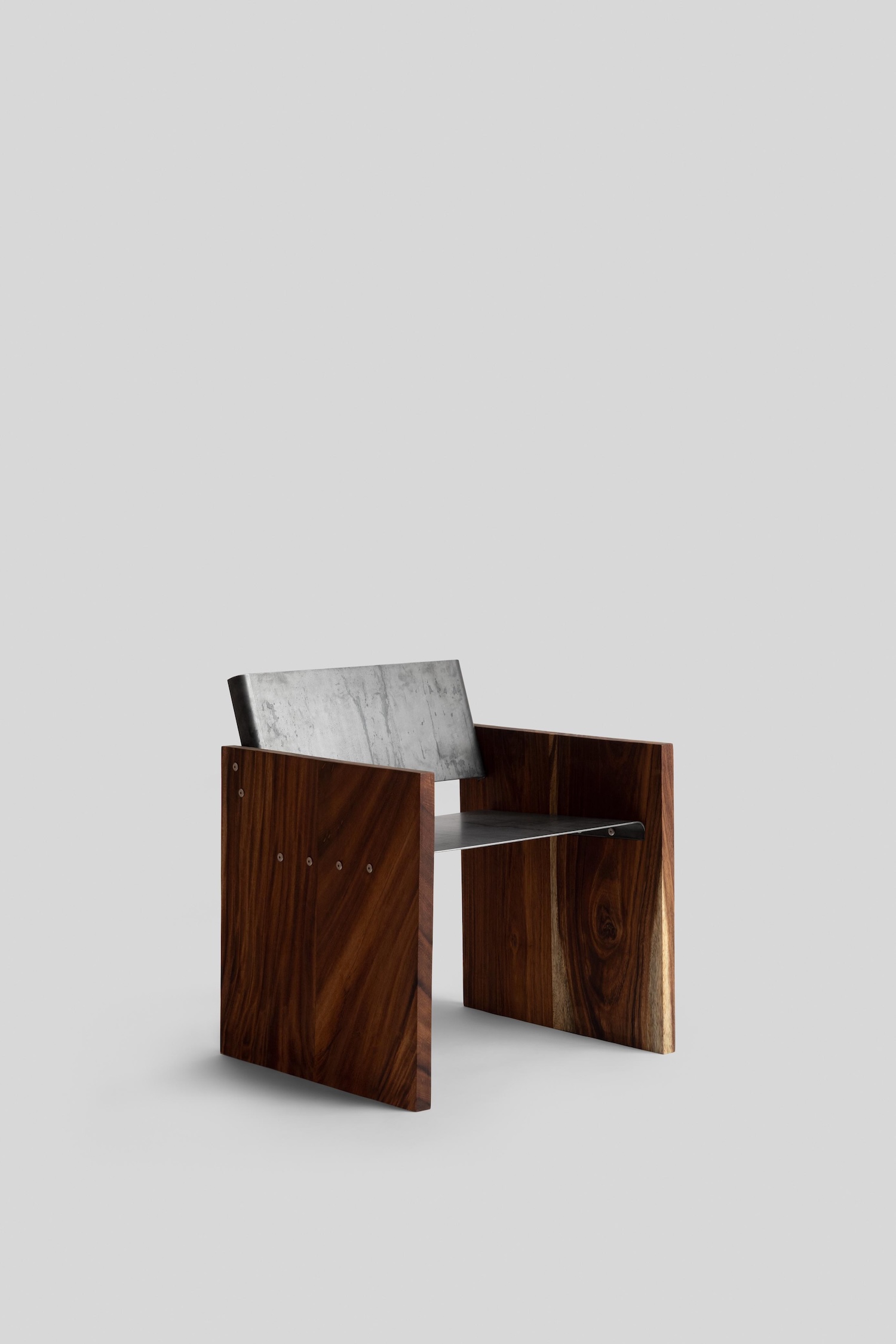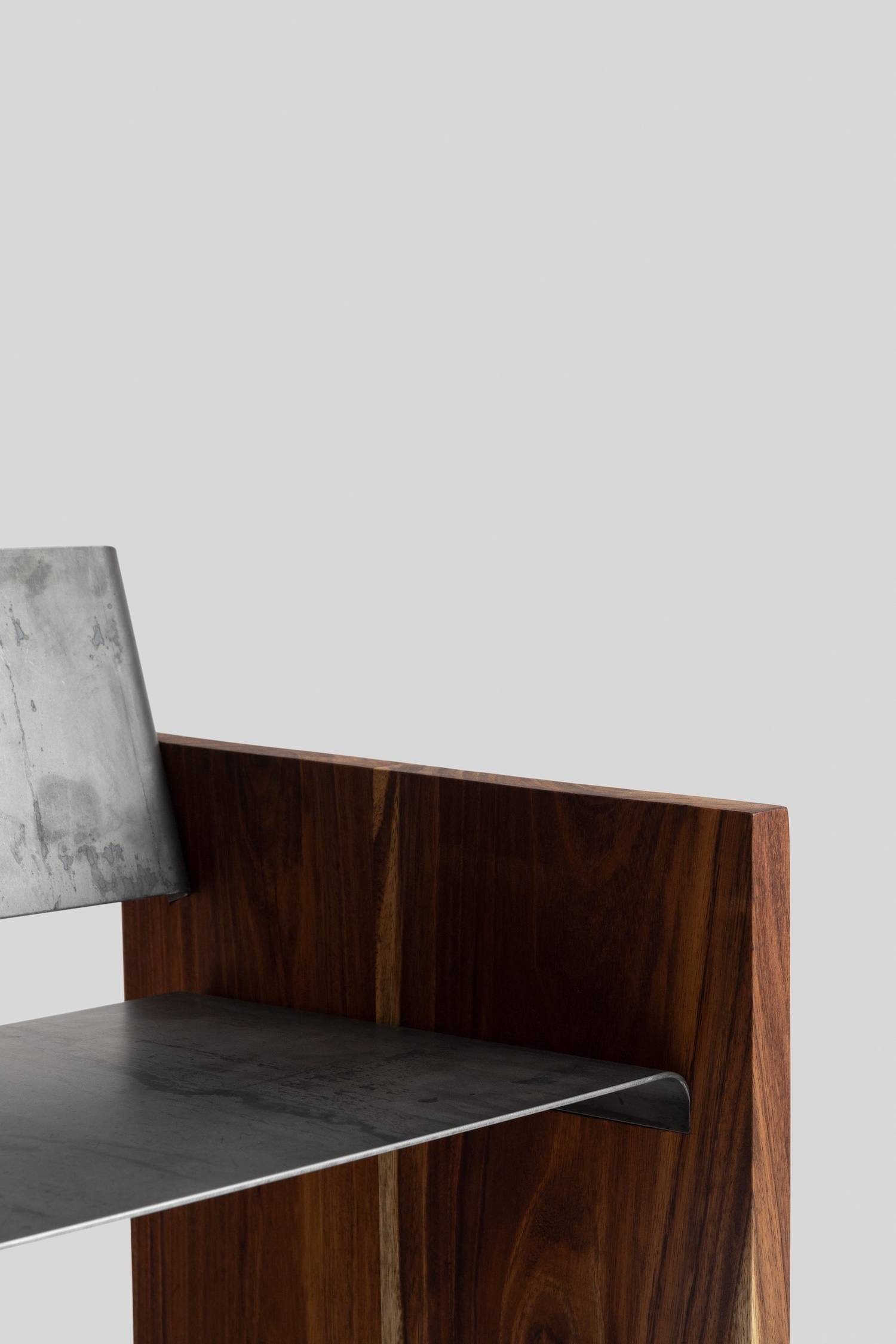 The 3-millimeter steel plate seat introduces industrial material into predominantly craft-based construction approach, creating dialogue between traditional woodworking and contemporary fabrication techniques. Wade’s decision to work the steel minimally – adding only a single fold to create connection tabs – respects the material’s inherent properties while providing necessary attachment methods. This restraint allows the steel’s natural characteristics to dominate rather than imposing complex forming operations that might obscure material identity.