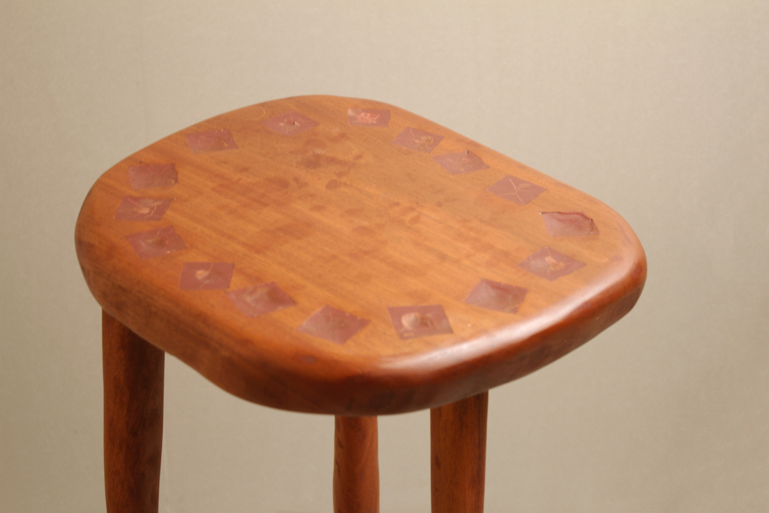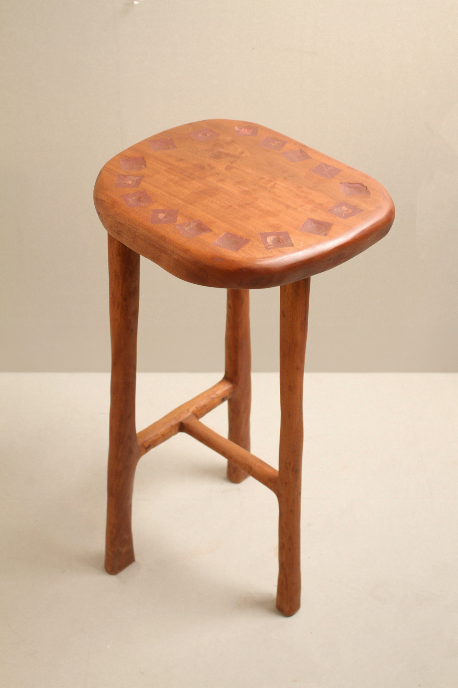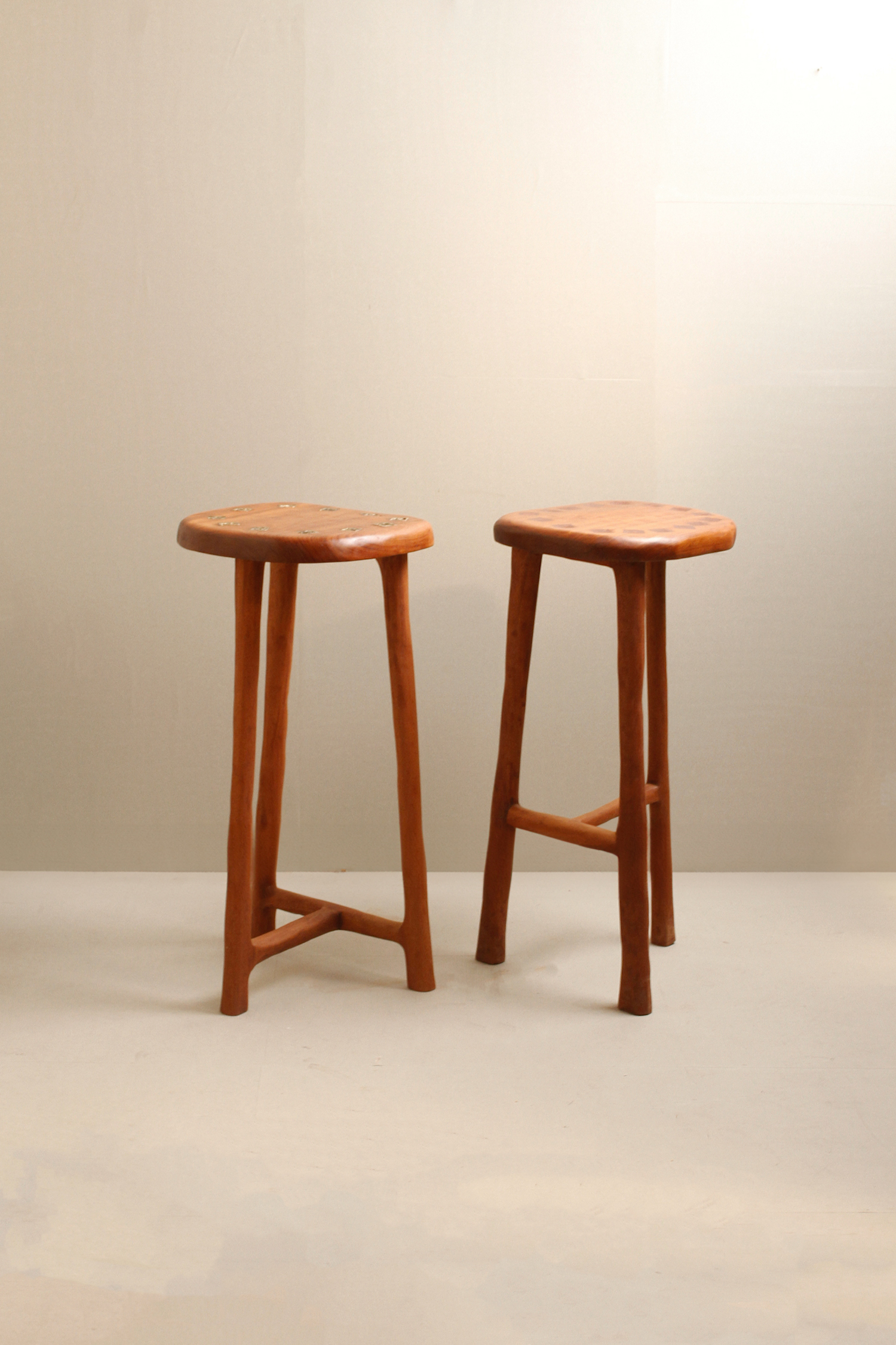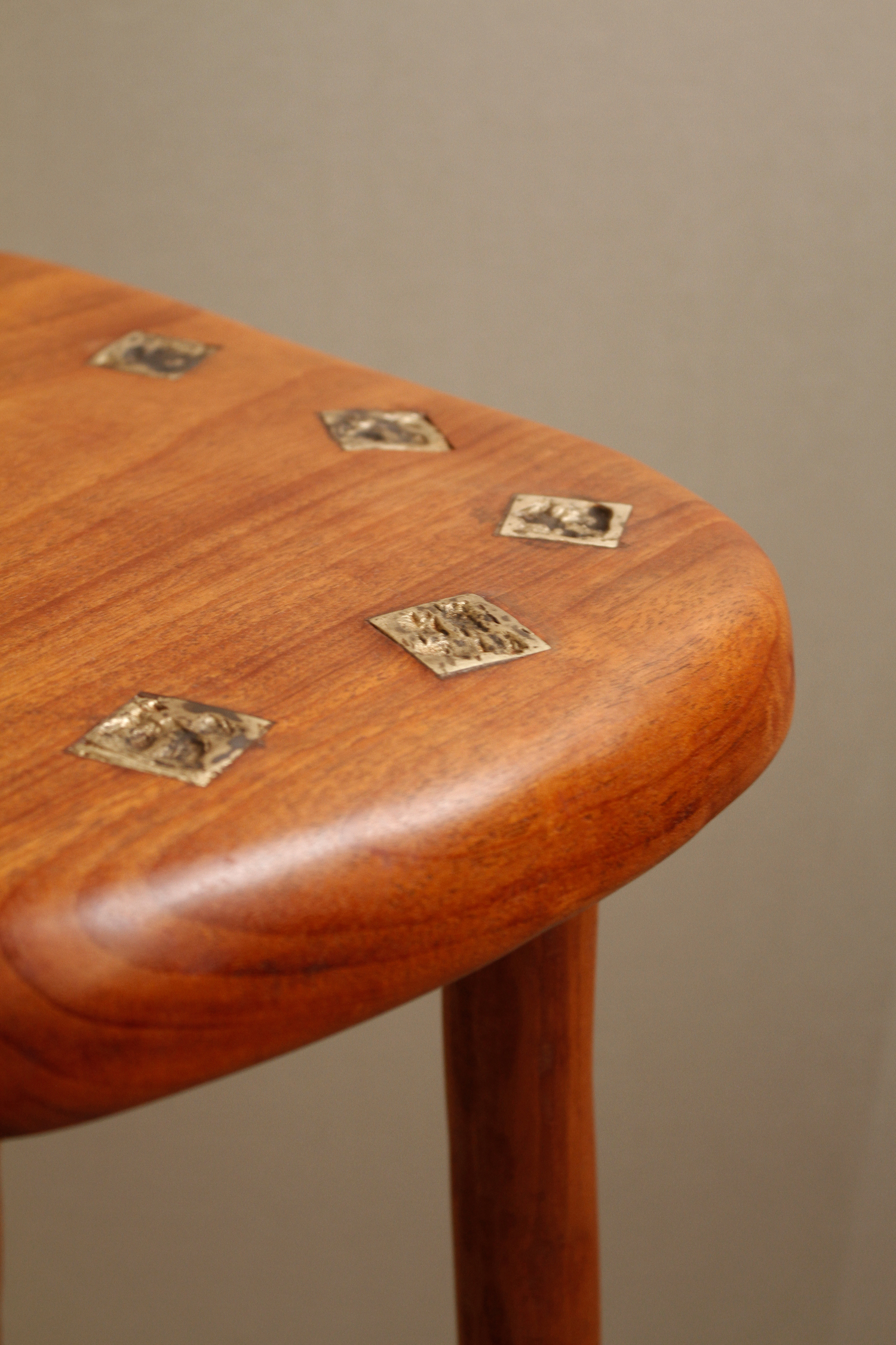 Crafted in smooth mahogany, its rich, warm tones are enhanced by a natural Brazilian Carnauba Wax finish. Stool’s seat incorporates inset bronze pieces that are irregularly shaped and retain their raw texture, creating a striking contrast between rugged and refined surfaces. Its legs are characterized by subtle, twig-like asymmetries, lending to the piece’s organic and imperfect elegance.
