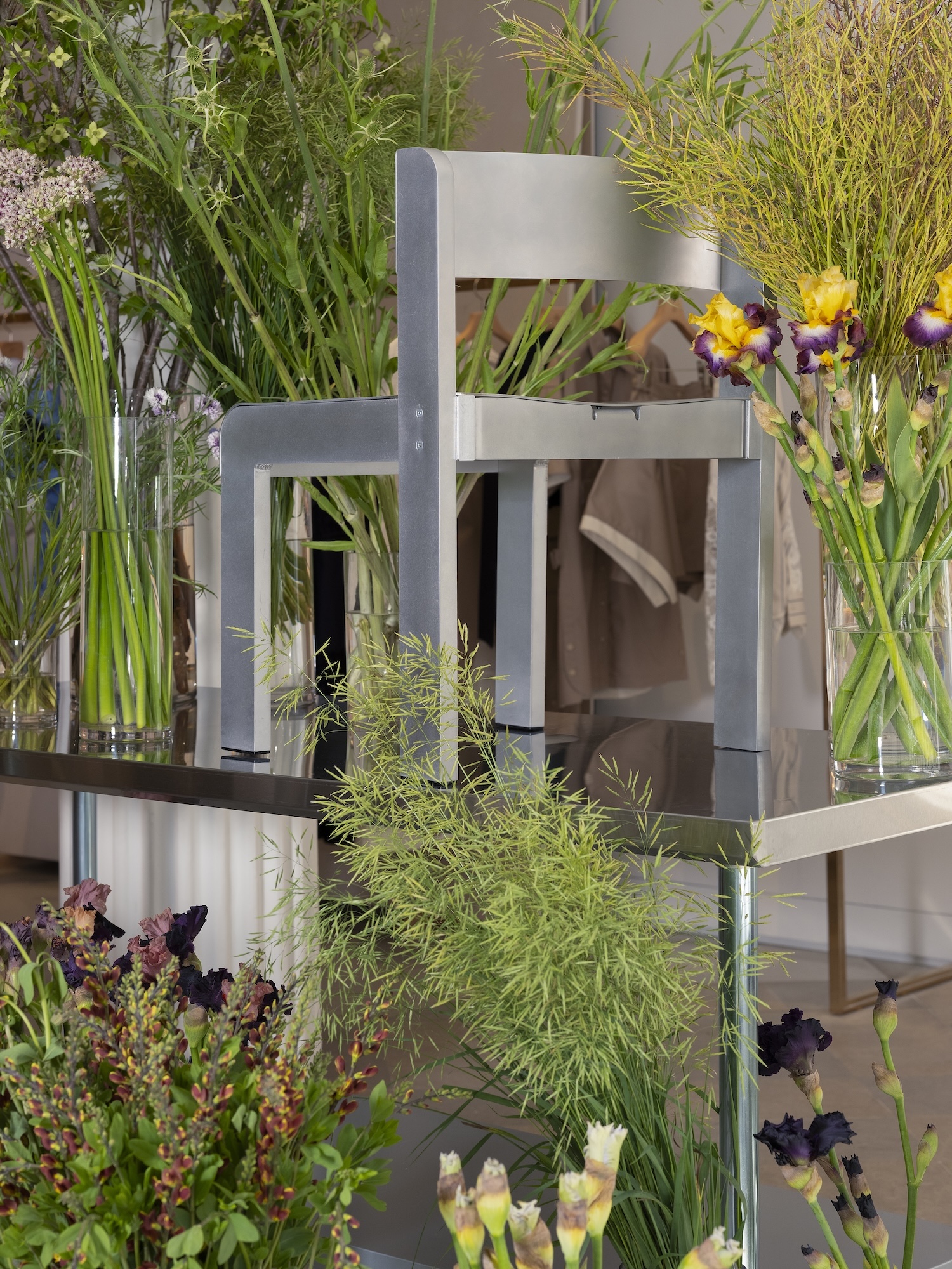 Sturdy Chair is a minimal chair created by Brooklyn-based studio Office of Tangible Space for Bestcase. The aluminum gleams with an almost liquid quality under the filtered light of 3.1 Phillip Lim’s Great Jones Street showroom, where Office of Tangible Space’s Sturdy Chair commands attention not through ostentation, but through an understated confidence that speaks to decades of design evolution. The show launched as part of Rooted a showcase of contemporary craft curated by FDK Florals and Sandy Park as part of NY Design Week. This chair represents more than mere seating – it embodies a contemporary response to the enduring challenge of creating furniture that transcends categorical boundaries while maintaining an essential honesty of purpose.