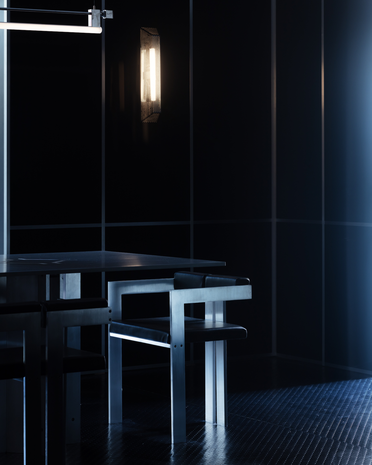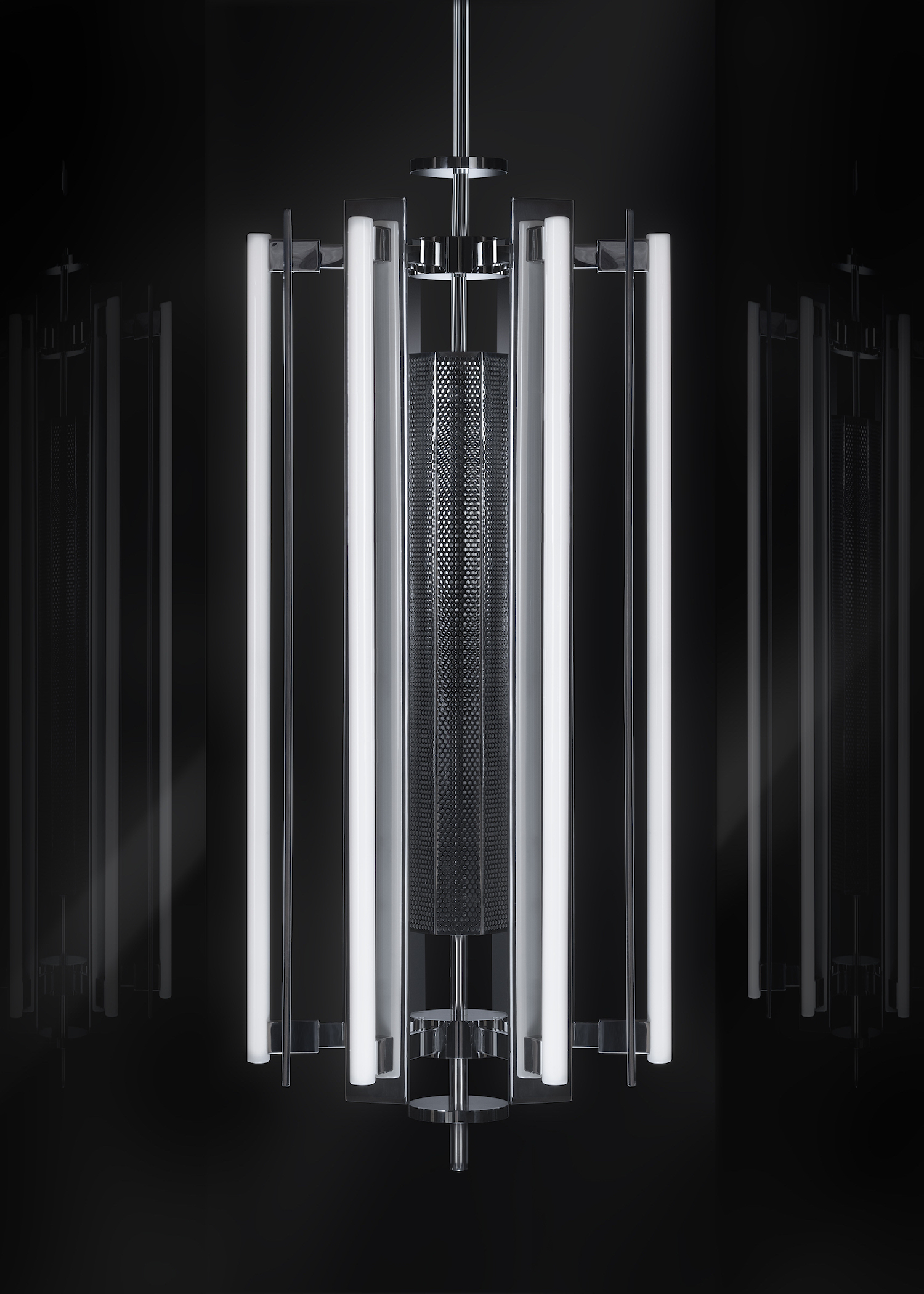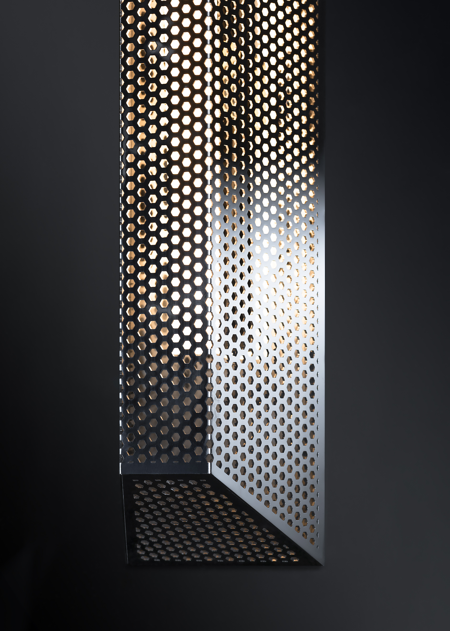 In designing Empyrean, KAIA and John Whelan, founder and designer of GSL Works, drew inspiration from the Art Deco period’s sleek geometric designs and the mysticism of sacred geometry to create a duo of imaginative futuristic lights. The highlight of the collection is the “Empyrean”, a modern, limited-edition stainless steel chandelier that is adorned with a subtle “starburst” motif, reminiscent of esoteric rays of light that invoke feelings of transcendence and the sublime when viewed from above. Complimenting this piece is the “Trap”, a perforated, polished steel sconce that exudes a soft, warm glow.