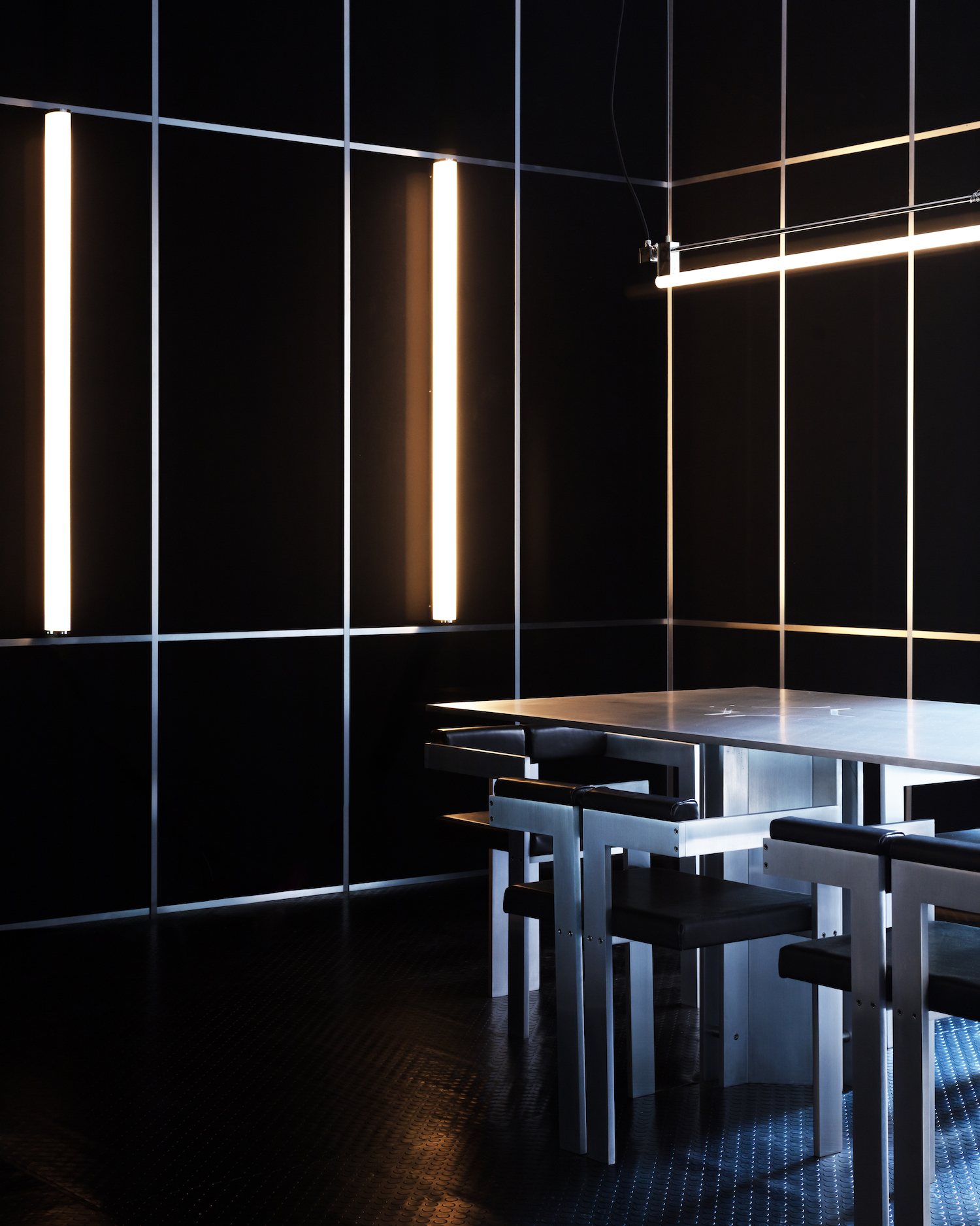 The collection debuted at this year’s Milan Design Week, marking KAIA’s inaugural appearance at the Italian design event. Showcased in Milan’s bustling 5Vie district, the Empyrean collection’s installation presented the two lights in an enigmatic atmosphere, shrouded in a deep black palette that evokes a sense of darkness and intrigue. Playing with contrasts, the installation also featured the pieces alongside KAIA’s classic lighting designs, the “EON” and “LIA”, as well as the atelier’s minimalist furniture pieces including the limited-edition “Hearg” table and “Seld” chairs.