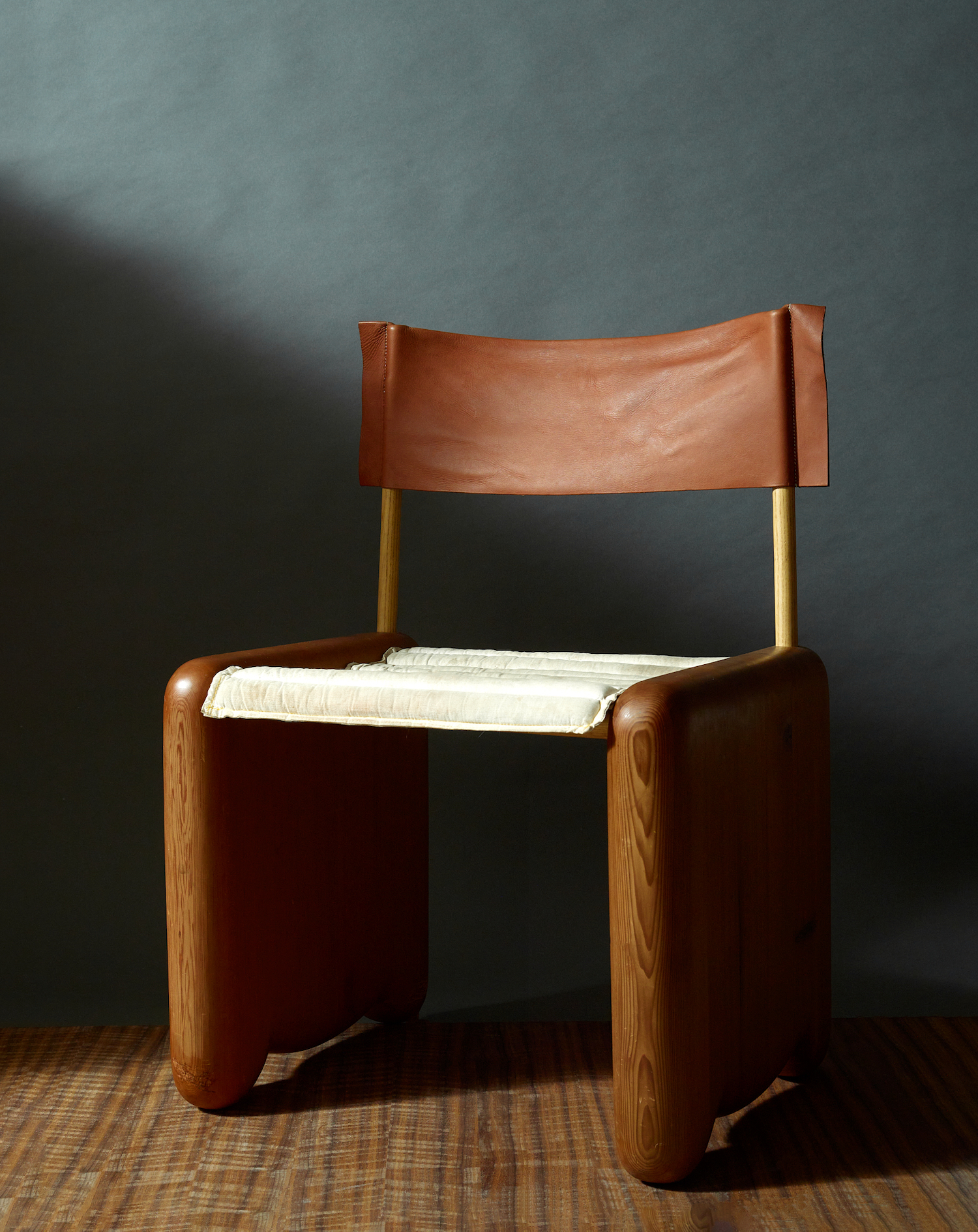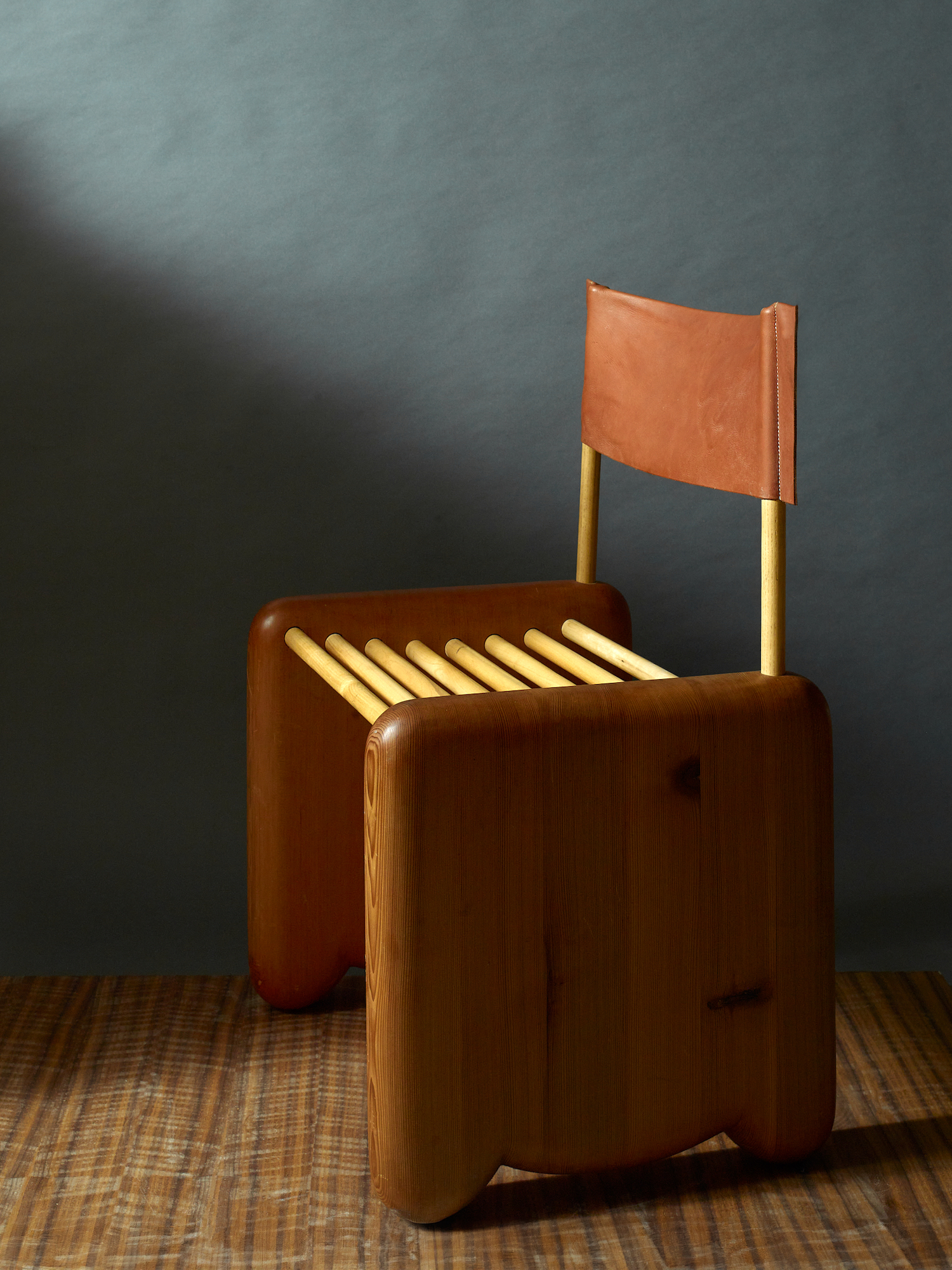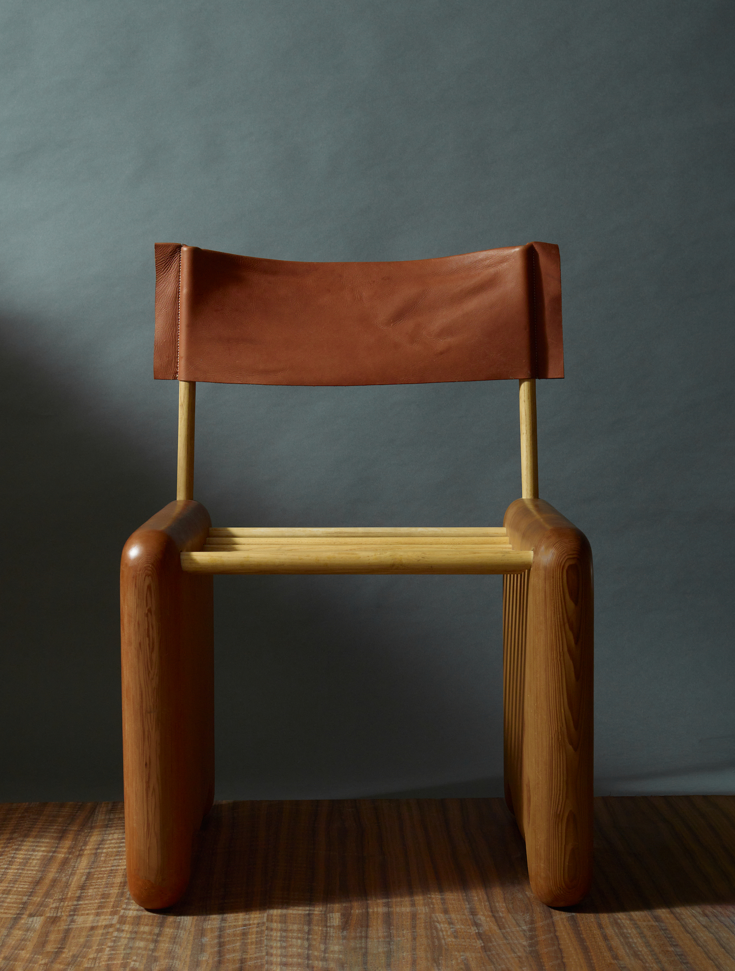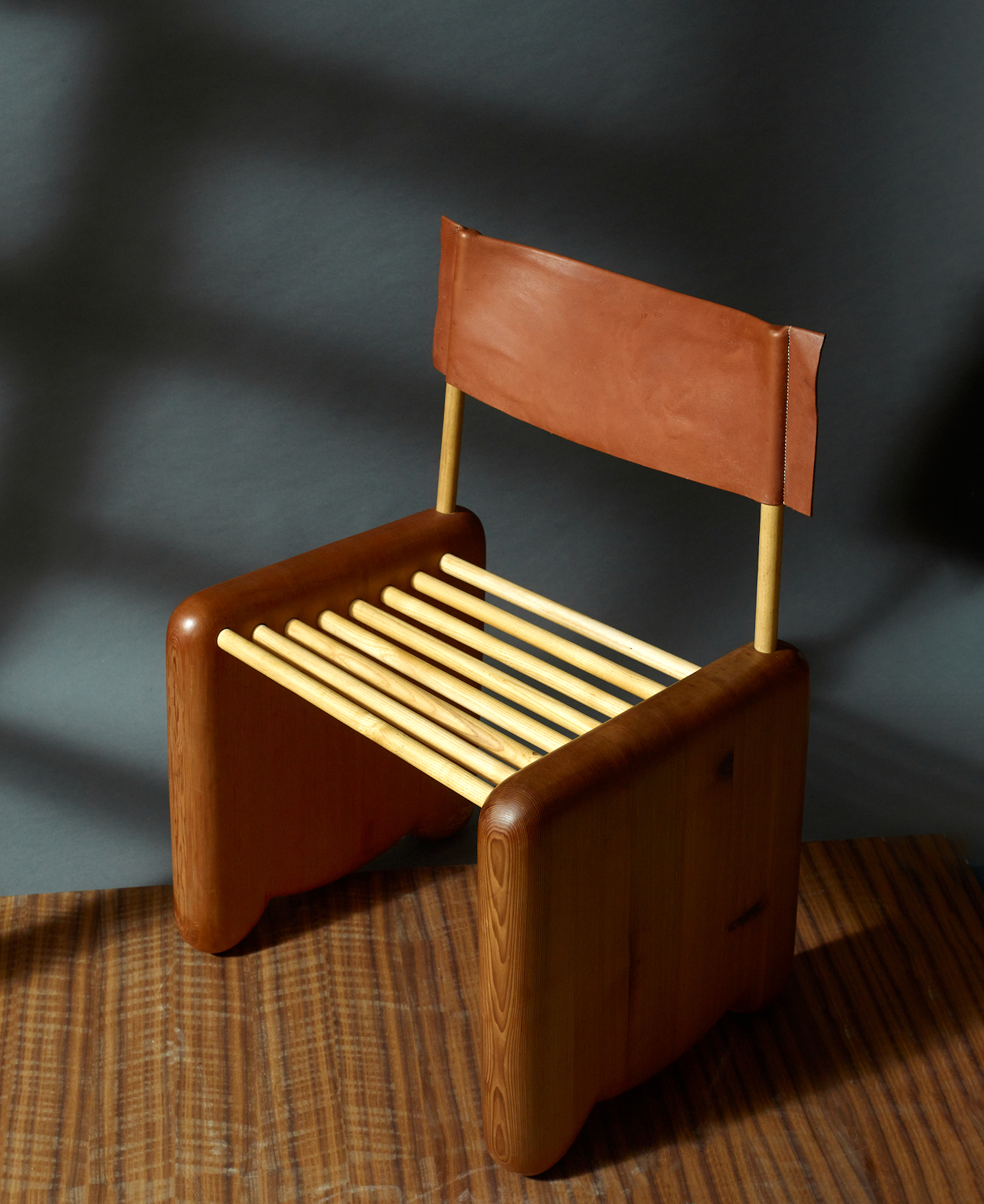 This reference is translated into a simple yet playful seat. Two solid cedar side frames, defined by their rounded profiles, are connected by simple round dowels, creating a form that feels both sturdy and unique. The use of curved, softened elements gives the chair an approachable presence, while the contrast of materials introduces visual depth. A leather sling back acts as the backrest, offering flexible support and a tactile counterpoint to the warmth of the wood. A cushioned seat completes the piece, enhancing comfort without disrupting the chair’s pared-back language.
