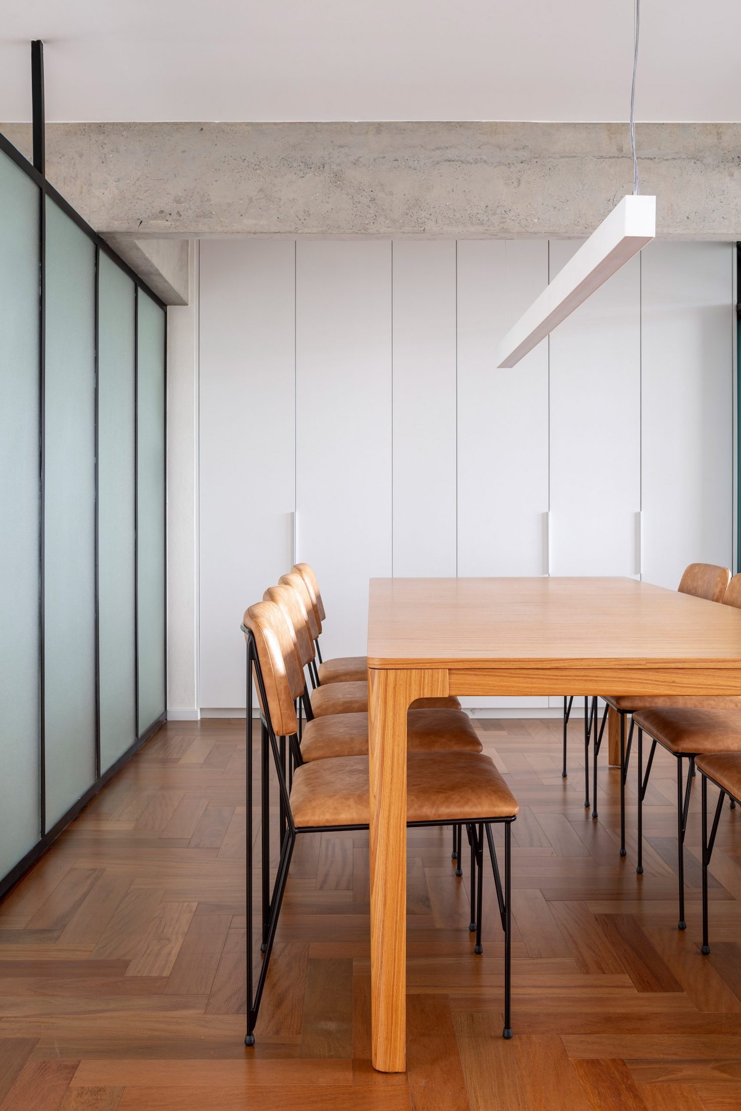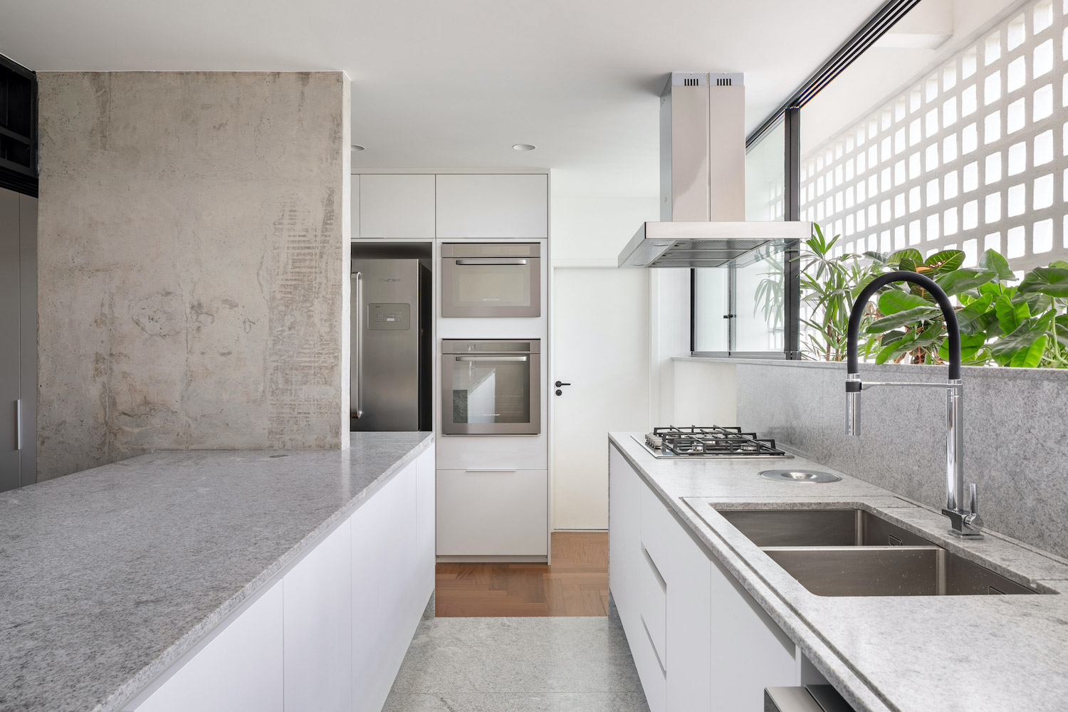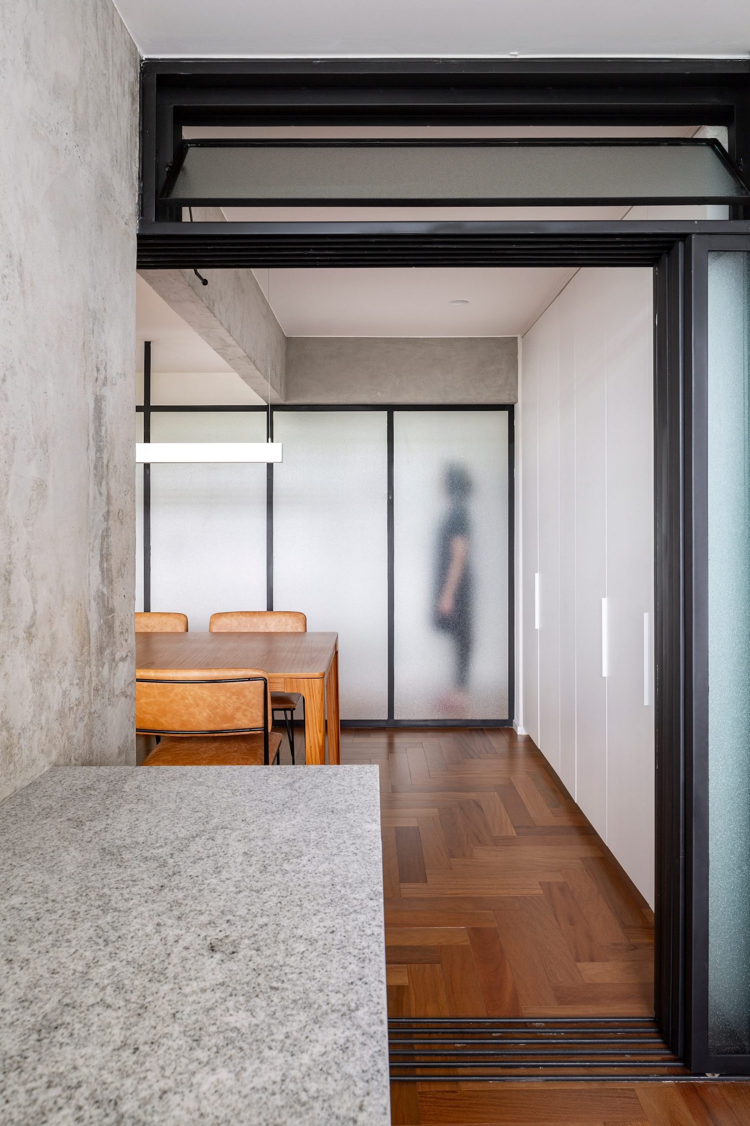 308S Apartment is a minimalist interior located in Brasília, Brazil, designed by Bloco Arquitetos. While the space has undergone several renovations in the past, the architects wanted to focus on reconfiguring the layout by opening up the space and replace some of the walls. Walls were substituted with translucent partitions that allow light to pass through while maintaining privacy. The semi-transparent sliding doors provide separation between the kitchen from the dining and living areas.