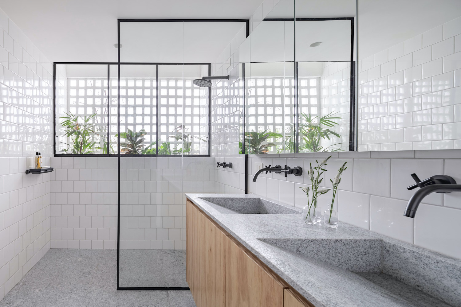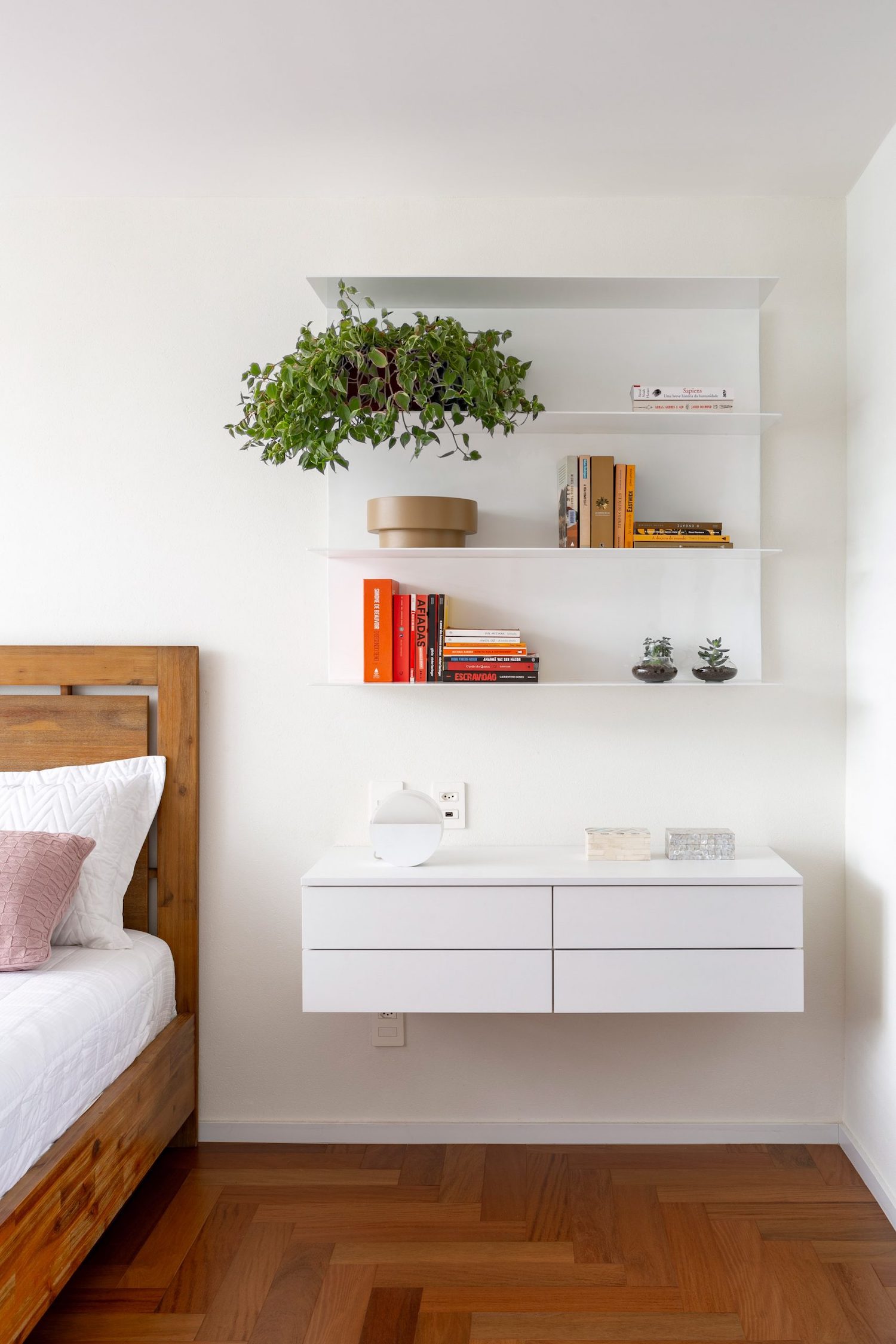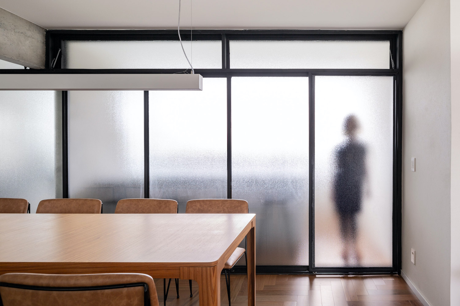 308S Apartment is a minimalist interior located in Brasília, Brazil, designed by Bloco Arquitetos. While the space has undergone several renovations in the past, the architects wanted to focus on reconfiguring the layout by opening up the space and replace some of the walls. Walls were substituted with translucent partitions that allow light to pass through while maintaining privacy. The semi-transparent sliding doors provide separation between the kitchen from the dining and living areas.