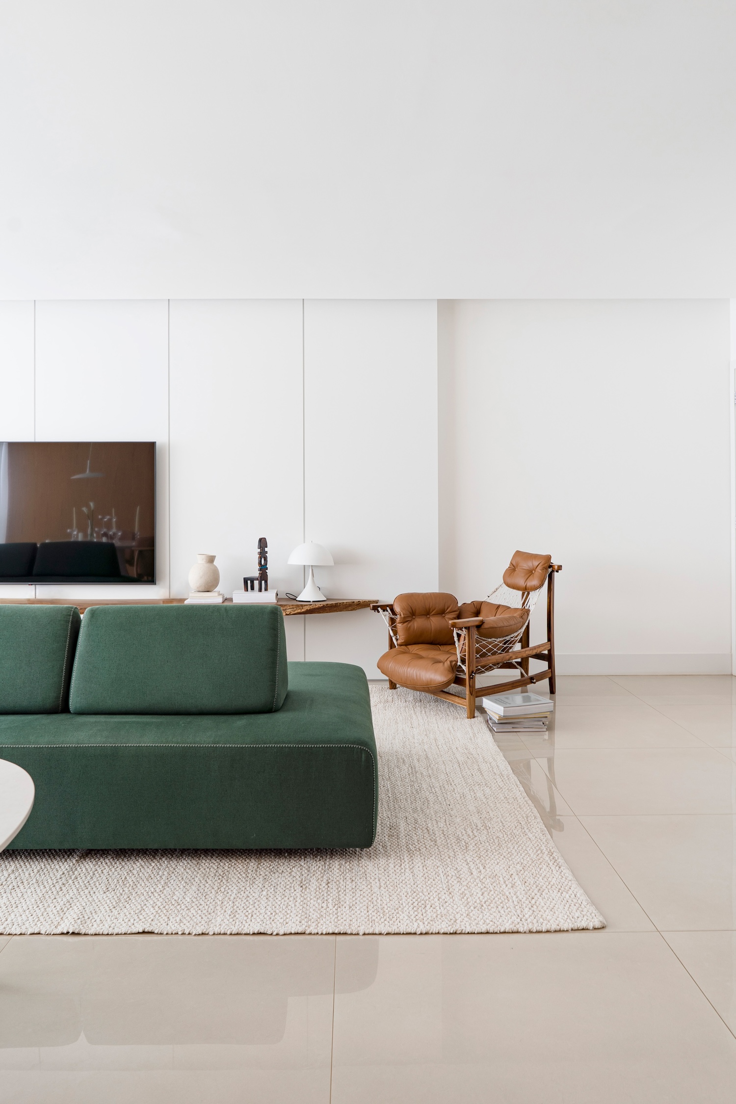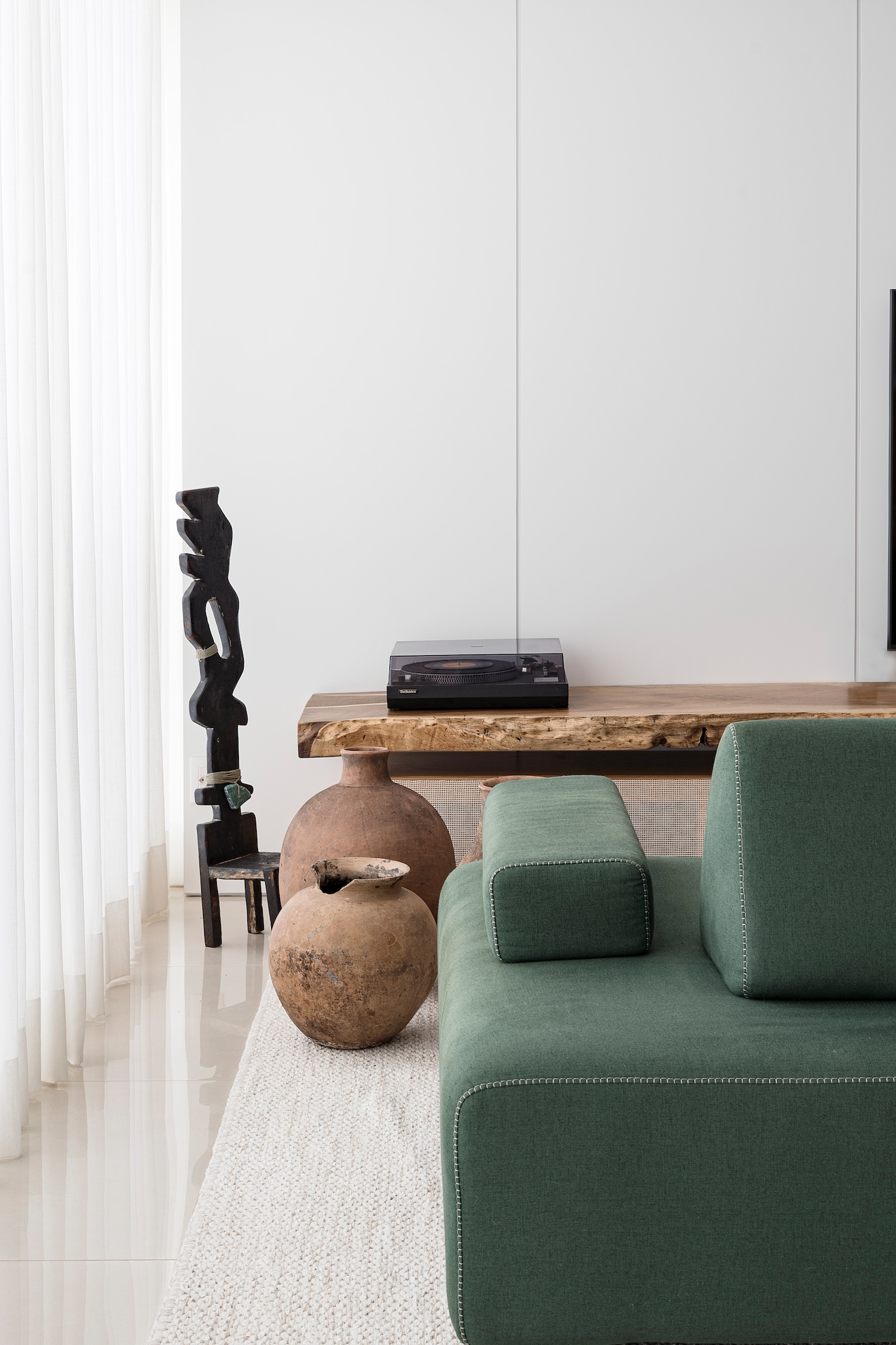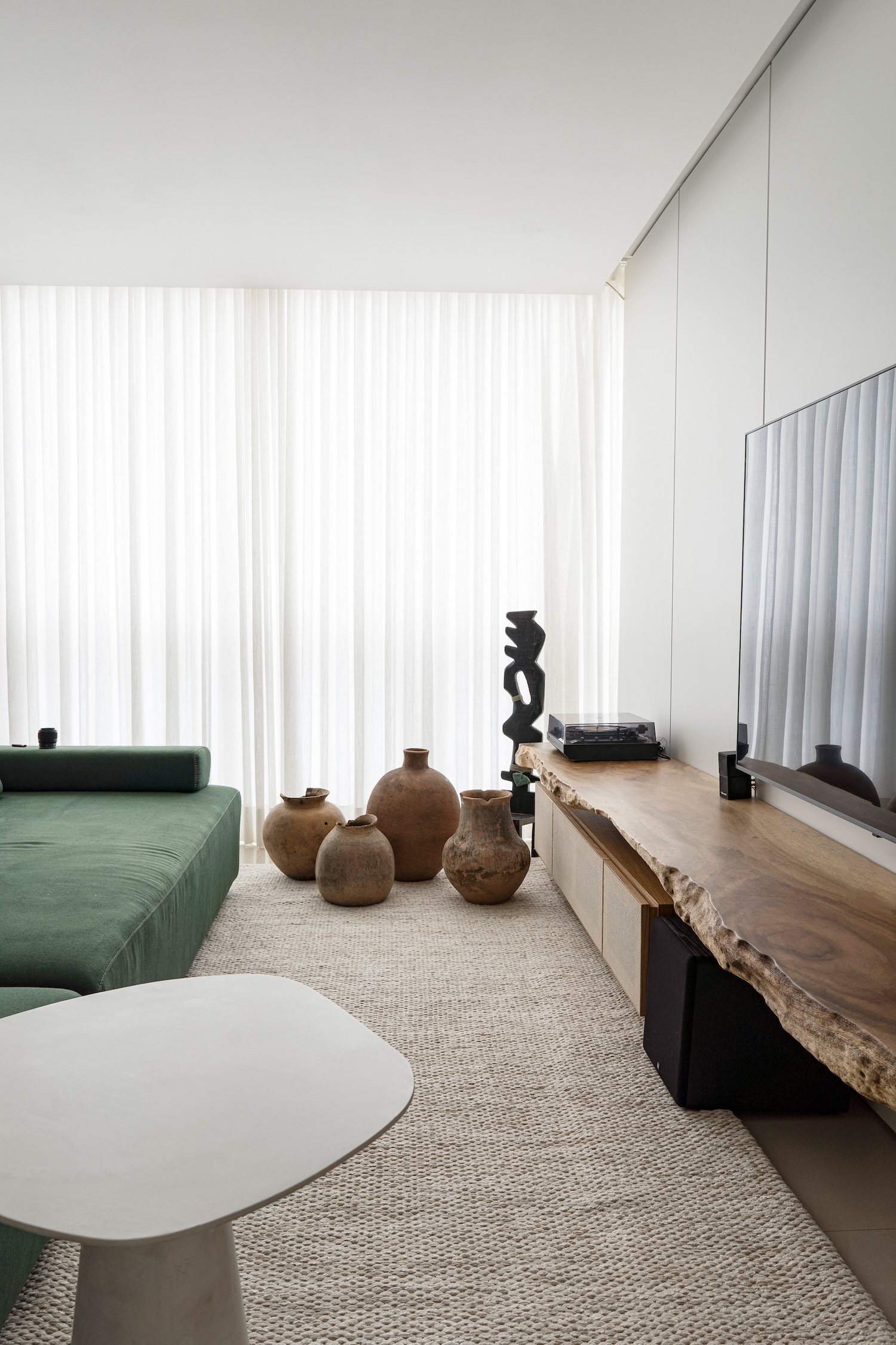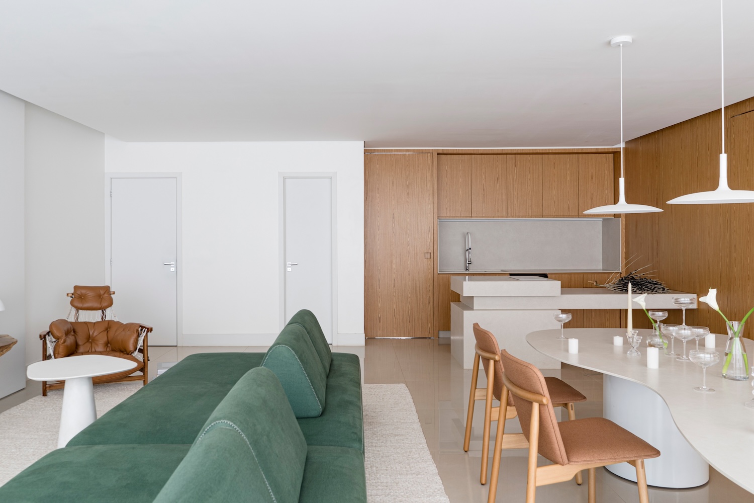 Apartamento Olê Olé is a minimalist apartment located in Brasília, Brazil, designed by PATROPI. Small modifications to existing walls helped achieve this goal, particularly in maximizing space utility. Upon delivery, the apartment already met some of the residents’ expectations but lacked fluid, multifunctional spaces. The renovation focused on rearranging the living room and a bedroom to incorporate a gourmet area, creating an integrated living space designed for social gatherings and shared culinary experiences. The design includes a curated selection of Brazilian furniture, blending modern and ancestral elements. A custom-designed table, notable for its fluid form and functionality, stands out as a centerpiece. To achieve a timeless look, the renovation juxtaposes vertical and horizontal planes in various materials. Wood contrasts with cream-colored surfaces, adding depth and perspective. Different shades of green balance the neutral tones, while enhanced textures and indirect lighting create a sophisticated and cozy ambiance.
