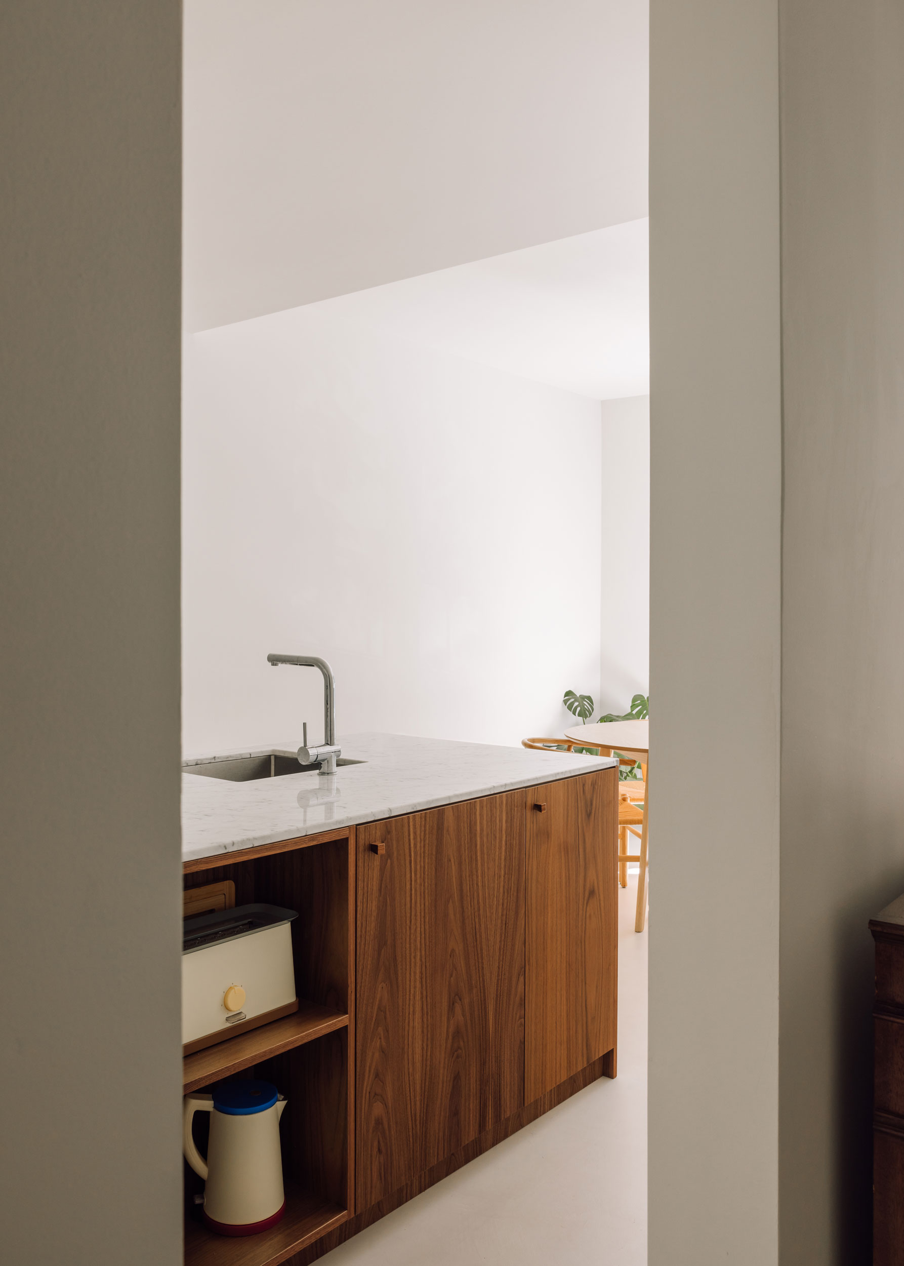 Apartment in Praça dos Aliados is a minimalist apartment located in Lisbon, Portugal, designed by corp arquitetos. The apartment’s layout was revamped with a strategic design that forms a harmonious balance between communal and private areas, cohabitation and solitude, as well as light and shadow. This thoughtful design strategy overturns the existing blueprint of the space, enhancing its livability. Key features of the apartment are carved out through skilled carpentry work, assigning individual functions to each room. The kitchen, designed to be in harmony with the living room, supports a dynamic live-and-dine experience. Meanwhile, the bedroom and office spaces feature built-in closets that deliver ample storage and contribute to their respective identities. These functional installations are considered integral spatial dividers, similar to traditional walls. However, free-standing fixtures also have their place in the scheme, enriching the practicality of the space. Independent cabinetry in the kitchen, a rear cabinet in the living room, and a desk in the office tie the design together. These objects, all crafted in rich walnut, add a touch of warmth to the otherwise neutral spaces.