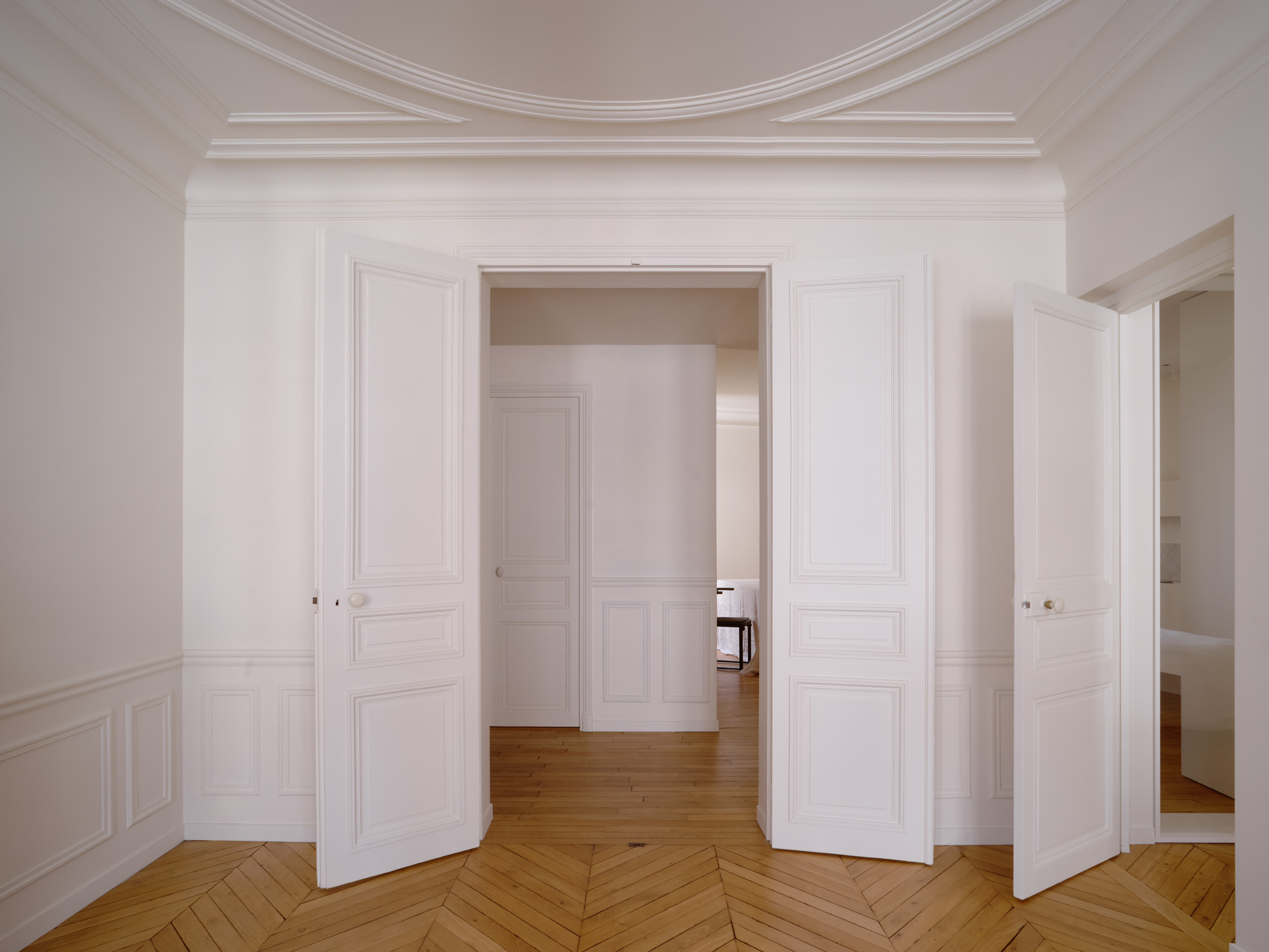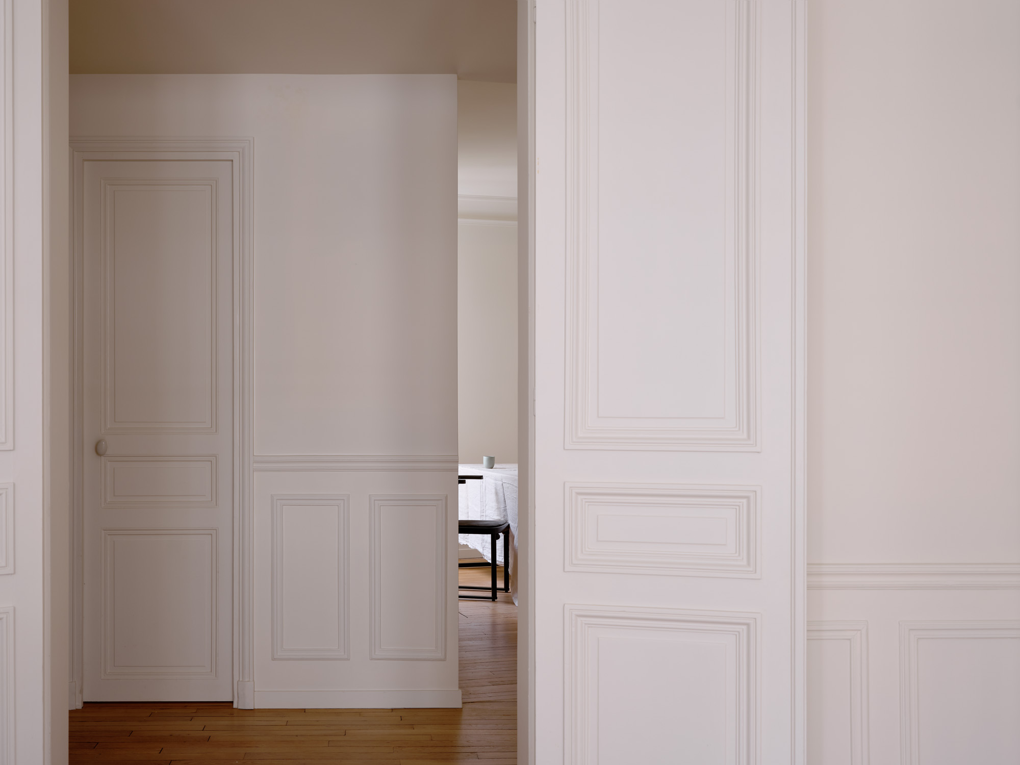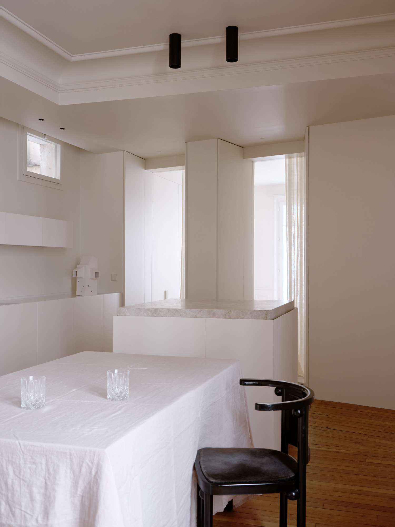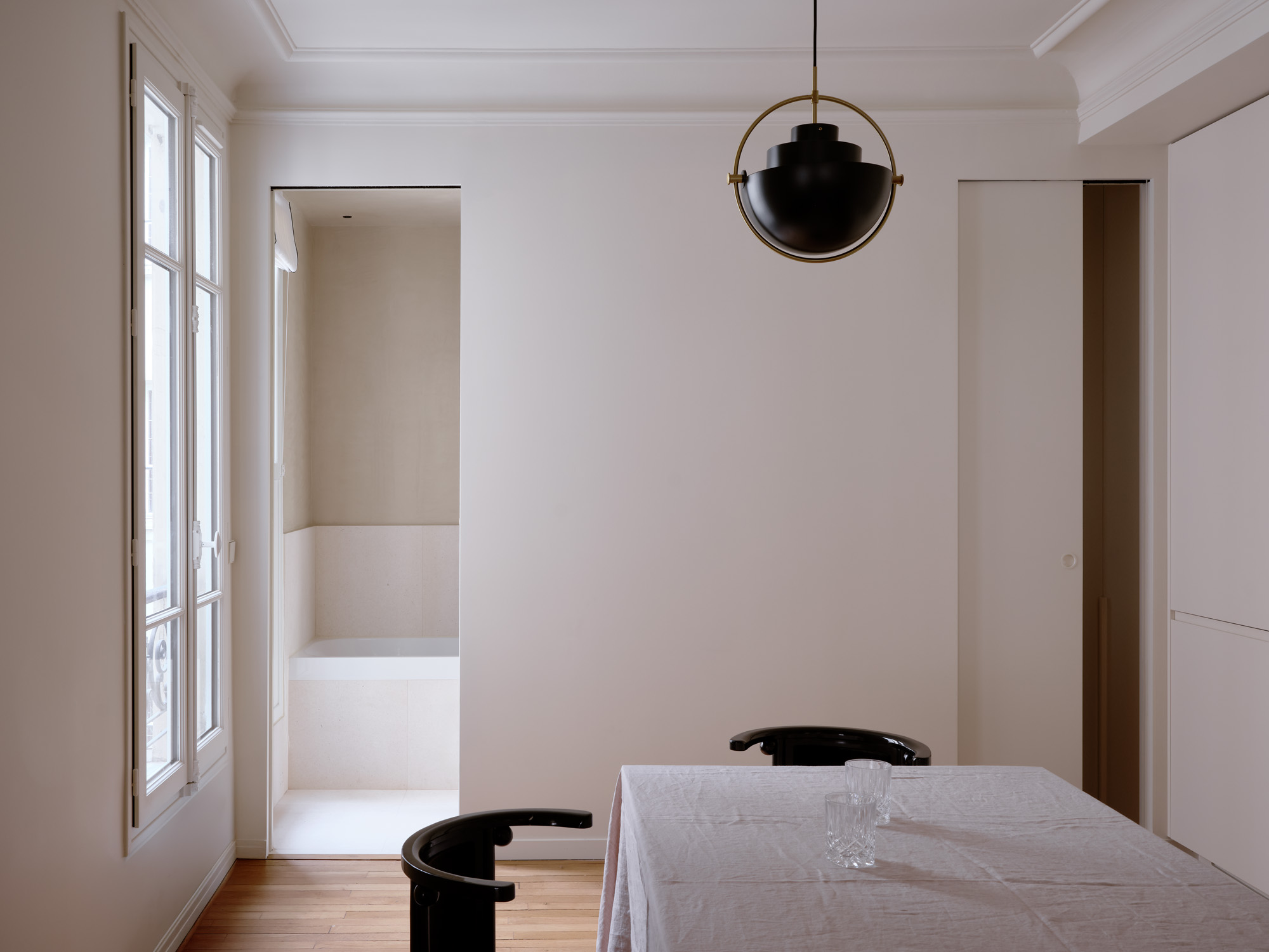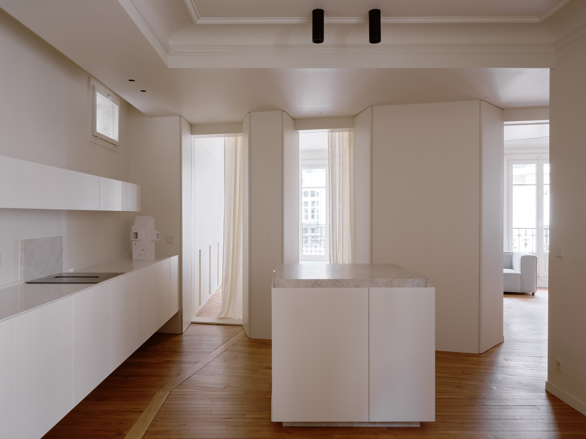 Apartment in the 17th Arrondissement is a minimal apartment located in Paris, France, designed by Brunet Lecomte Eisenlohr Architectes. The transformation of this Parisian apartment represents more than mere renovation; it constitutes a fundamental reimagining of domestic flow and function within the rigid geometry of Baron Haussmann’s 19th-century urban vision. Where once blind corridors and compartmentalized rooms enforced separation, the new design opens a continuous volume that breathes with the rhythm of daily life. The kitchen, repositioned as the apartment’s gravitational center, dissolves the traditional boundaries between preparation and gathering, work and leisure.
