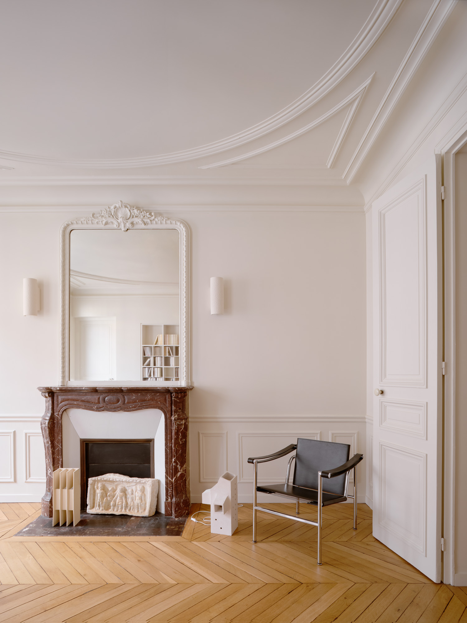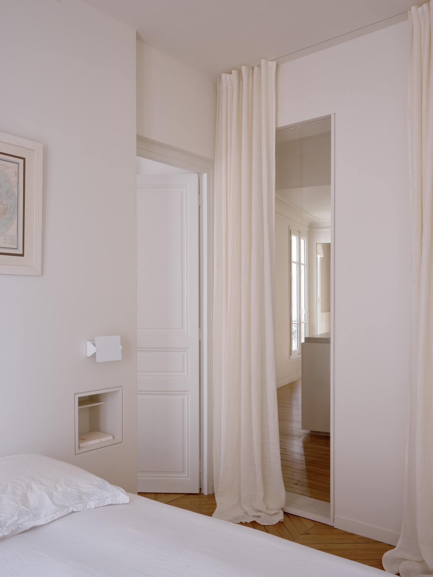 The monochrome palette draws its inspiration directly from the building’s DNA – those cream and gray limestone facades that define Parisian streetscapes. Yet rather than mimicking historical precedent, this stone-toned scheme creates a dialogue between eras. The built-in joinery and custom furnishings speak in the same tonal language as the building’s exterior, yet their clean lines and integrated lighting belong unmistakably to our moment. This approach recalls the work of John Pawson or Vincent Van Duysen, architects who understand that restraint in color can amplify richness in texture and form.