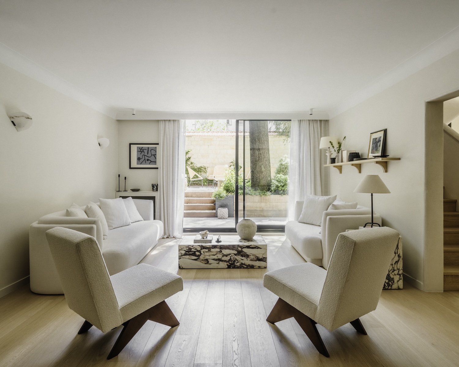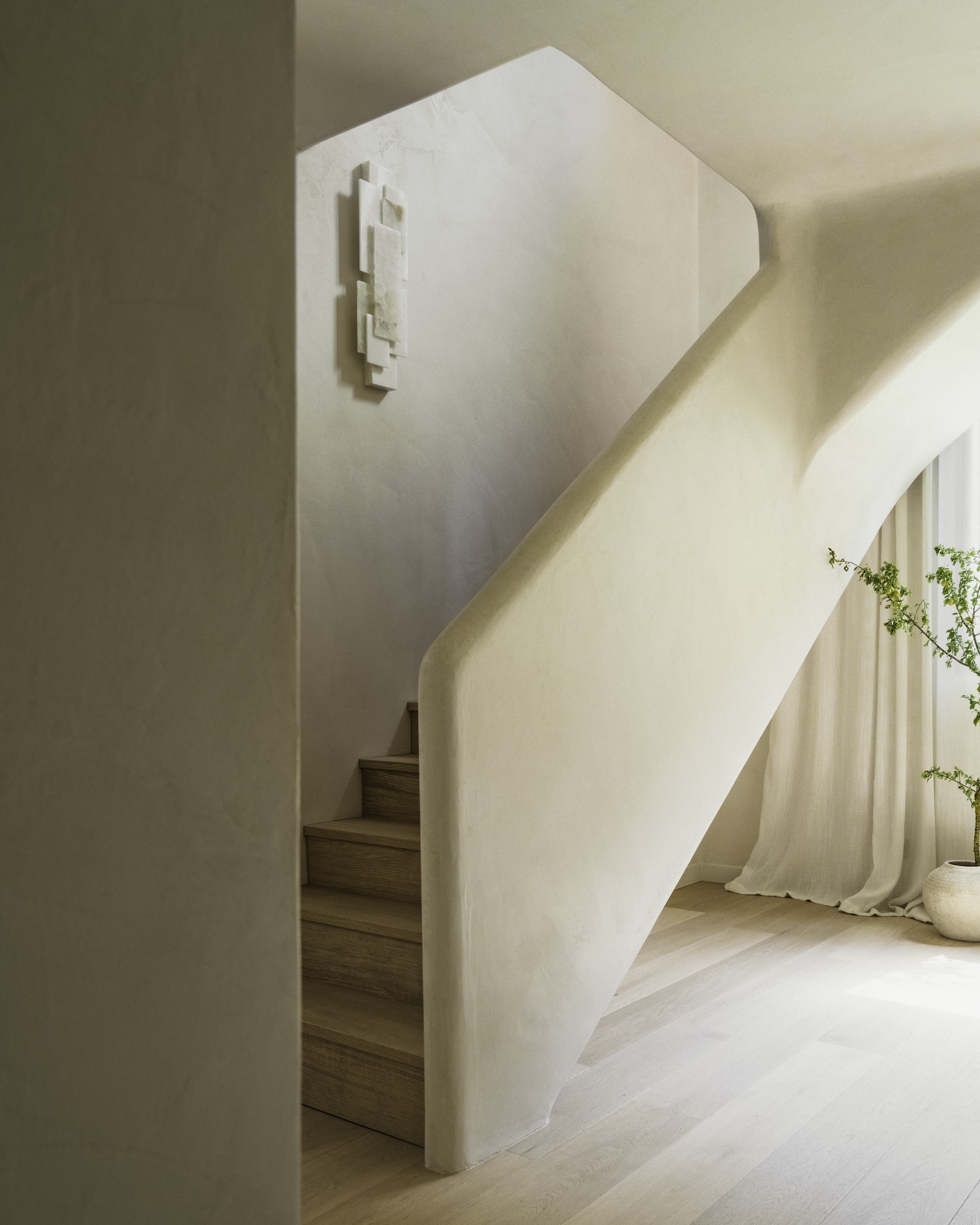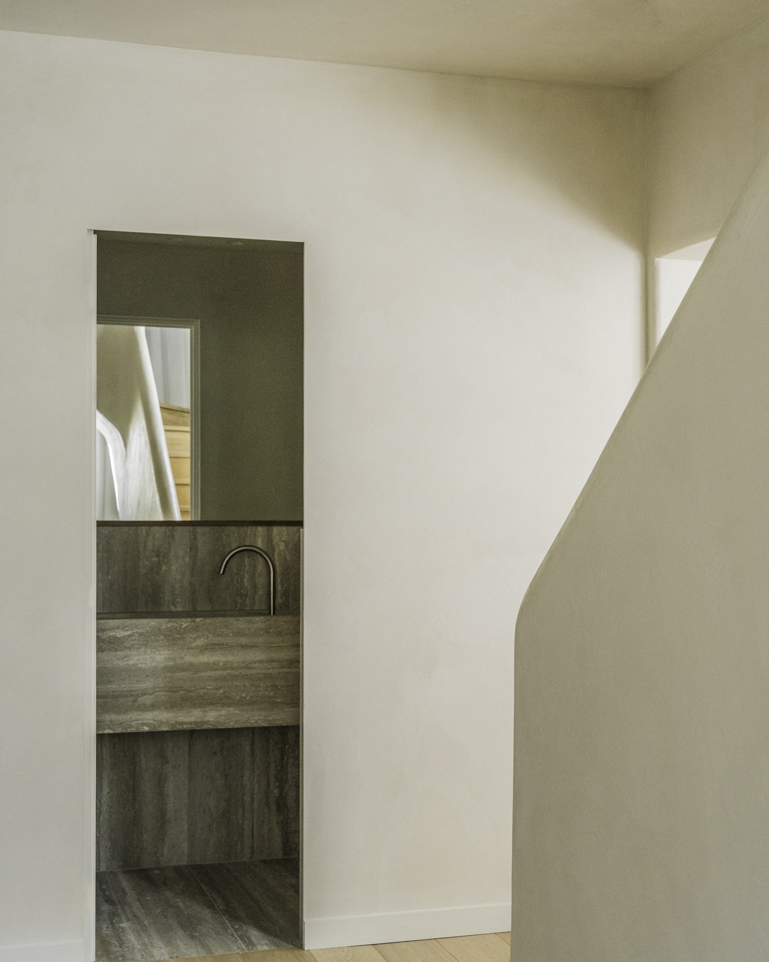 Argenson, Neuilly is a minimalist duplex located in Paris, France, designed by Johanna Amatoury. The focus was on employing warm, textural materials to foster a welcoming atmosphere that would stand in contrast to the usual urban dwelling. The designers opted for mineral-based materials, textured surfaces, and a palette of raw colors to infuse the apartment with depth and create the intended ambiance. In an innovative approach to blur the boundaries between the indoors and the surrounding nature, the design strategy included enlarging the windows. This modification was particularly pertinent given the apartment’s garden-level location, aiming to maximize exposure to the outdoors and the adjacent greenery. The choice of materials was pivotal in achieving the desired effect, with an emphasis on soft, curving plaster finishes that lend the space a sculptural quality.