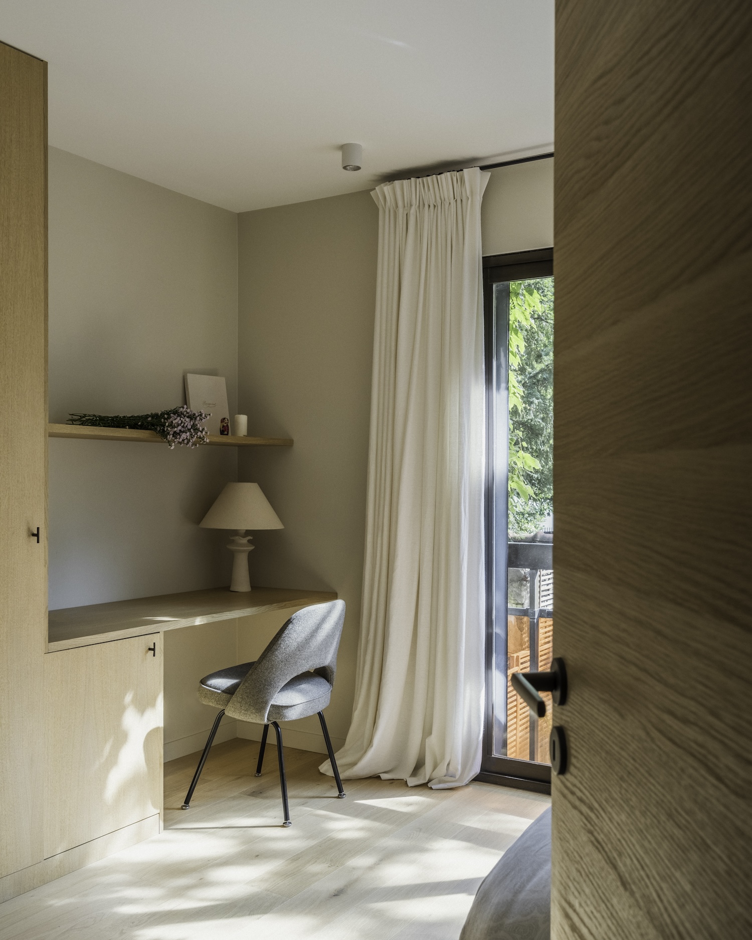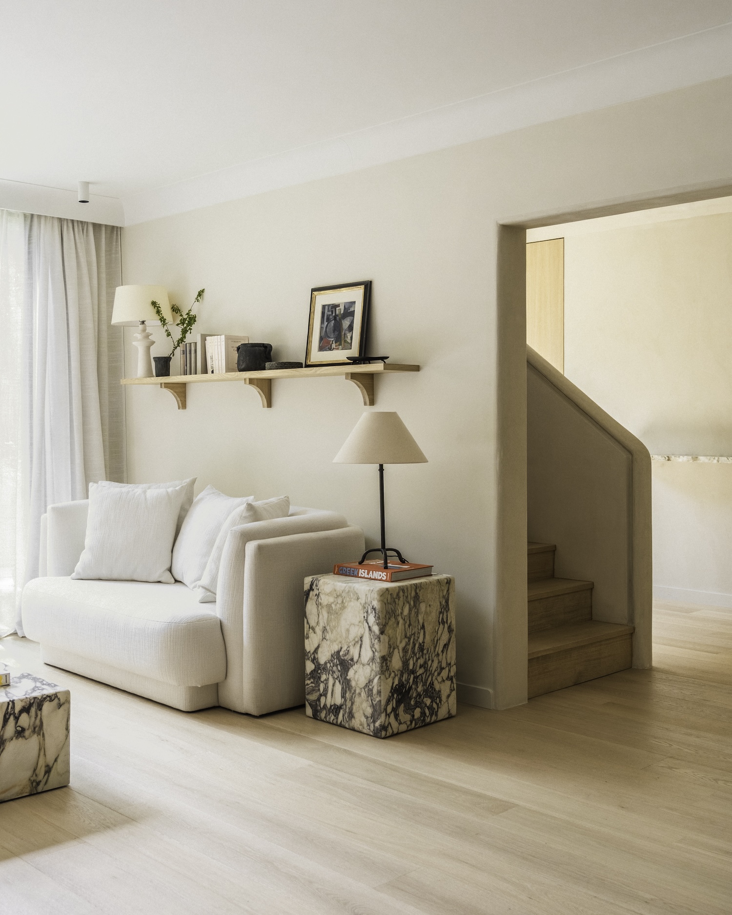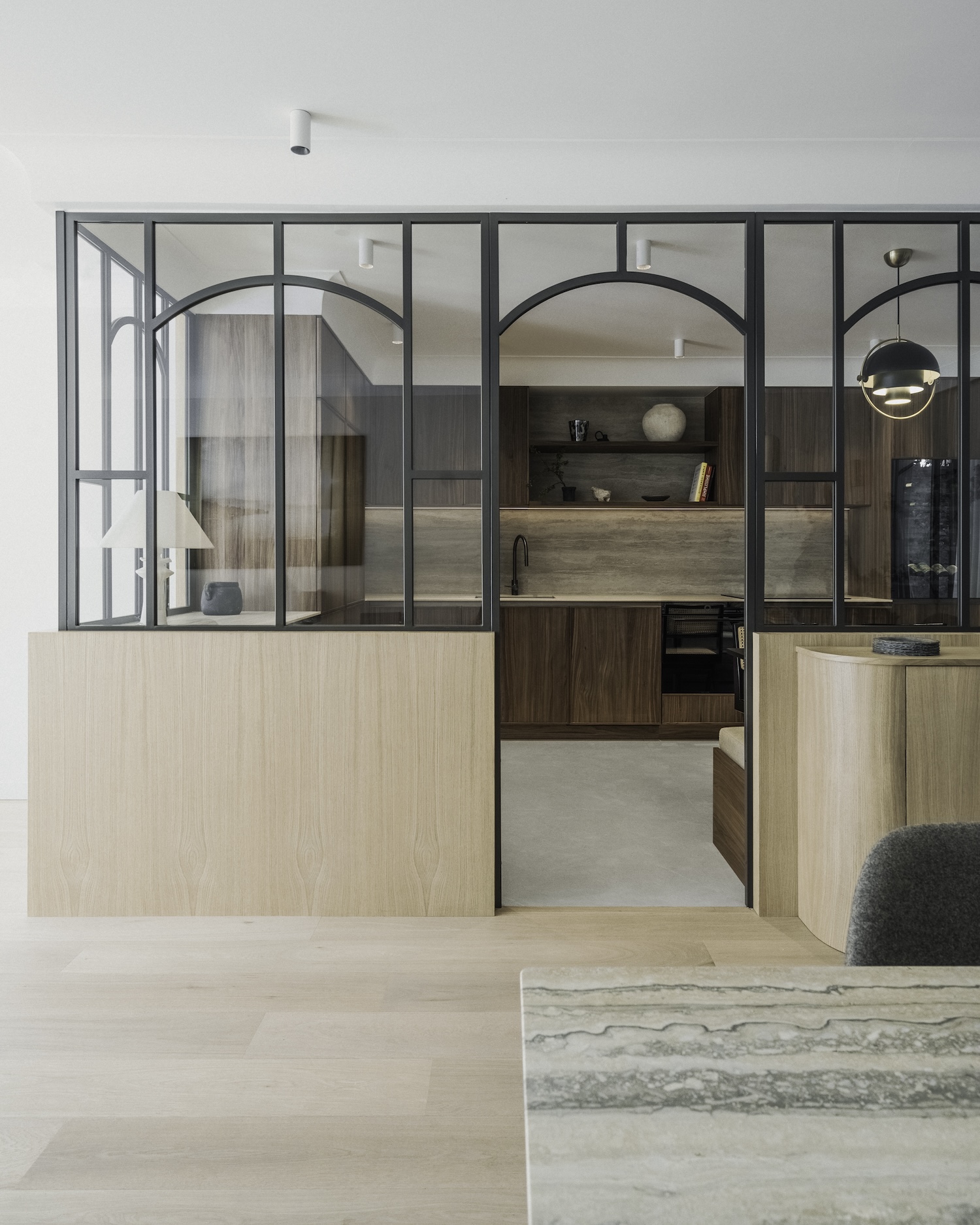 Argenson, Neuilly is a minimalist duplex located in Paris, France, designed by Johanna Amatoury. The focus was on employing warm, textural materials to foster a welcoming atmosphere that would stand in contrast to the usual urban dwelling. The designers opted for mineral-based materials, textured surfaces, and a palette of raw colors to infuse the apartment with depth and create the intended ambiance. In an innovative approach to blur the boundaries between the indoors and the surrounding nature, the design strategy included enlarging the windows. This modification was particularly pertinent given the apartment’s garden-level location, aiming to maximize exposure to the outdoors and the adjacent greenery. The choice of materials was pivotal in achieving the desired effect, with an emphasis on soft, curving plaster finishes that lend the space a sculptural quality.