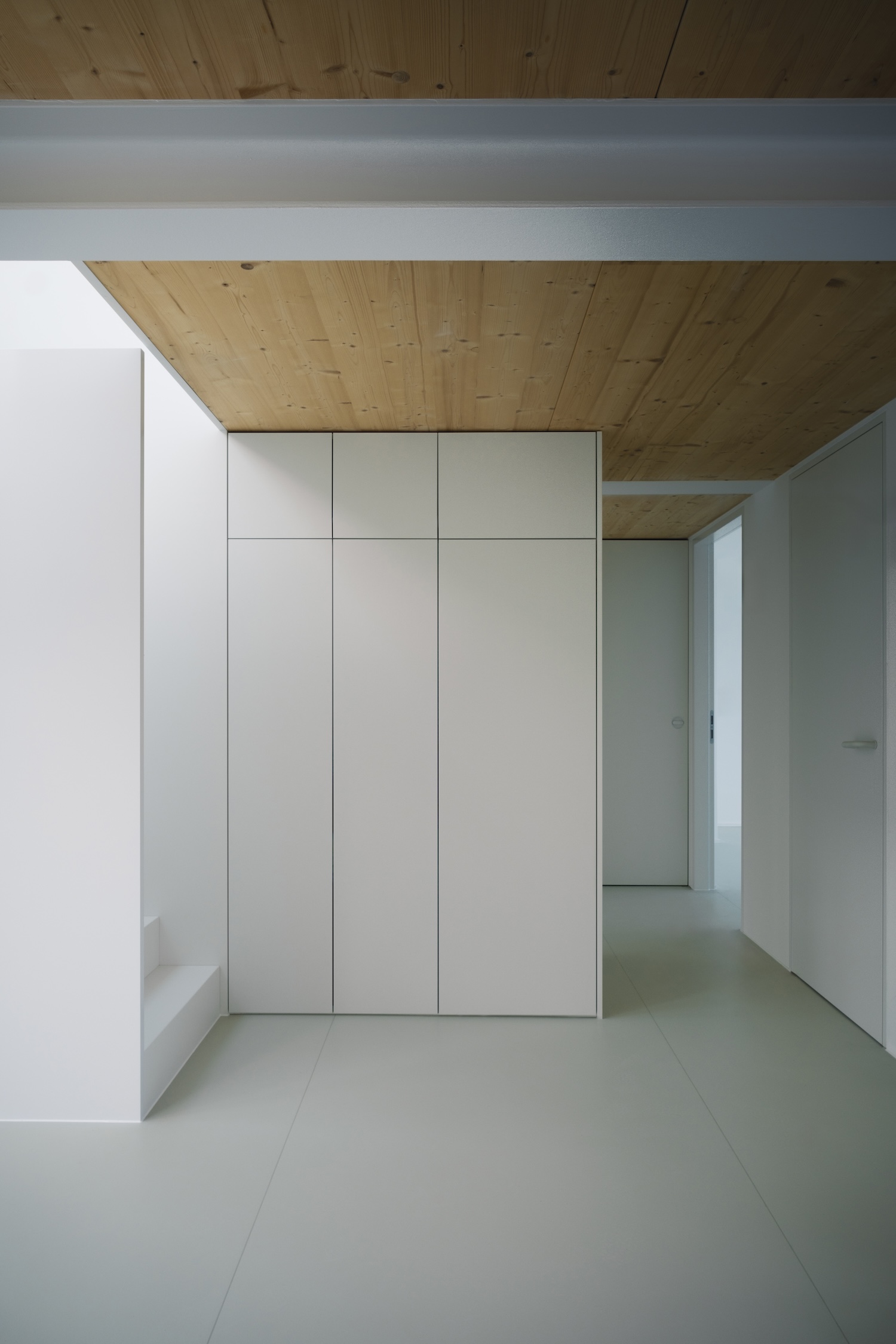 The spatial organization demonstrates careful consideration of light and function. A generous living area stretches along the north-facing façade, extending dramatically to the roof—a move that transforms potentially harsh northern light into a diffuse ambient glow ideal for gathering spaces. The central two-storey volume works as both service core and sleeping quarters, its pragmatic stacking reflecting a Japanese-influenced efficiency of means.