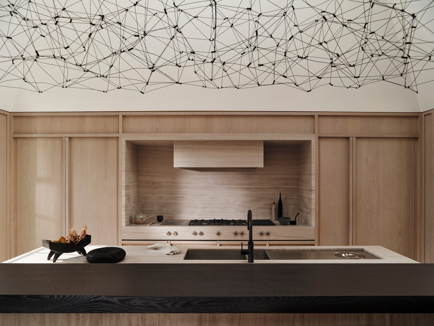 The renovation provided an opportunity to reflect the homeowners’ appreciation for British modernism, contemporary art, and bespoke European design. The property showcases an impressive collection of artworks by notable artists such as Richard Serra, Ben Nicholson, and a selection of contemporary pieces by both established and up-and-coming artists. This collection creates a dialogue between classical and modern elements, characterized by a focus on monochrome abstract minimalism and a rich variety of materials. The concept of “Gesamtkunstwerk,” or a total work of art, guided the approach to the interior design, treating all components of the space—from custom furniture to selected decorative items—as integral to a cohesive aesthetic vision. State of Craft’s commitment to custom design extended to the creation of unique furniture pieces and built-in elements, crafted in collaboration with some of England’s most skilled artisans.