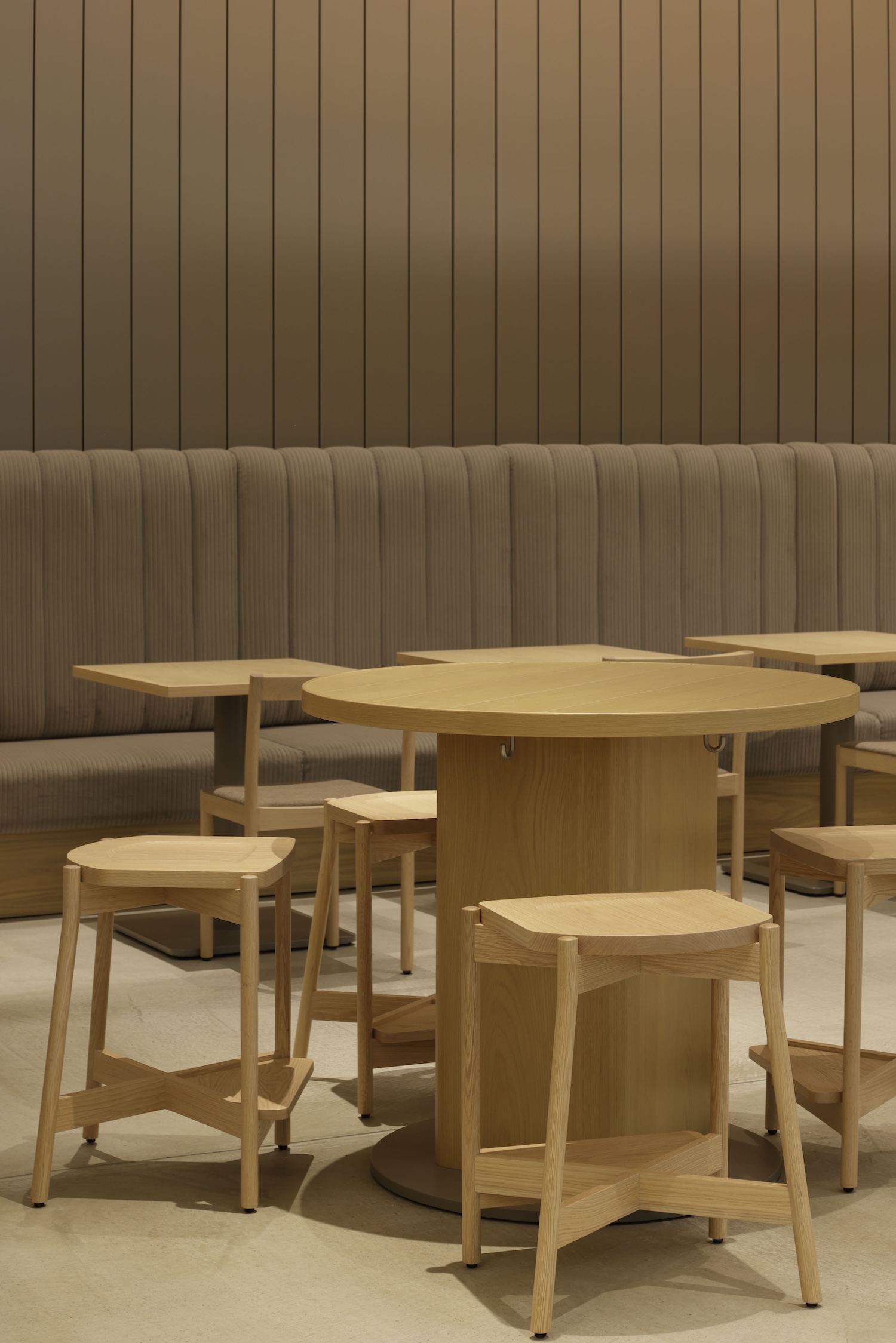 Oak wood furniture combined with brown-toned fabrics echoing aluminum coloration balances industrial metal impressions with calming atmospheric qualities necessary for extended cafe occupation. This material pairing demonstrates how hard architectural surfaces can coexist with softer furnishing elements that provide tactile warmth and acoustic absorption essential for comfortable ambient sound levels in high-occupancy spaces.