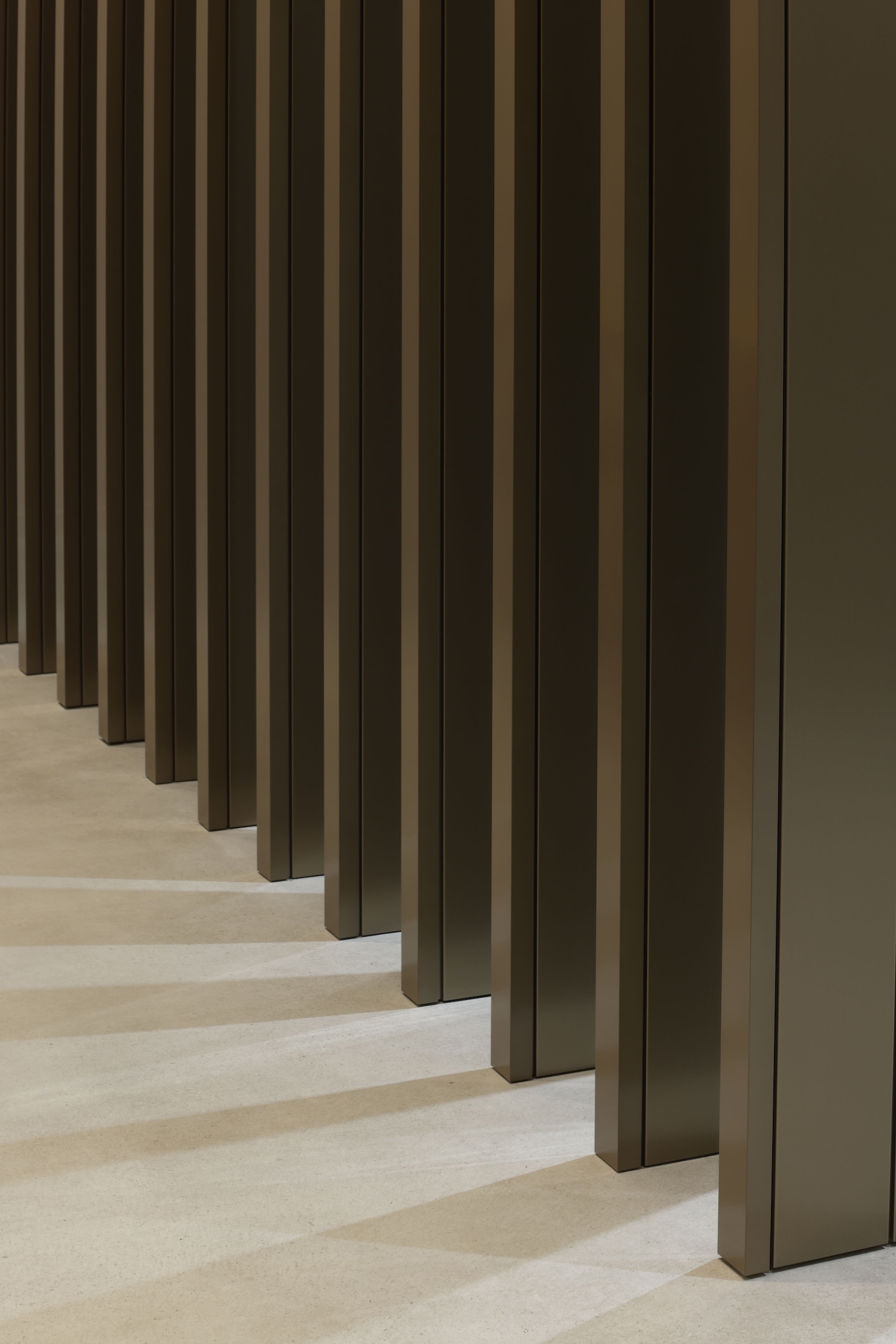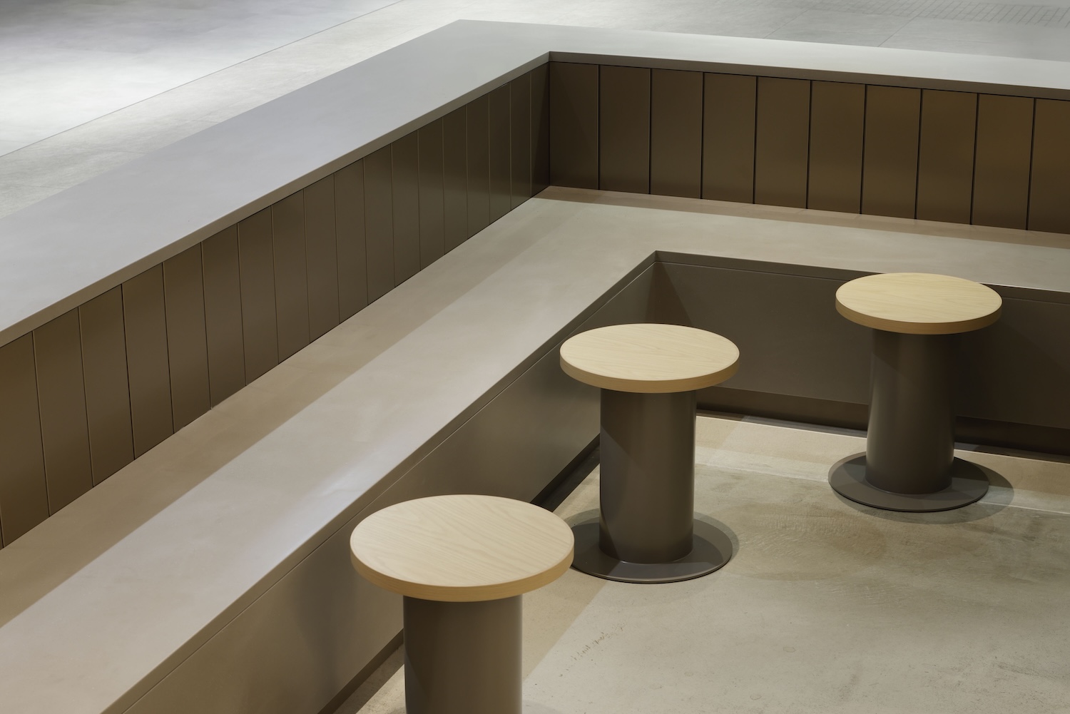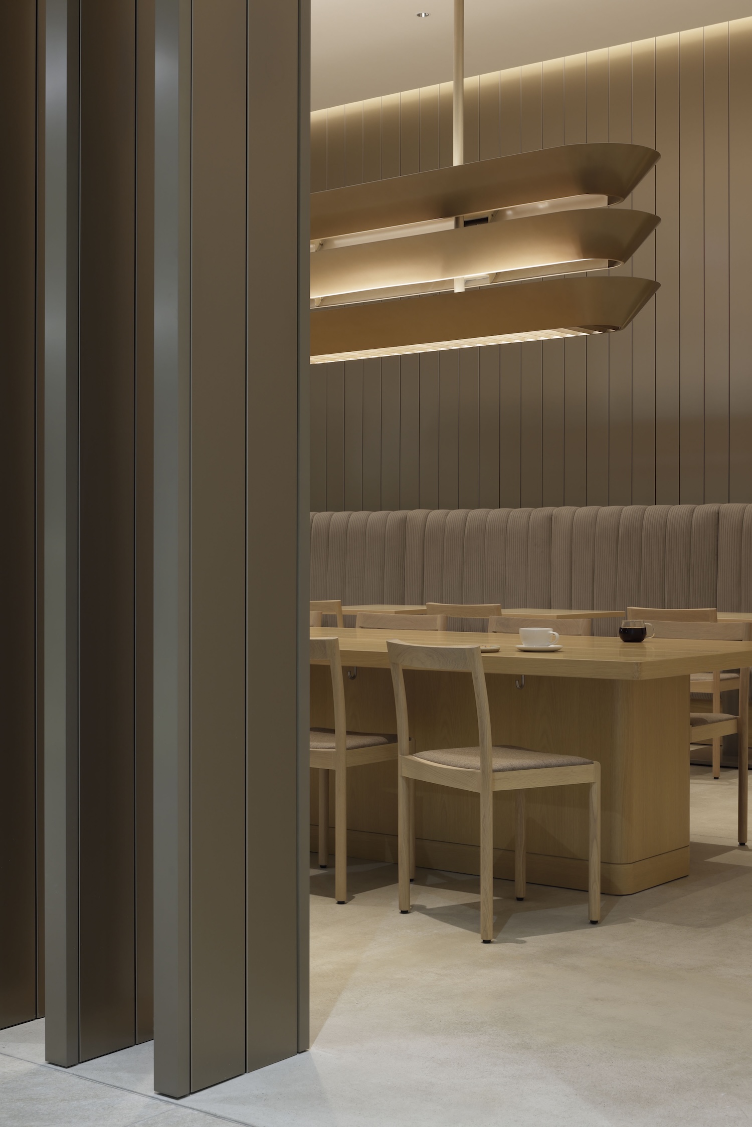 Aluminum spandrel finishes reference materials commonly deployed in transportation infrastructure including train stations, bus terminals, and airports. This material selection connects the cafe to Nagoya’s industrial heritage through automotive and aircraft manufacturing associations while establishing urban sensibility appropriate for the high-traffic mall context. The aluminum surfaces create visual continuity with the broader station environment while differentiating the cafe through deliberate material application rather than generic commercial finishes.