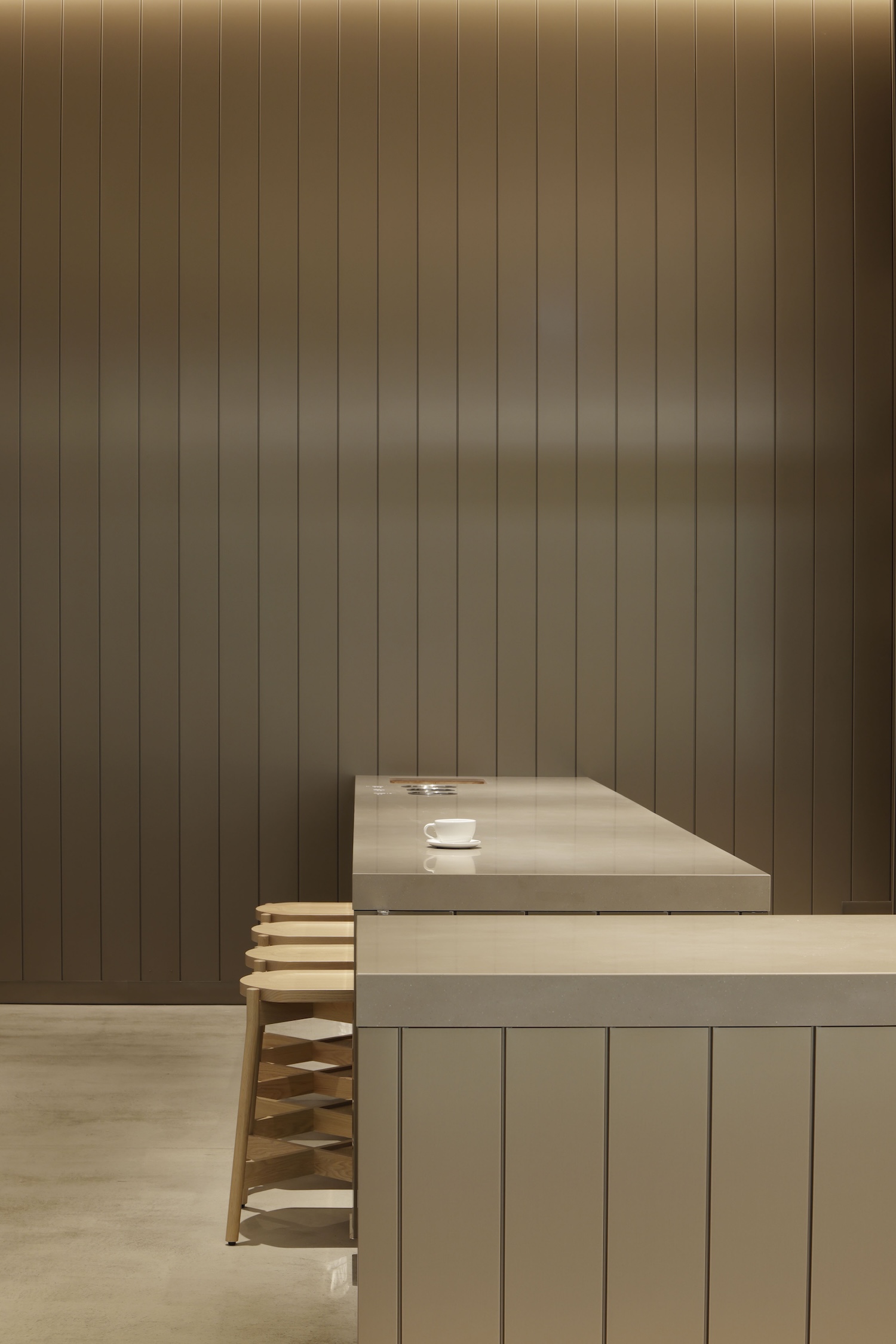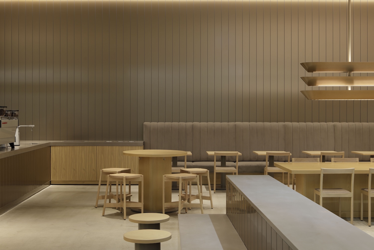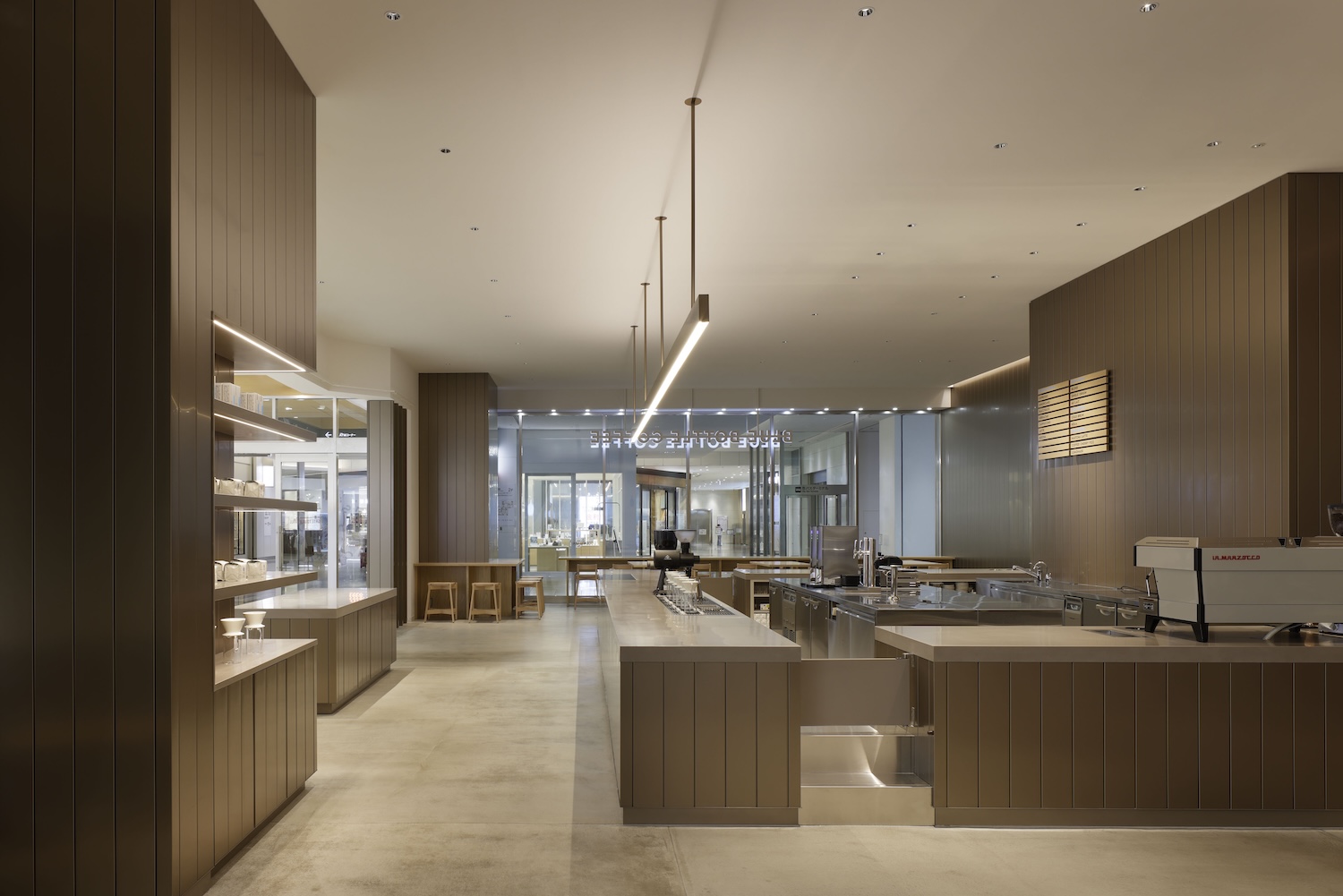 The spatial organization centers on Blue Bottle Coffee’s signature drip counter, dividing the cafe into two zones addressing different occupancy patterns. A relaxed seating area with benches, sofas, and tables accommodates extended stays while a quick seating area centered on high chairs serves brief visits between scheduled activities. This dual-zone approach acknowledges contemporary cafe functions as both destination and transitional space within urban circulation networks.
