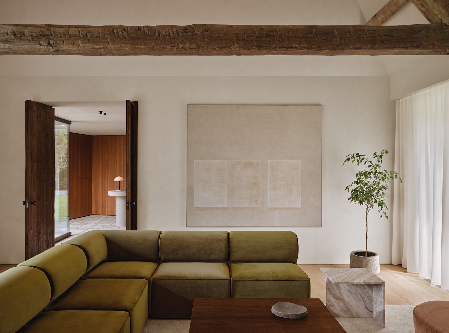 Inside, the material palette continues this dialogue between permanence and transience. Stone floors extend from exterior to interior, creating thermal mass for the geothermal system while establishing what the architects describe as “homogeneous thermal mass for all the interior spaces.” Reclaimed wood beams, adapted to new structural requirements, suspend cathedral-like volumes above the living spaces. These salvaged timbers carry their own histories – tool marks, weathering, the accumulated patina of decades – into the contemporary narrative.