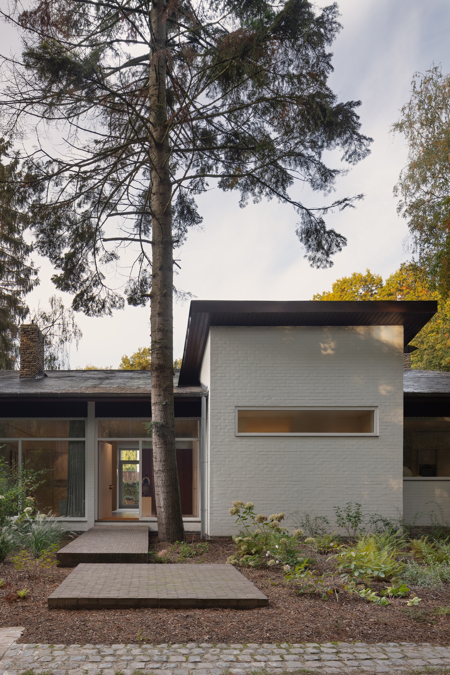 Bungalow Sint-Martens-Latem is a minimalist residence located in Sint-Martens-Latem, Belgium, designed by Decancq Vercruysse Architects. The question of what to preserve in mid-century domestic architecture often hinges on recognizing inherent spatial intelligence. This 1960s bungalow presented not a historical monument requiring reverence but a coherent architectural proposition worth sustaining – low-slung proportions, generous glazing, and an open relationship with its wooded site. Decancq Vercruysse approached the renovation by identifying which original gestures still functioned effectively and which required recalibration for contemporary family living.