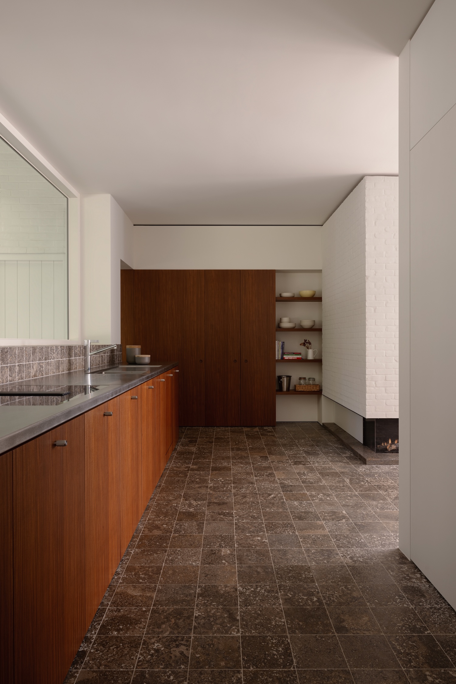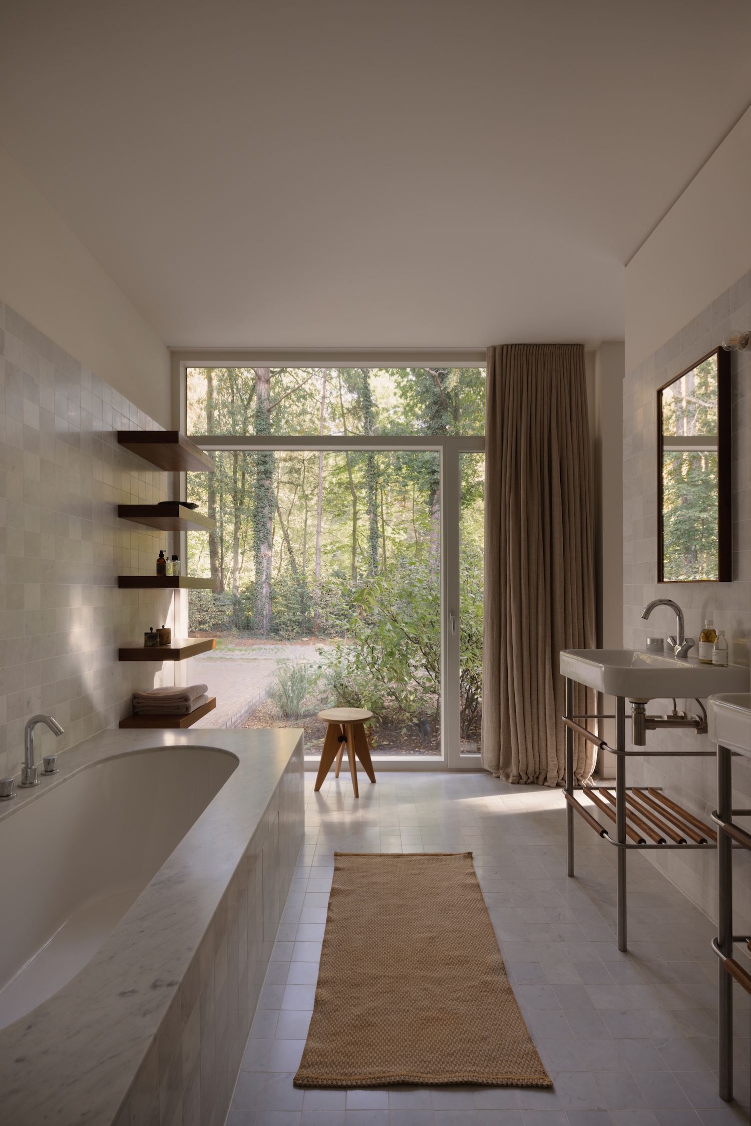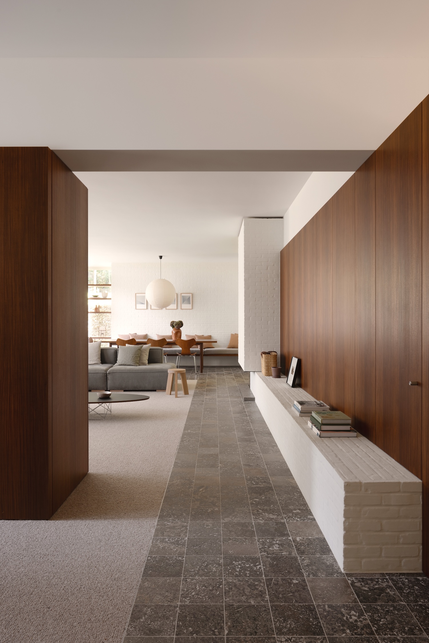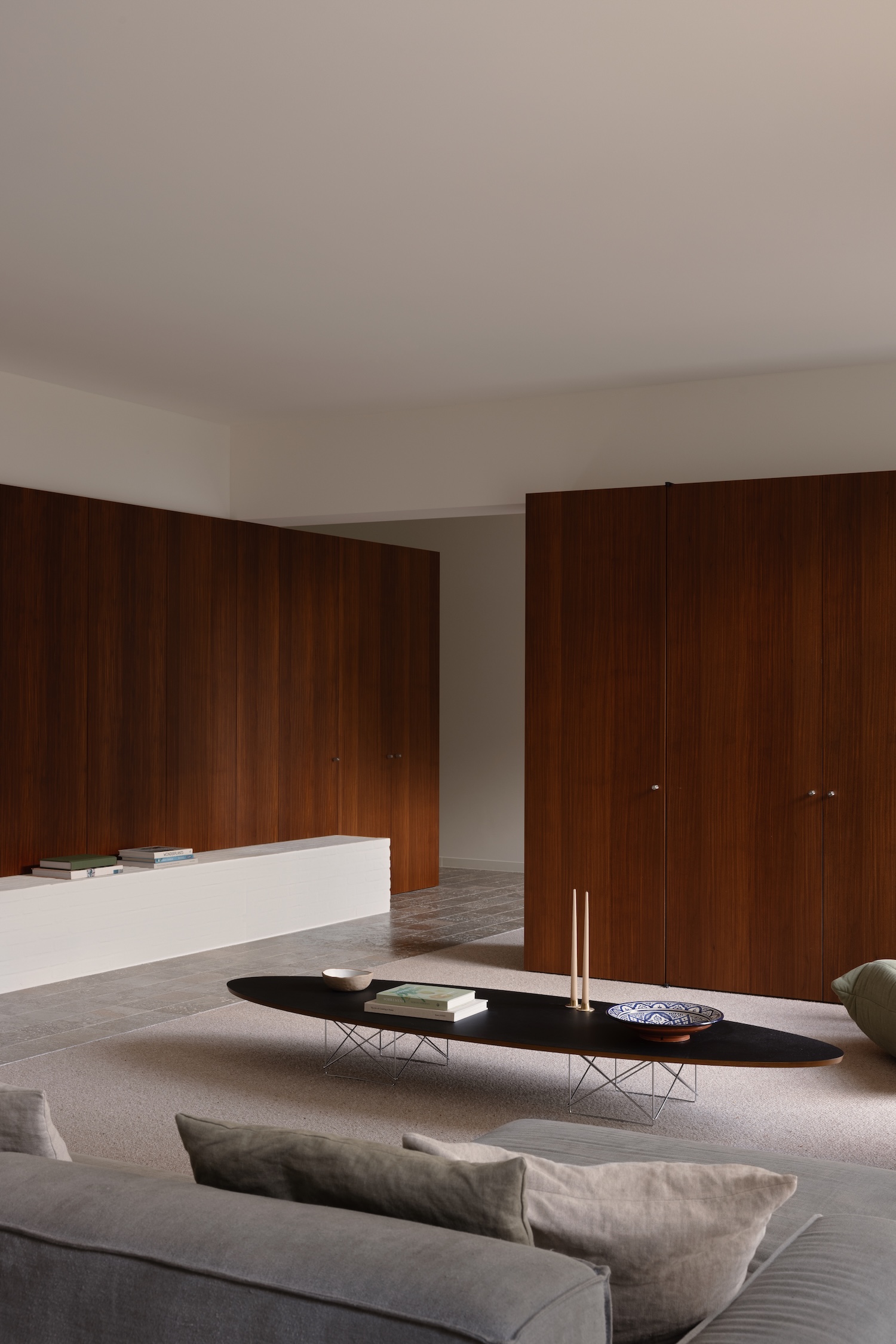 Custom fabrication played a crucial role in marrying old and new. Stainless steel details – likely in kitchen and bathroom applications – introduce precision and durability without stylistic friction. Afromosia veneer, a tropical hardwood prized for its stability and rich amber tones, appears in joinery and possibly furniture elements. This species carries particular resonance in Belgian design history, frequently employed in mid-century interiors for its ability to age gracefully while maintaining structural integrity. Its inclusion here suggests attention to material longevity rather than mere aesthetic matching.