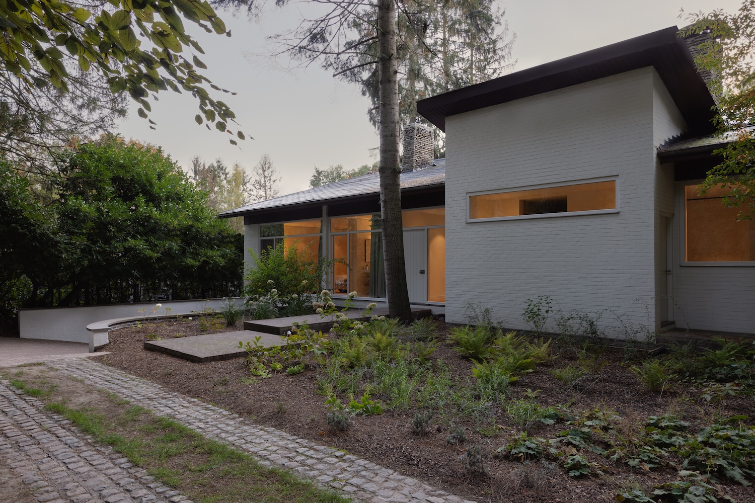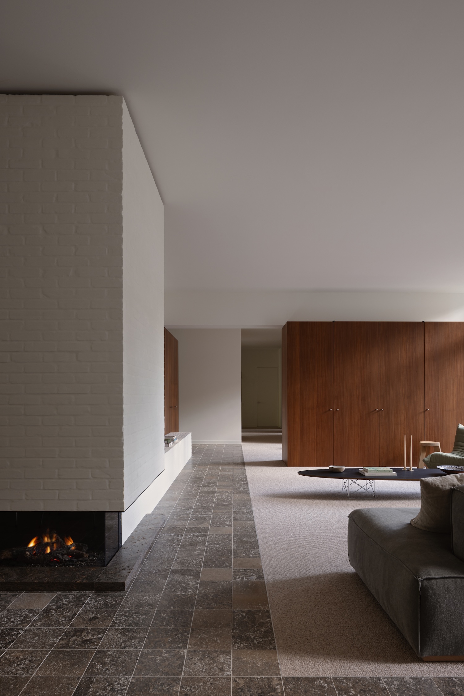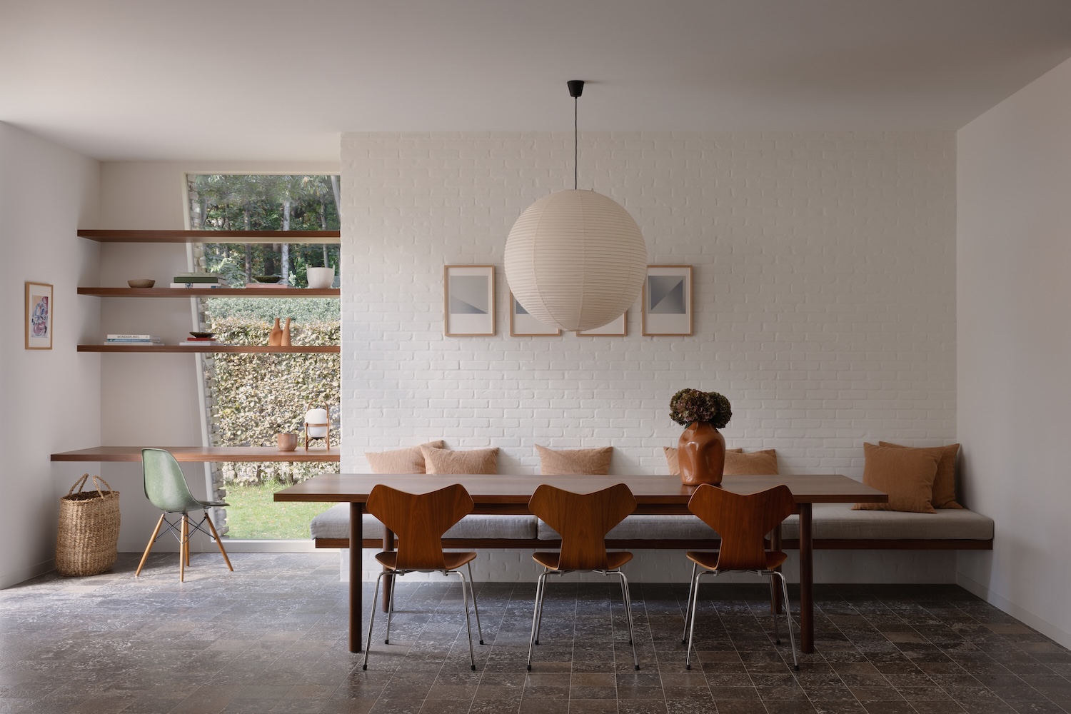 The architects concentrated their exterior interventions on refining the building’s horizontal expression. Repositioning the entrance clarified circulation while window compositions were adjusted to better frame views and balance daylight distribution. A subtle roofline modification reinforces the bungalow’s relationship to the ground plane, a characteristic feature of period domestic modernism that often gets compromised in well-meaning updates. These moves demonstrate restraint – each change serves the existing architectural language rather than imposing new formal ideas.