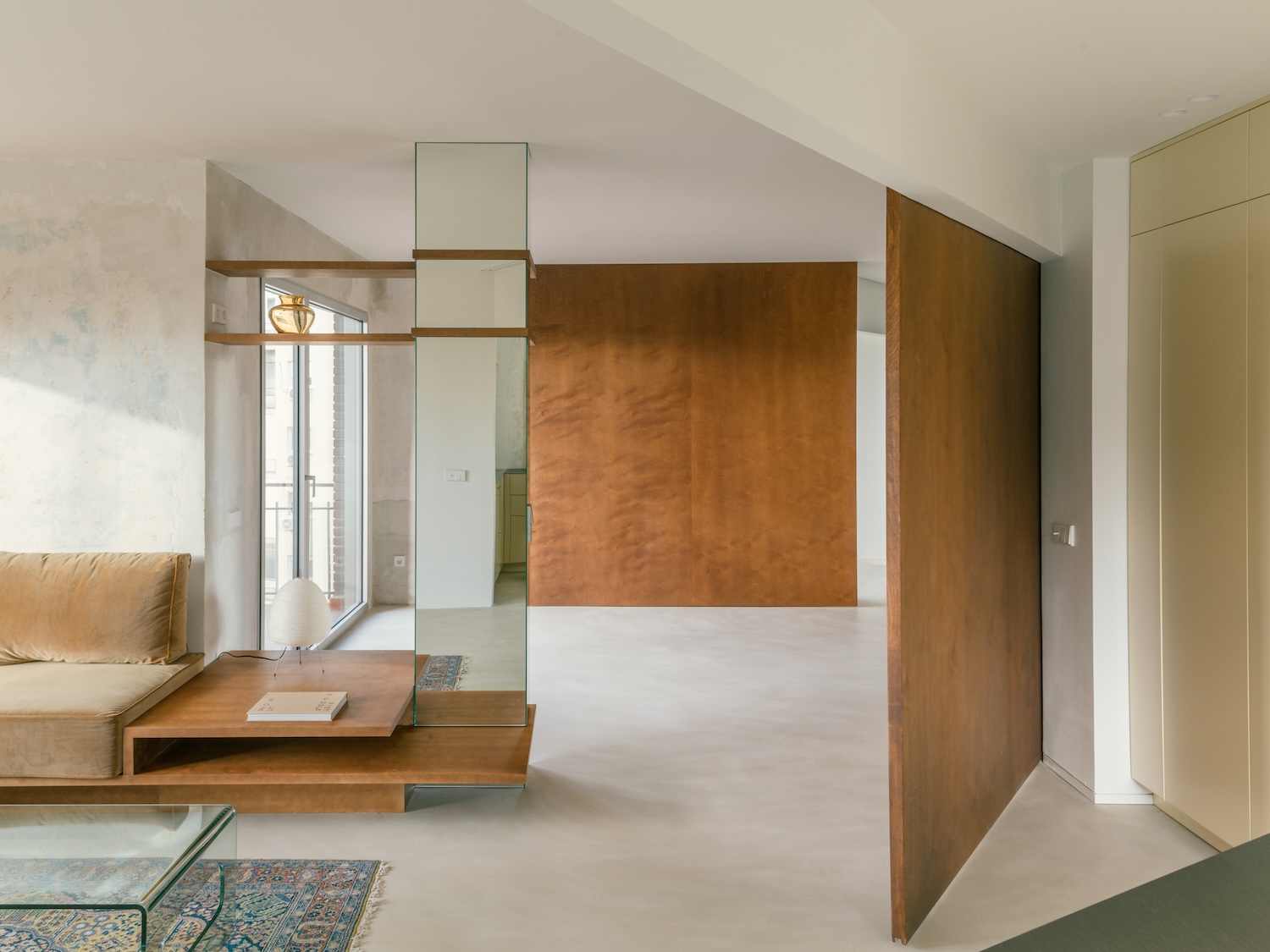 A diagonal cutting through original structure on plan reflects existing framework diverting paths, shifting axes, breaking inherited orthogonality’s rigidity. What once were limits become transitions, demonstrating how non-orthogonal organizational strategies can create spatial dynamism within rectilinear building envelopes. This diagonal intervention challenges typical Madrid apartment plans organized around central corridors with perimeter rooms, instead creating varied circulation paths and spatial relationships.