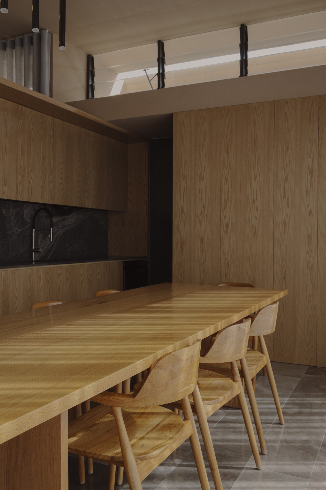 The home’s layout prioritizes open spaces, each with a distinct character. On the ground floor, these areas lead from the entrance to the social spaces, where the kitchen and dining room connect to a rear patio that bathes the double-height interiors in light. The textured walls are balanced by the warmth of light-toned carpentry, adding a subtle touch of softness. At the core of the design is the idea of fostering intimacy through a sequence of spatial transitions. Each area flows from dark, enclosed spaces to bright, open ones, offering varied experiences as one moves through the home. This dynamic is felt throughout all three levels, where transitions from confined areas to expansive spaces invite a deeper connection with the natural elements—light, wind, rain, and sky—that frame the living experience.