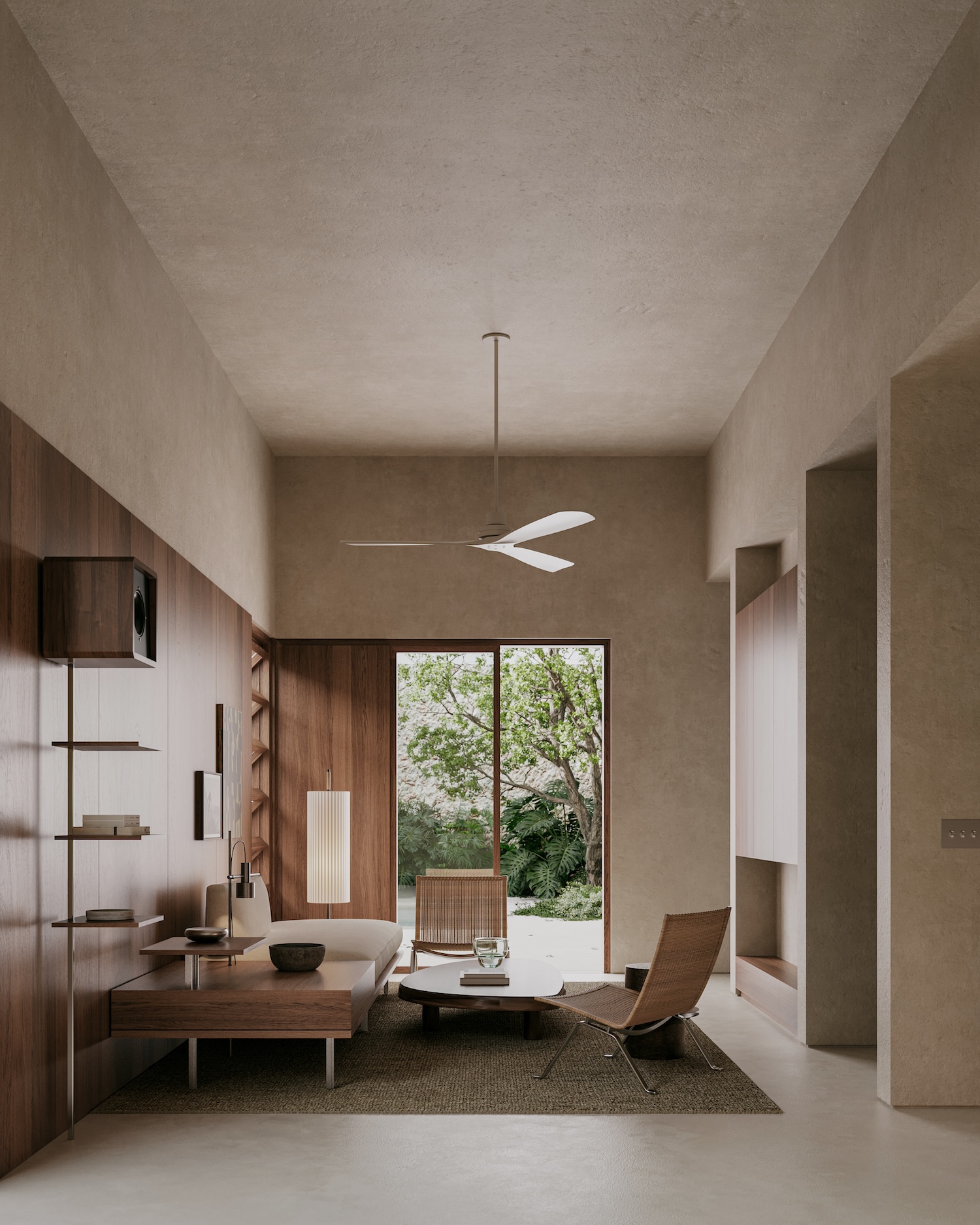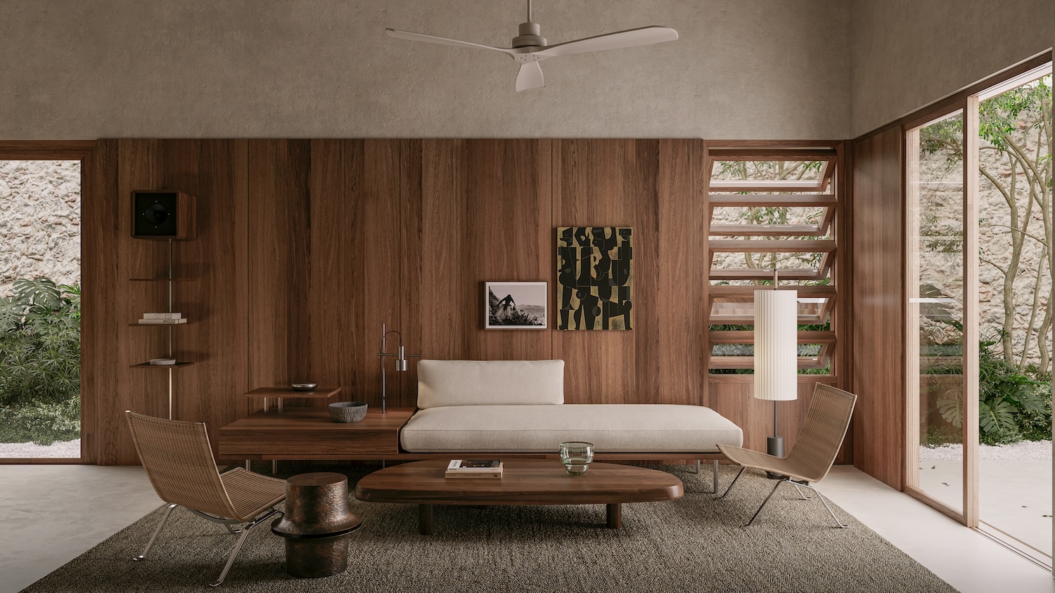 Main entrance leads directly to social house core where living and dining areas unfold in double height enhancing openness sense and visual exterior connection. Living room wood paneling creates enveloping atmosphere while refined material mix adds freshness and character with custom surround-sound system featuring cedar-wood speakers enhancing spatial experience. Large windows open toward terrace and pool with cedar woodwork incorporating louver systems and sliding panels regulating ventilation and privacy, demonstrating sophisticated environmental control appropriate for Yucatán’s hot humid climate.