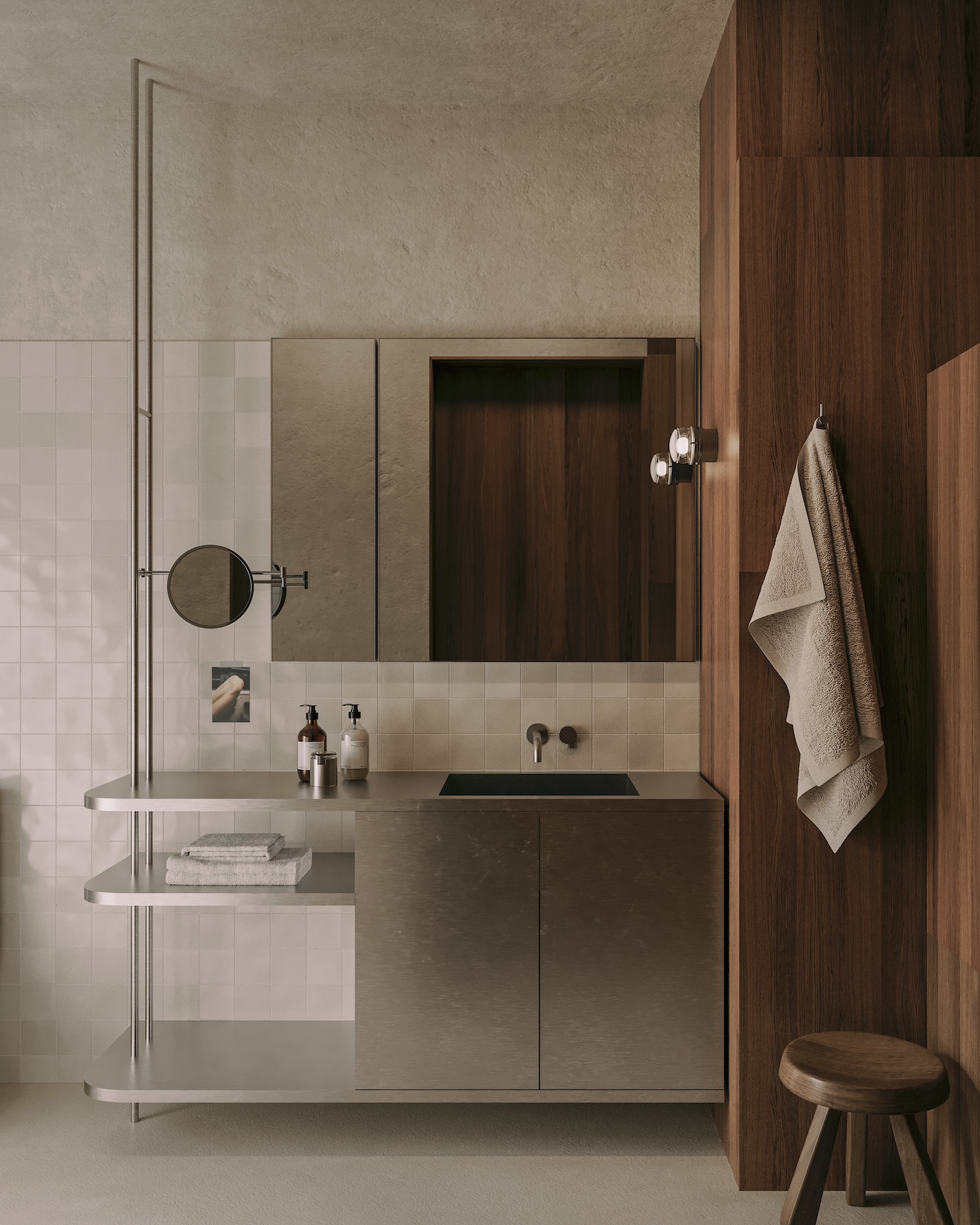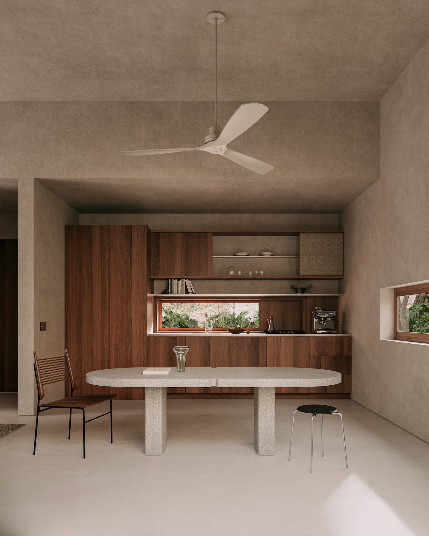 The dining area anchors around monolithic concrete table complemented by wood kitchen with stainless-steel countertop where open shelving replaces traditional cabinetry emphasizing functional simplicity. Every furniture piece receives careful selection reinforcing project identity, demonstrating how material restraint and functional clarity can establish character without requiring decorative elaboration. The concrete table demonstrates material courage where industrial construction material receives refined residential application through careful finishing.