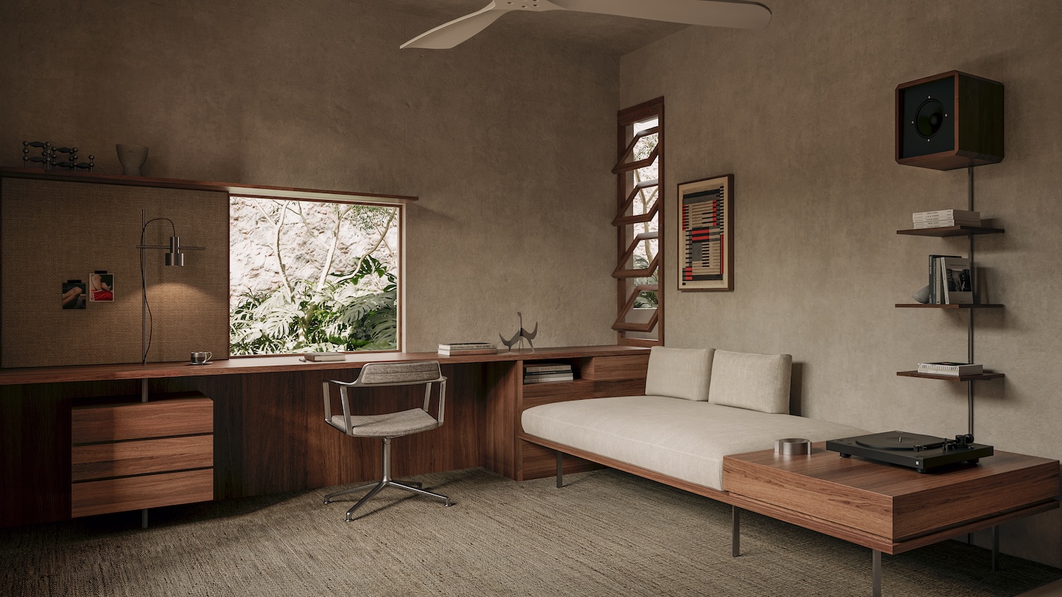 Ground floor study conceives as natural architecture extension through integrated furniture, cantilevered elements, and sliding panels allowing space adapting to user needs. Mid-century aesthetic furnishings intentionally contrast with structure’s brutalist expression generating balanced visual tension, demonstrating how stylistic juxtaposition can create spatial interest when coordinated through consistent material quality and proportional relationships preventing discord.