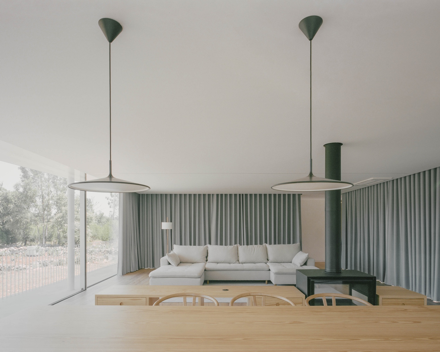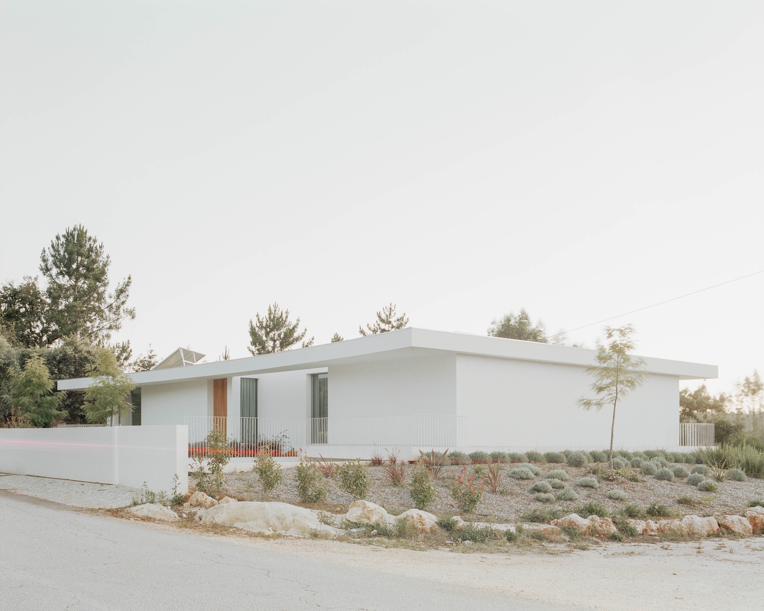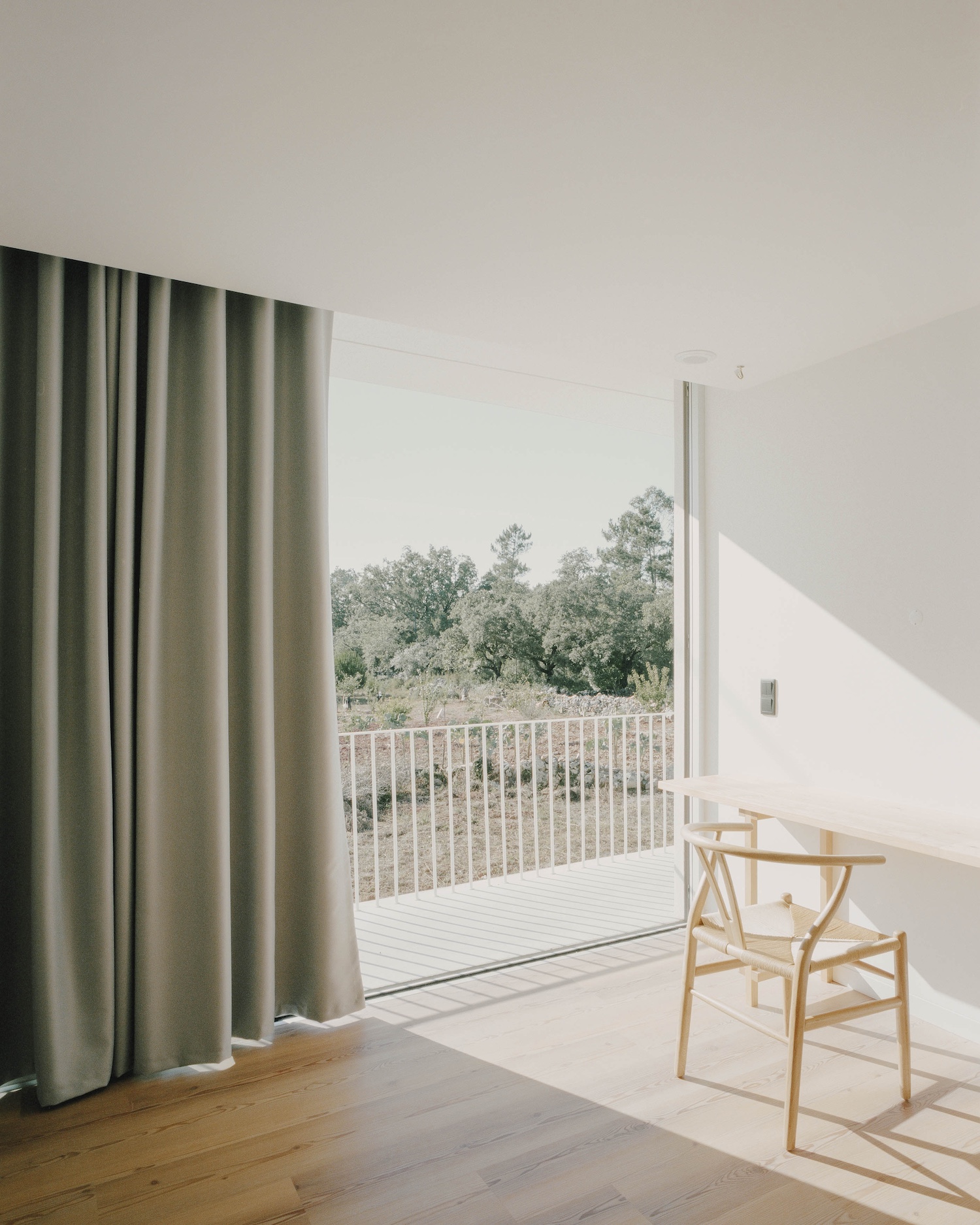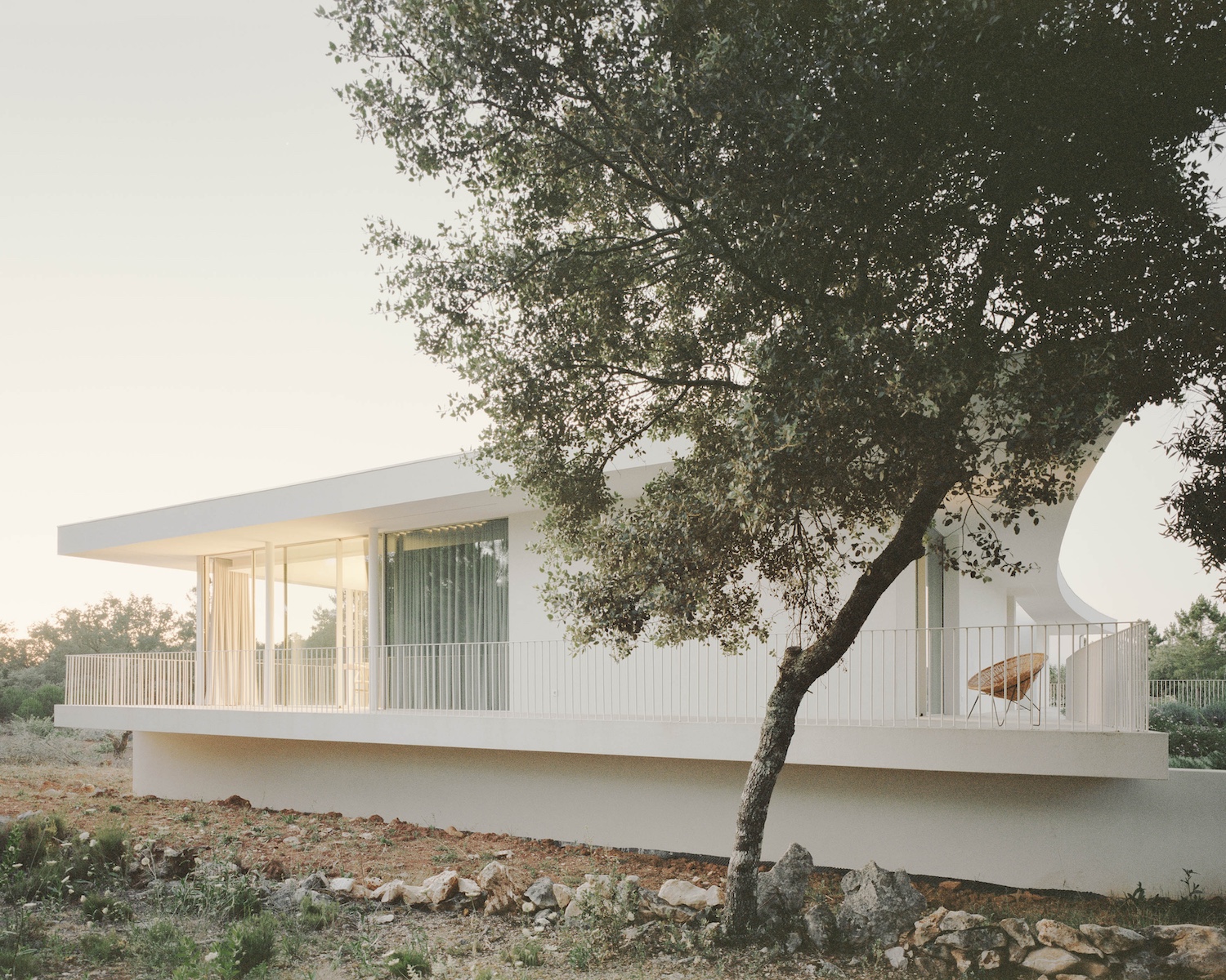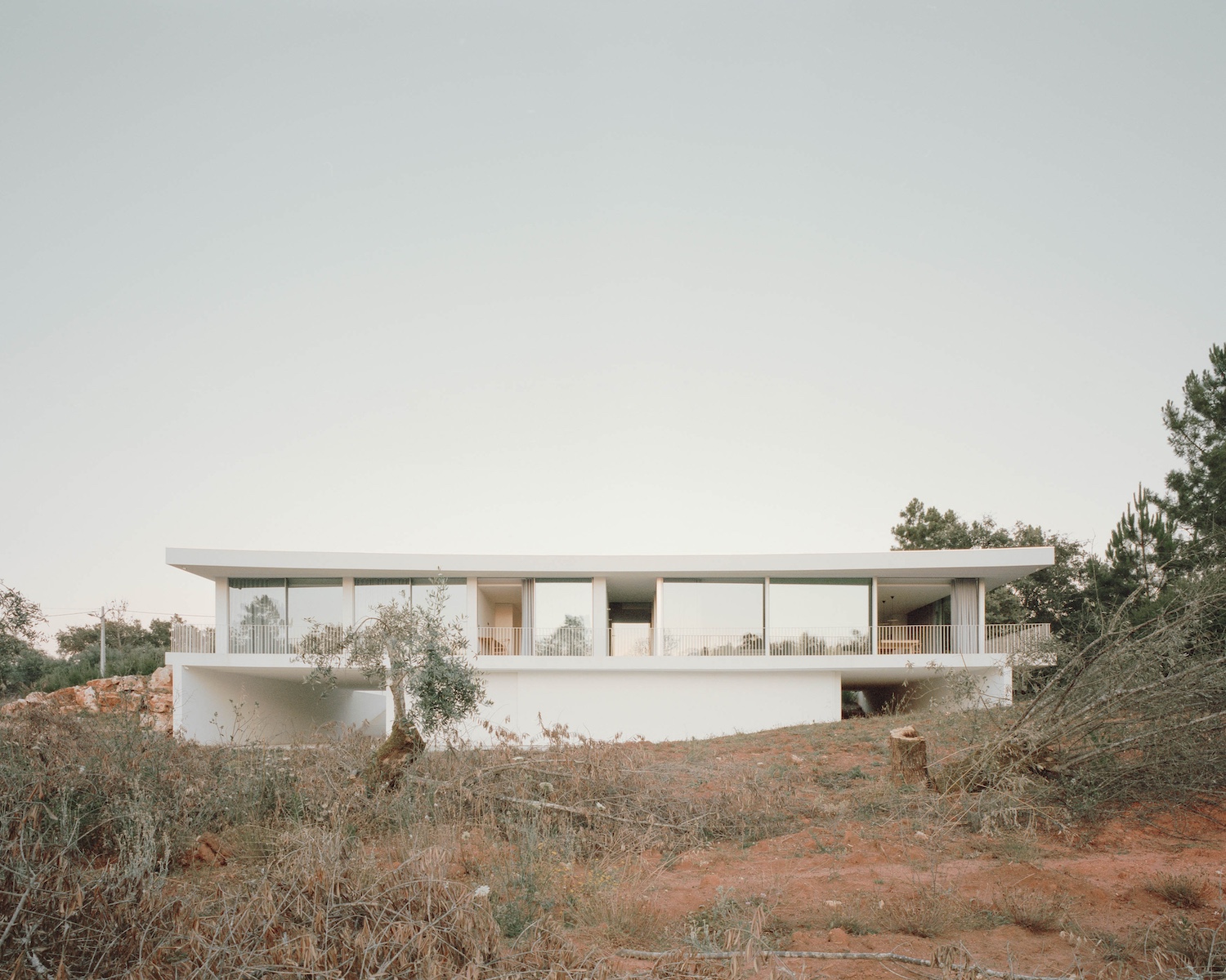 Casa Moita Santa is a minimal residence located in Ansião, Portugal, designed by Bruno Dias Arquitectura. The property, set amidst oak trees and scattered stone piles, reflects the client’s need for privacy from the nearby public road and the inclusion of a basement. The design approach aimed to conceal the basement from street view, elevating the first floor in a way that gives the impression of a structure lightly hovering above the ground, supported by just four key structural elements. The design incorporates slightly curved slabs that follow the line of the adjacent road, contributing to the building’s integration into its environment. With privacy as a priority, the house is oriented to minimize exposure to the public, while large openings on the interior side of the property allow for ample natural light.