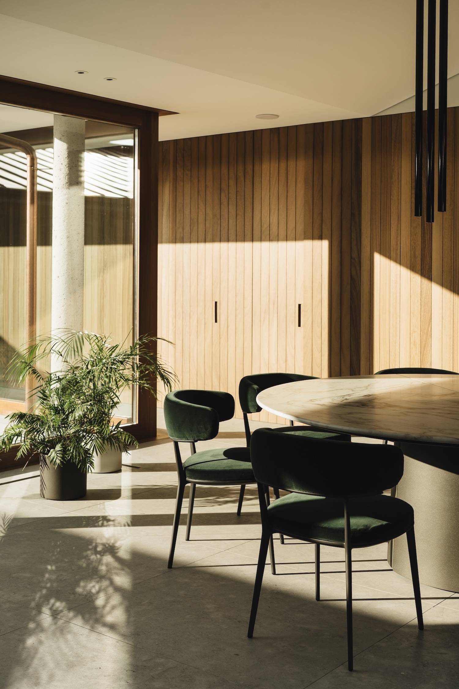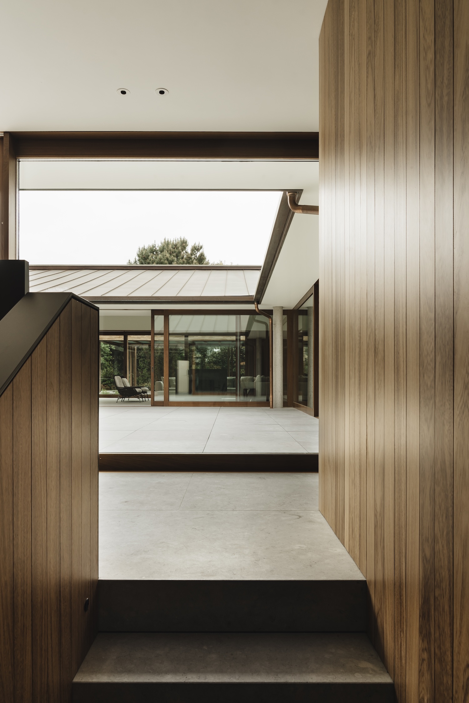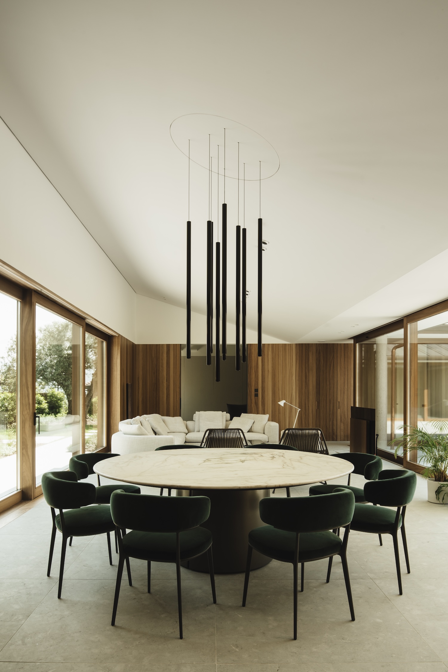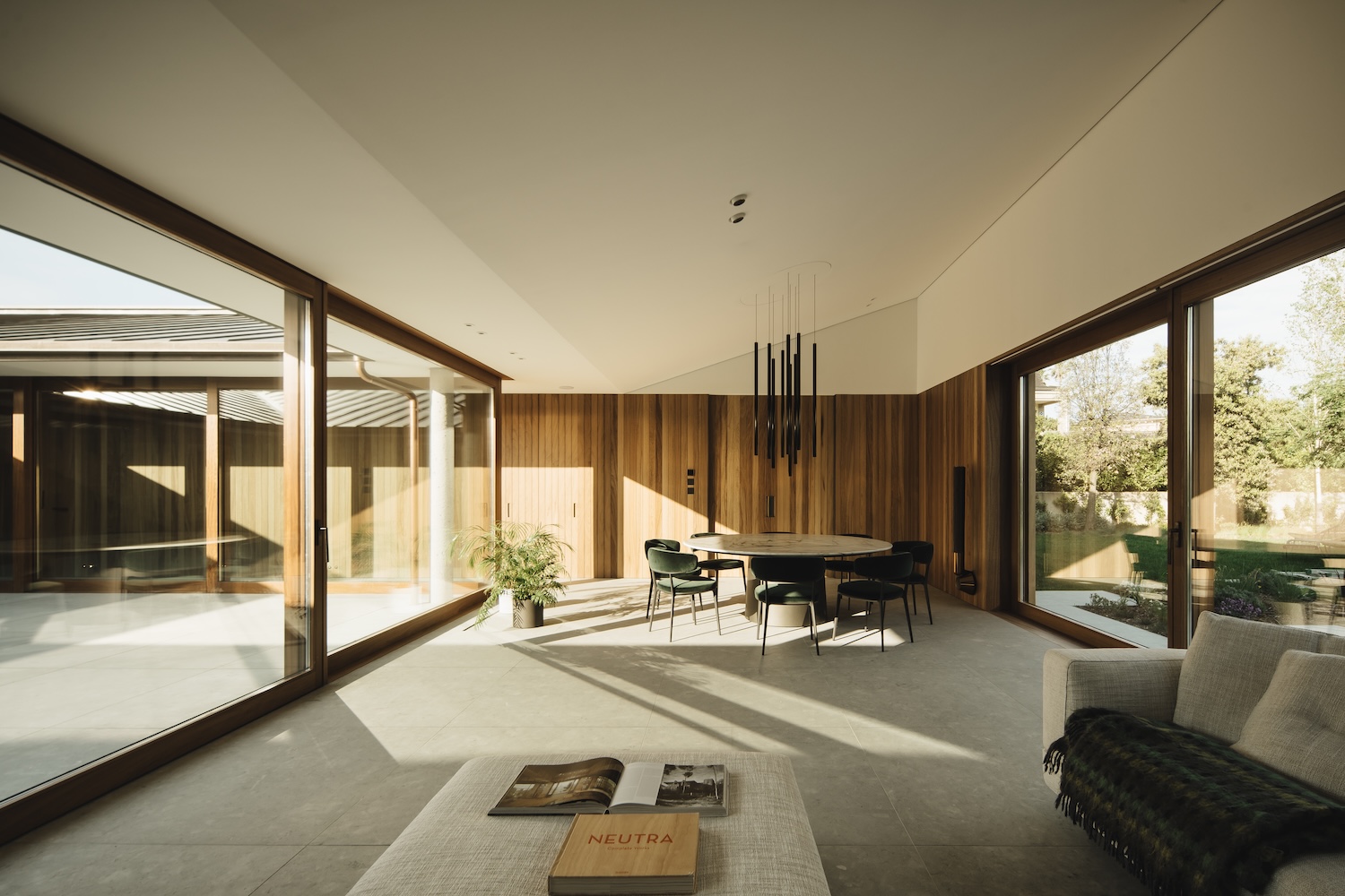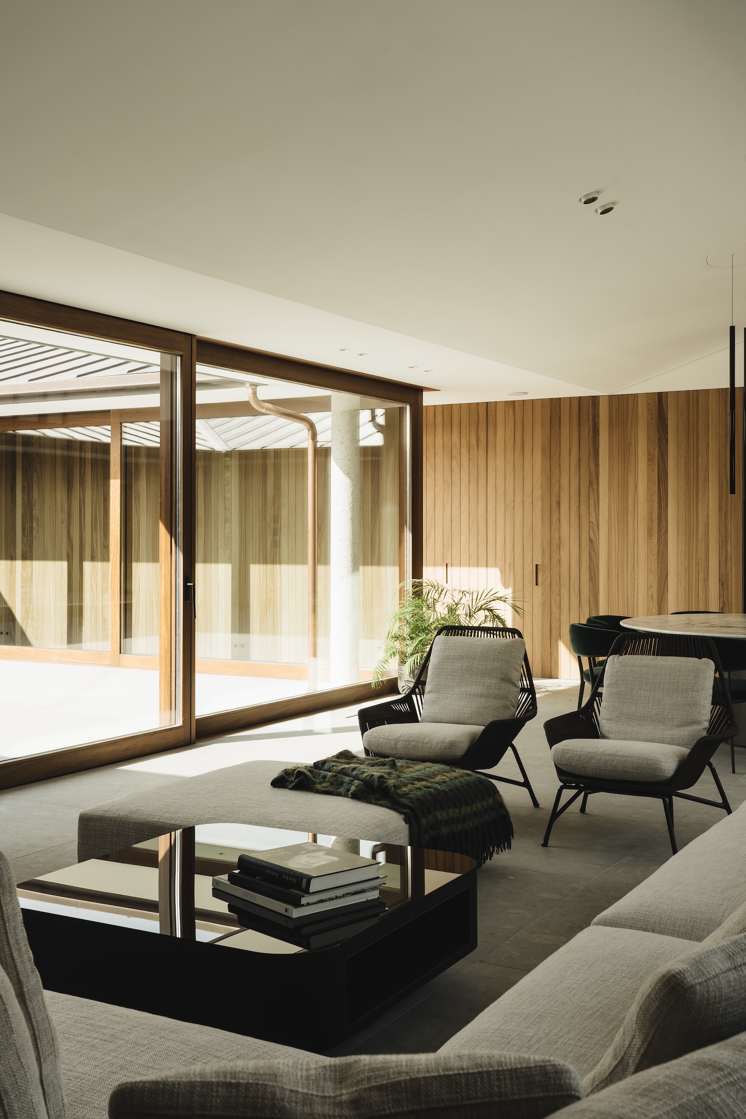 The courtyard operates as an inverted facade – where the street-facing walls remain largely closed, the interior perimeter dissolves into floor-to-ceiling glazing. This creates what the architects describe as facing rooms, where the entrance hall and living room confront each other across the void, multiplying perceived depth. The spatial logic follows historical patio house typologies from Mediterranean and Islamic architecture, where domestic life organizes around a protected outdoor room rather than relating primarily to the street.