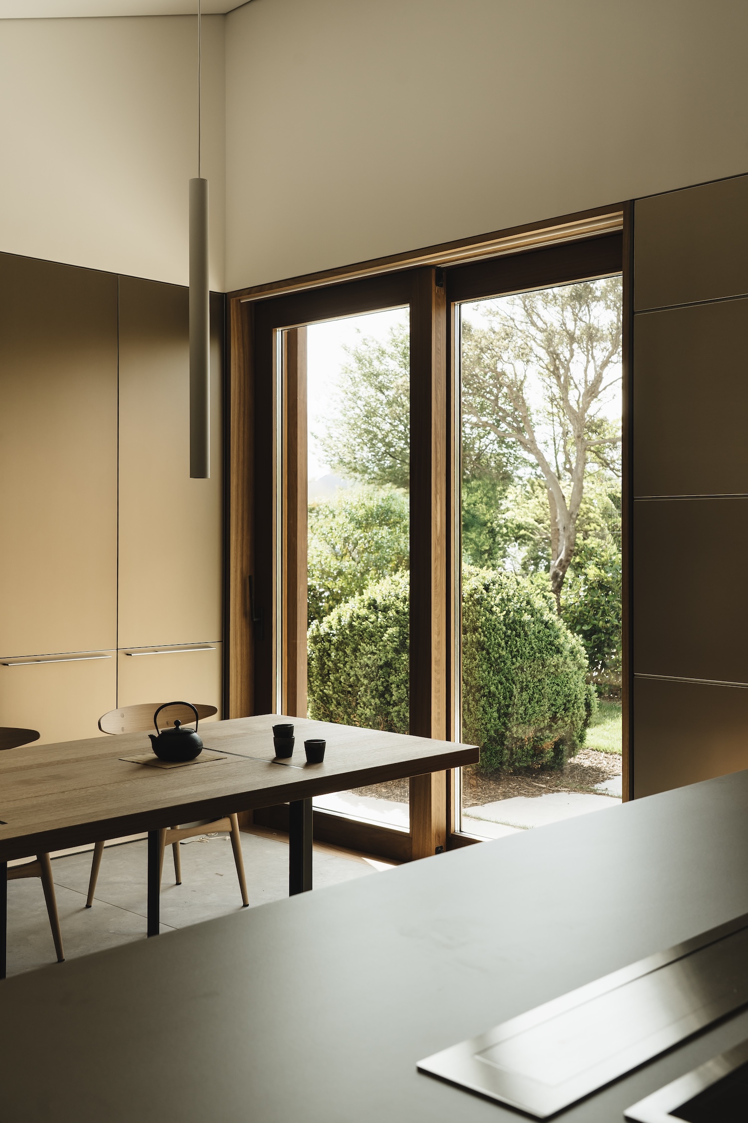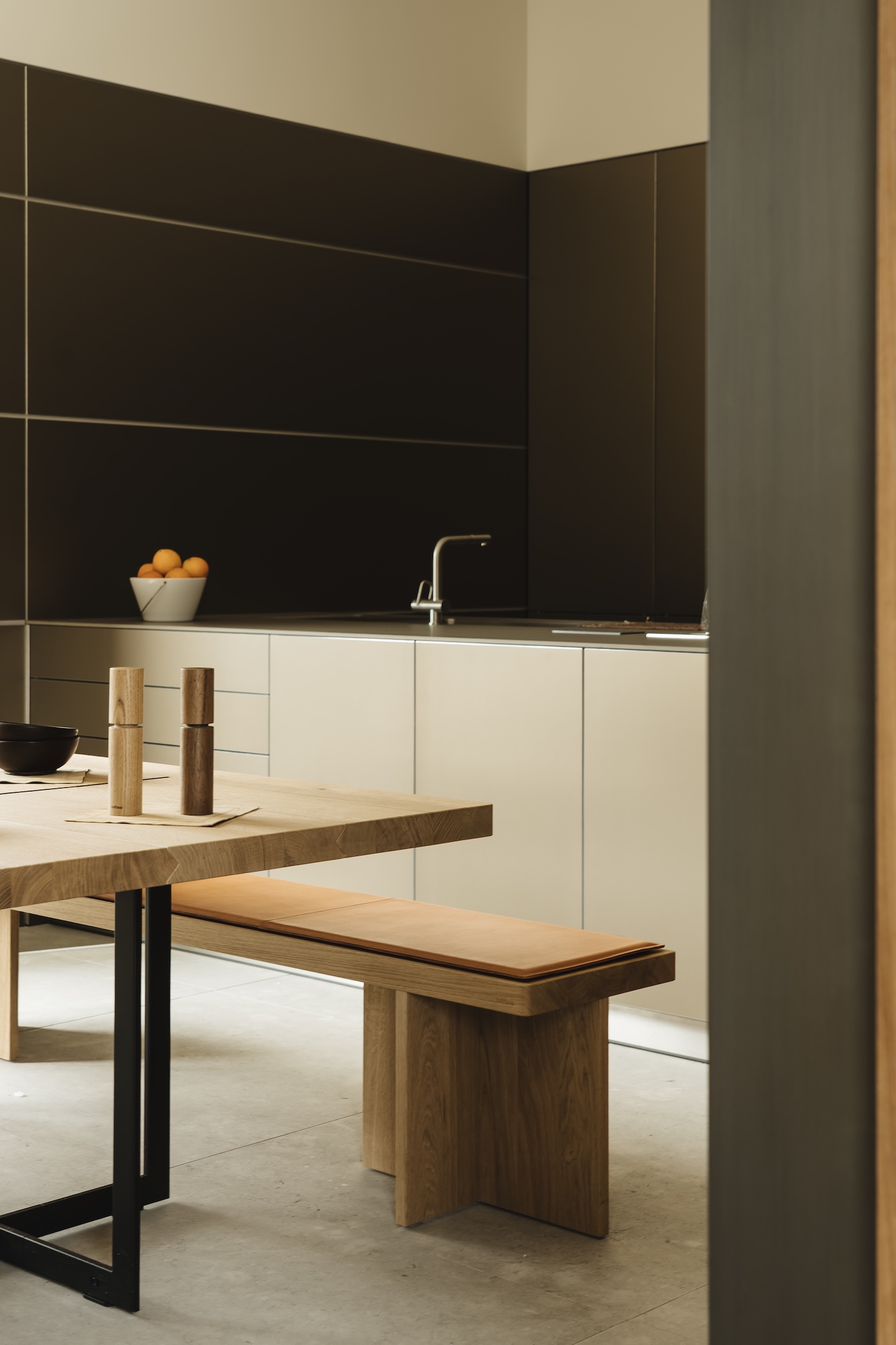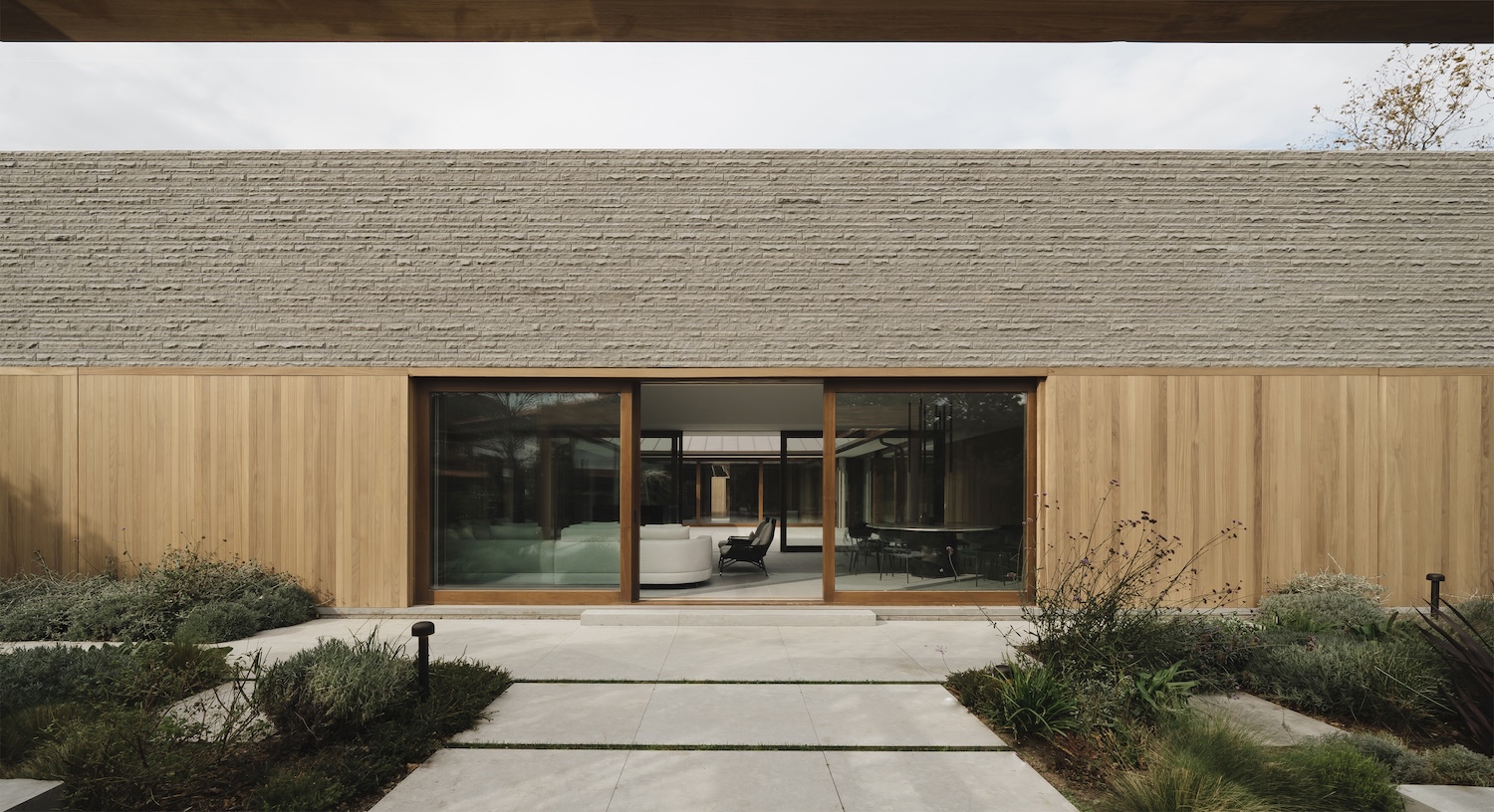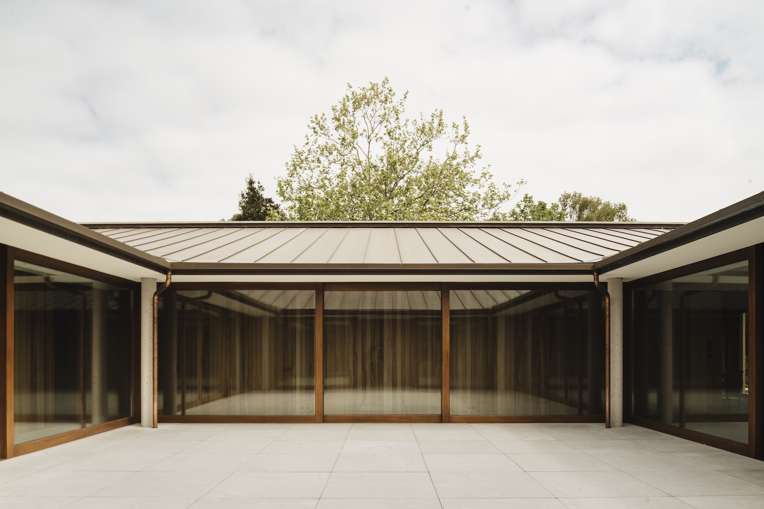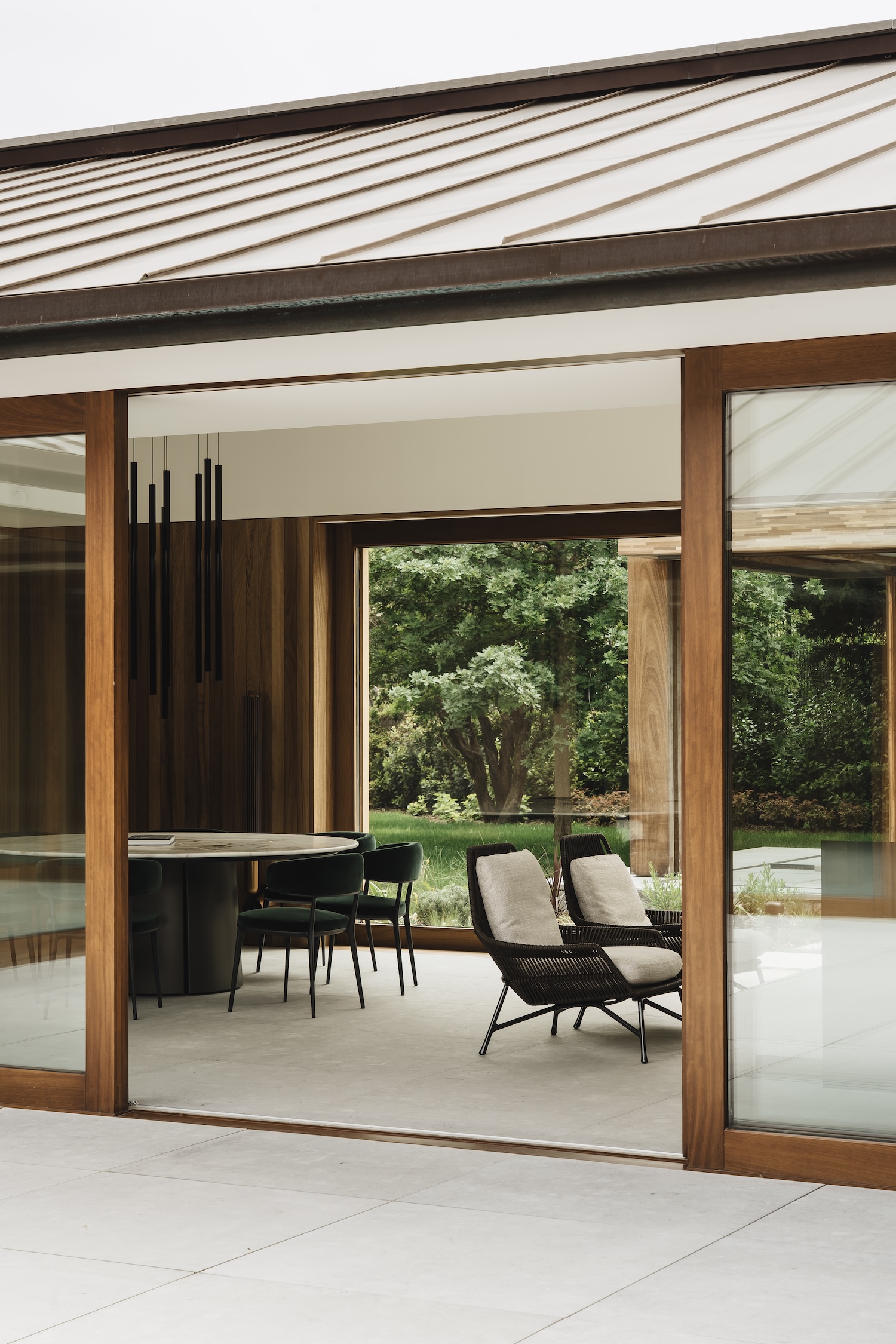 The courtyard operates as an inverted facade – where the street-facing walls remain largely closed, the interior perimeter dissolves into floor-to-ceiling glazing. This creates what the architects describe as facing rooms, where the entrance hall and living room confront each other across the void, multiplying perceived depth. The spatial logic follows historical patio house typologies from Mediterranean and Islamic architecture, where domestic life organizes around a protected outdoor room rather than relating primarily to the street.