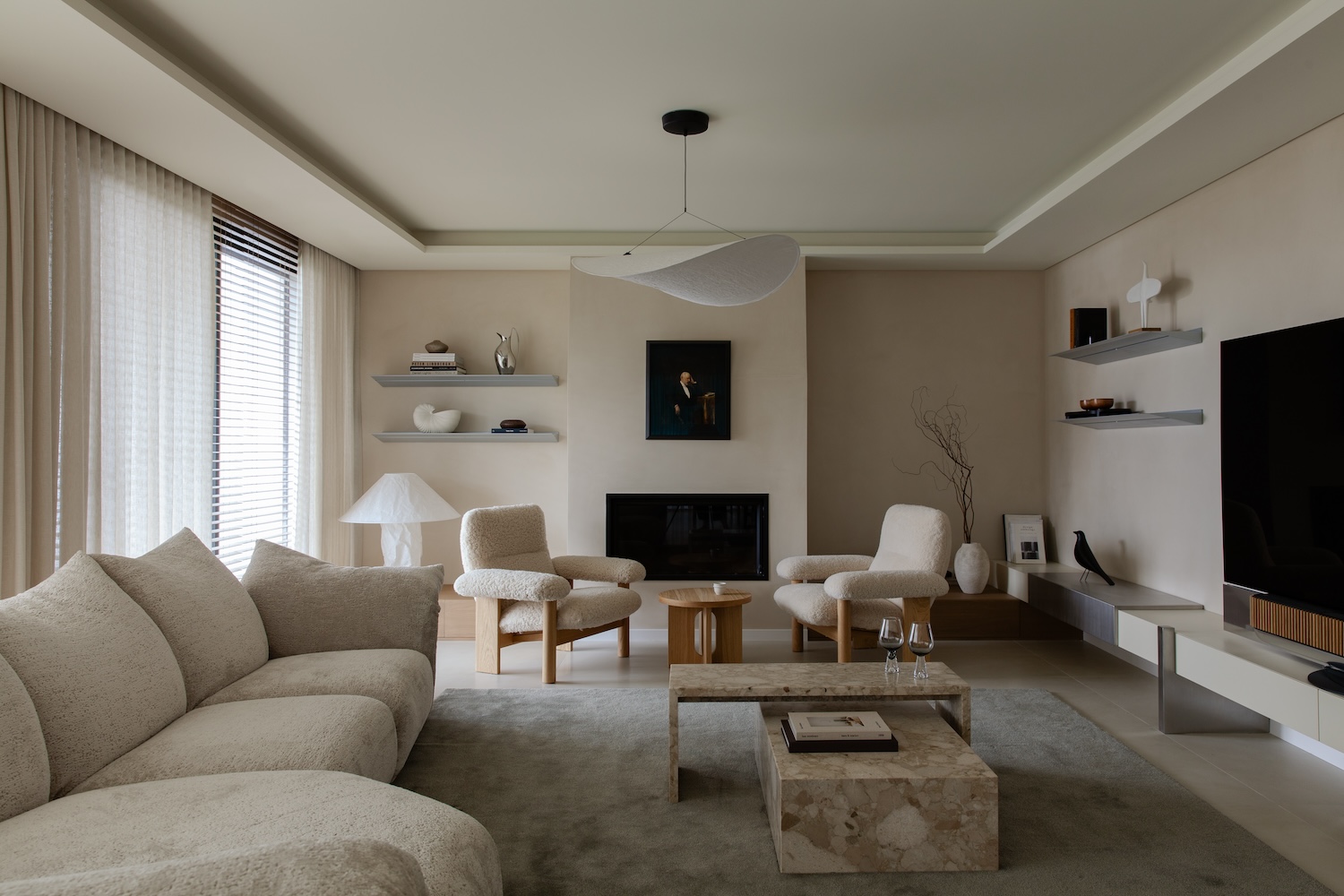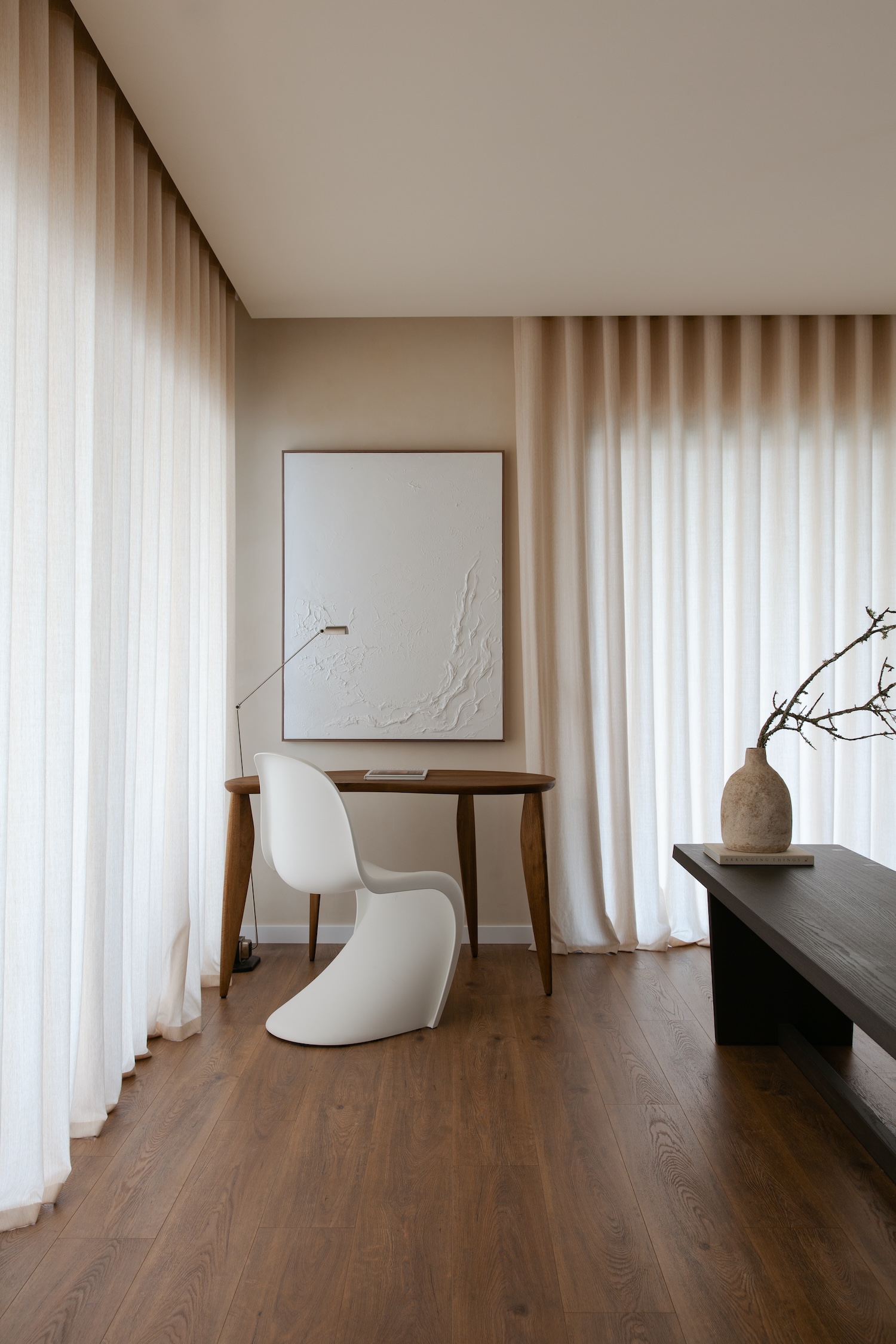 Cascais is a minimalist home located in Lisbon, Portugal, designed by Zoé Wolker. The clients, having recently emigrated to a new country, sought a home that would ease their transition and provide a sense of warmth, comfort, and safety. They placed complete trust in the designer’s vision, emphasizing their desire for a space that felt like home. Central to the design was a portrait of the composer Tchaikovsky, prominently displayed above the fireplace in the main living room. This piece became the focal point of the space, infusing the home with a musical ambiance that resonated deeply with the family, particularly as the children were growing up surrounded by Tchaikovsky’s works. The interior design avoided pure white colors, opting instead for roughly plastered walls, textured fabrics, and abundant use of wood. Portuguese-inspired accents in terracotta, nude, and sea tones added subtle bursts of color throughout the space. Attention to detail was paramount, with each element carefully chosen to reflect the owners’ tastes and the narrative of the home.