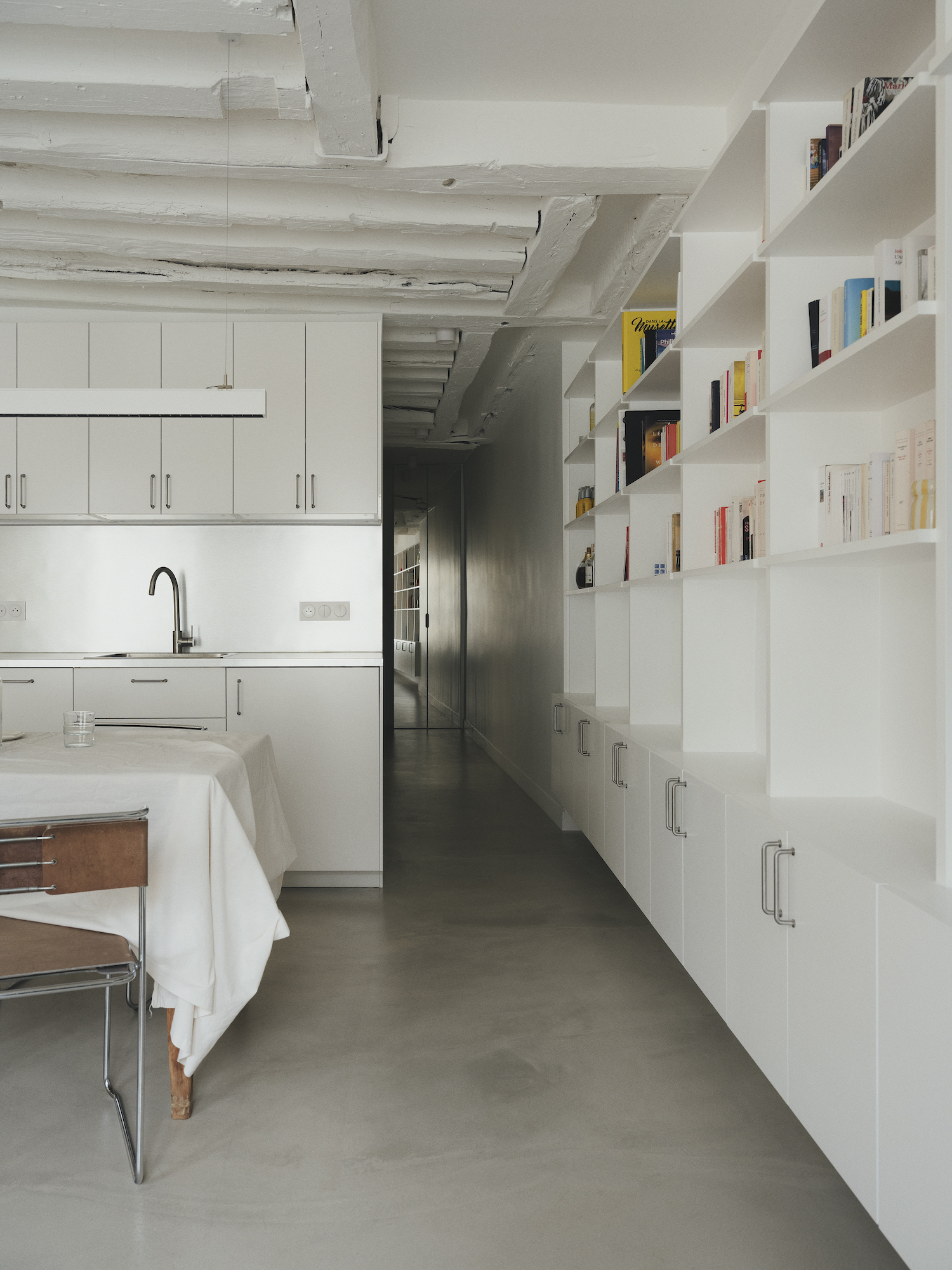 Meanwhile, materiality plays a central role in shaping the space. Exposed wooden beams contrast with clean, modern cabinetry and horizontal planes. A sanded and varnished screed floor adds a subtle texture, reflecting light and enhancing the apartment’s brightness. The palette remains largely white, allowing these raw elements to stand out, while metal accents appear in furniture details such as chairs, coffee table legs, and cabinetry handles.