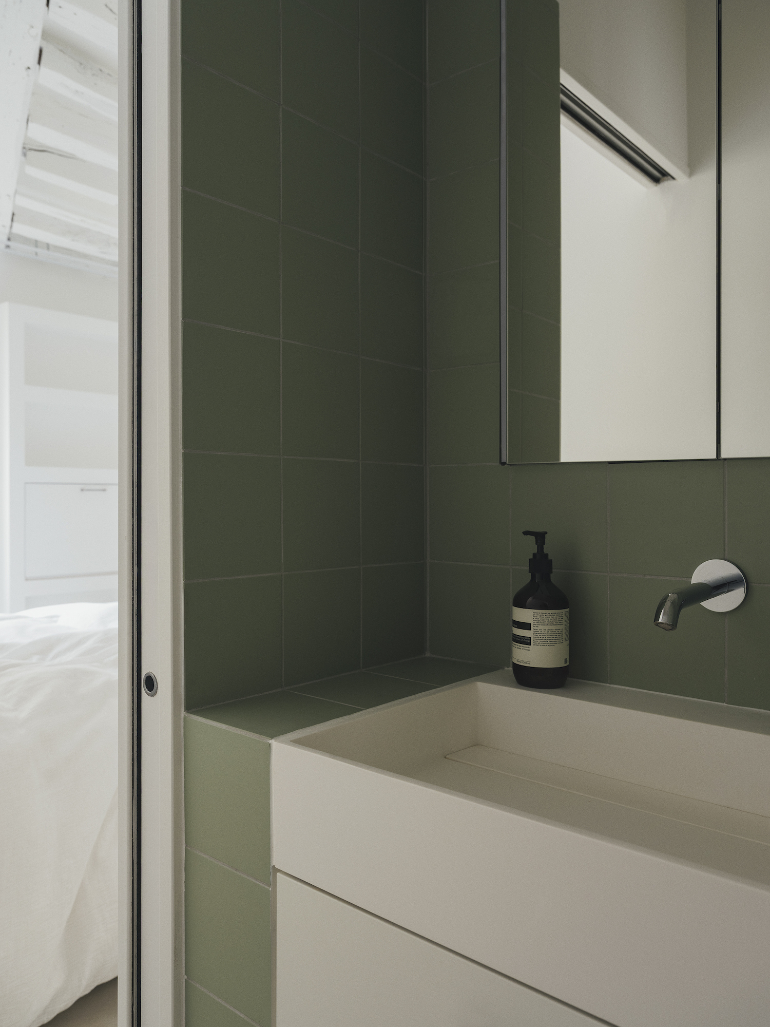 Moments of color are introduced sparingly, with a yellow sofa in the living area and green tiles in the bathroom, bringing warmth and character to the otherwise restrained interior. Together, these elements create a space that feels both minimal and expressive, reflecting PS Studio’s approach to design, where material honesty and thoughtful planning come together to create spaces that are functional and atmospheric.