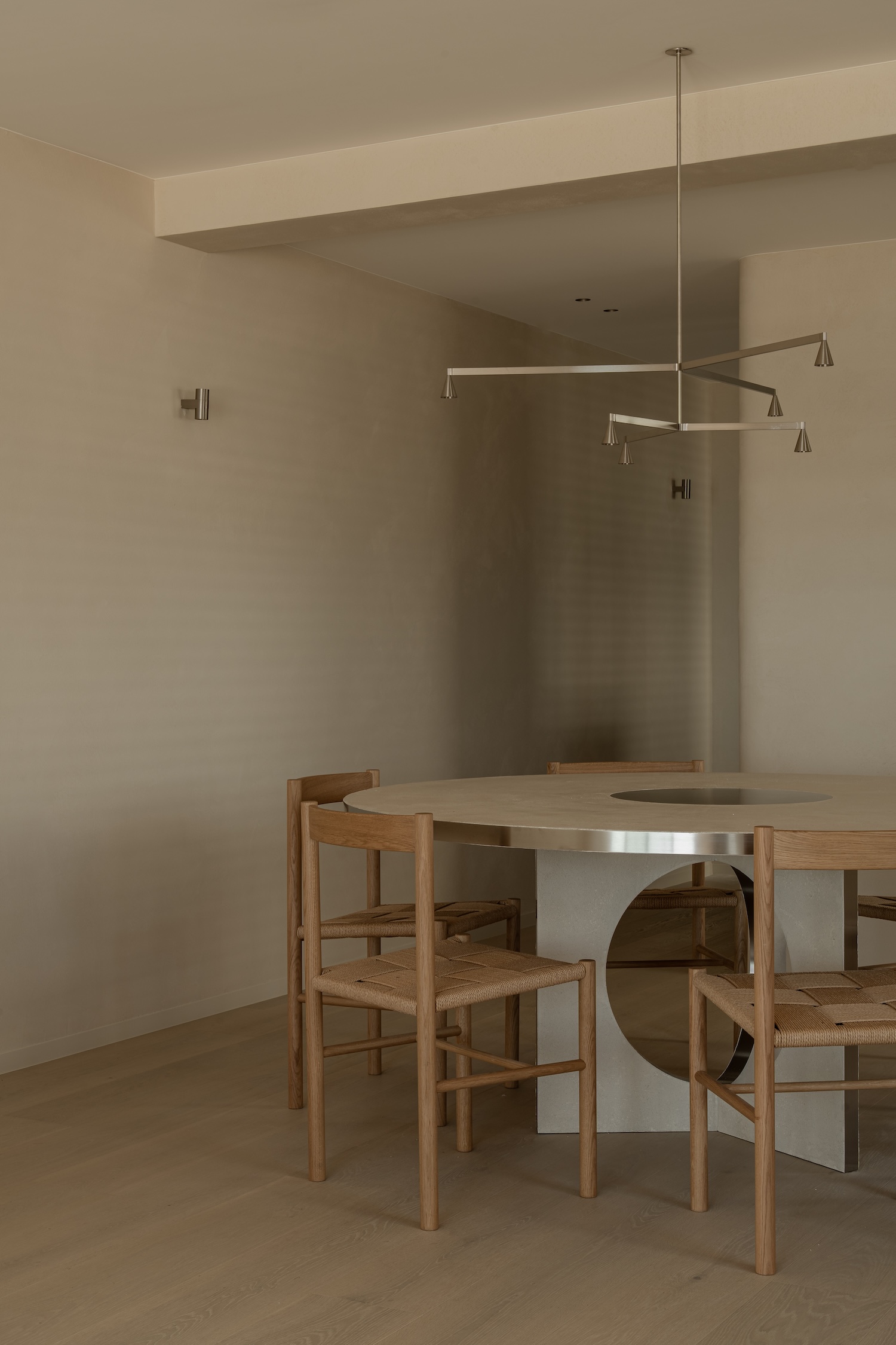The bespoke dining table stands as the project’s material manifesto. Its brushed stainless steel edge creates a horizon line between the industrial precision of its metal boundary and the gestural freedom of its hand-painted surface. This is furniture as landscape – simultaneously functional object and spatial organizer, its proportions calibrated to the room’s curved rhythms while maintaining the intimate scale necessary for daily ritual.