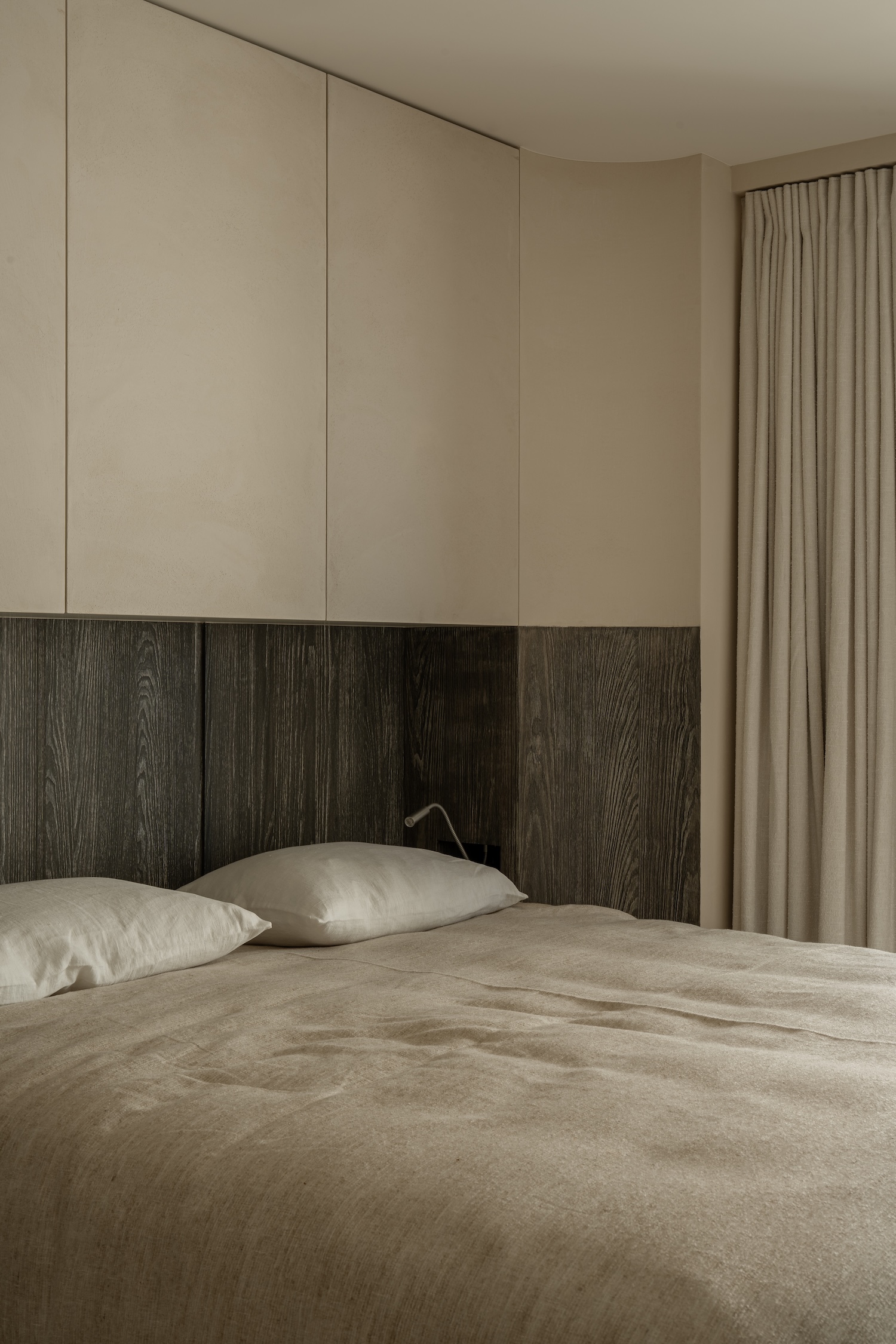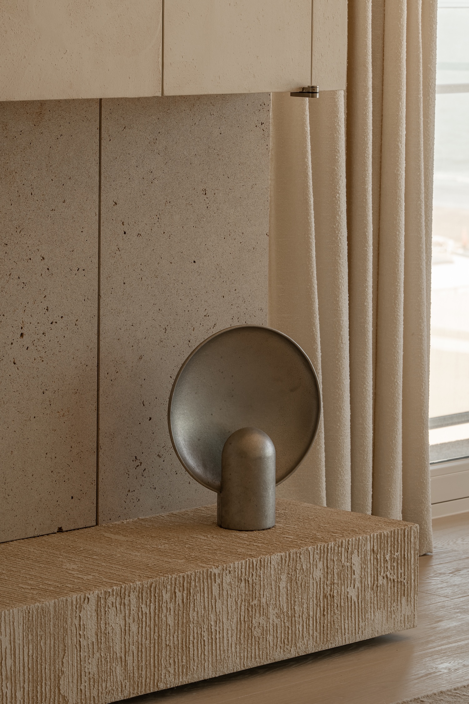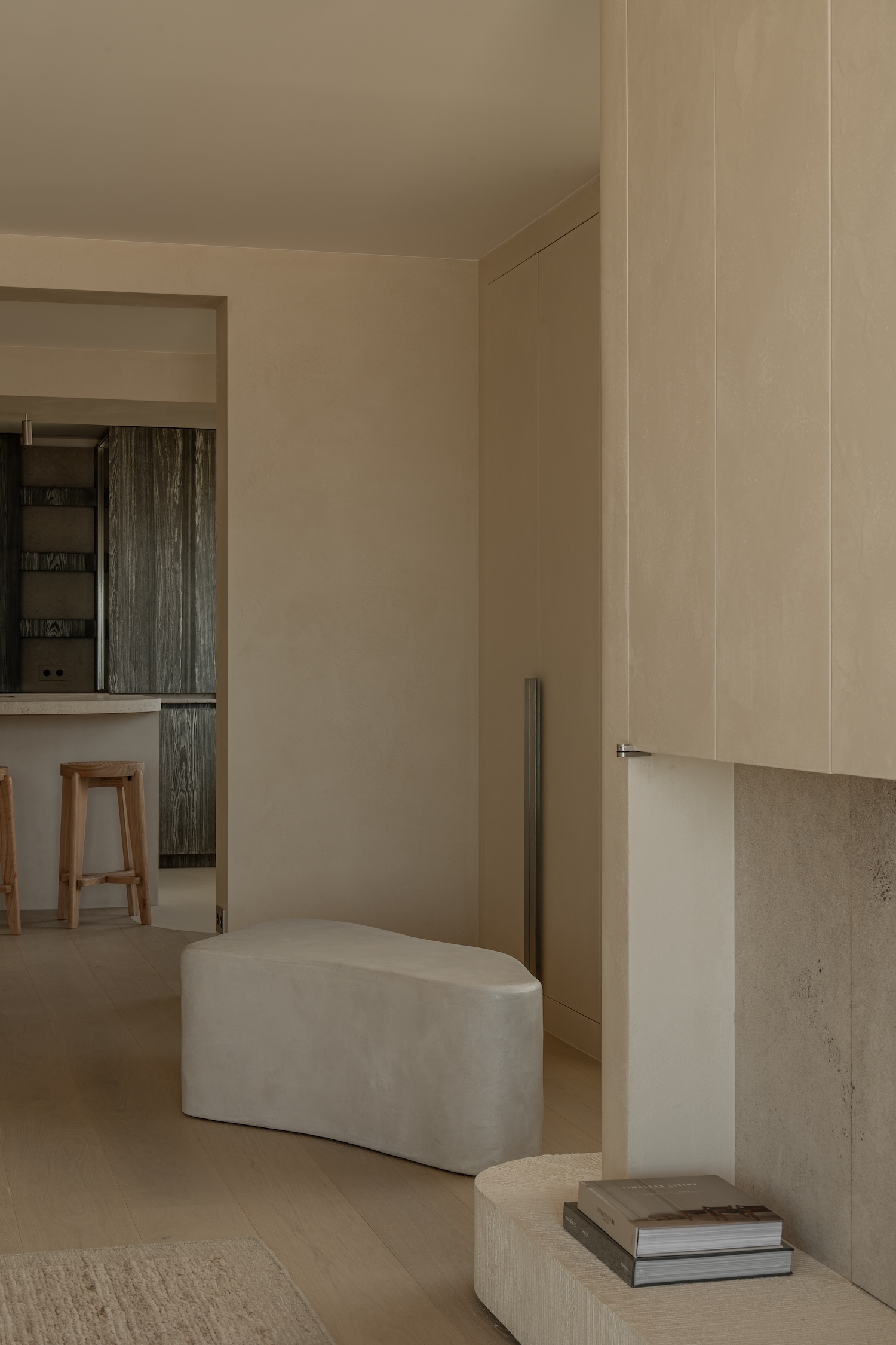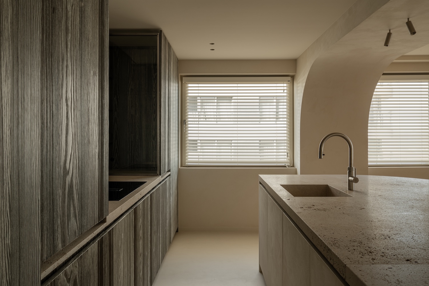 The material palette speaks to this same philosophy of considered restraint. Sandblasted and hand-brushed larch wood carries the memory of its making in every grain line, the soft patina achieved through patient labor rather than artificial aging. Against this warm timber, travertine surfaces emerge with their characteristic cloudiness, stone that holds light rather than reflecting it sharply. The poured floors follow the arcs of the architecture like frozen water, their seamless curves eliminating the harsh geometry that might otherwise fragment the space.